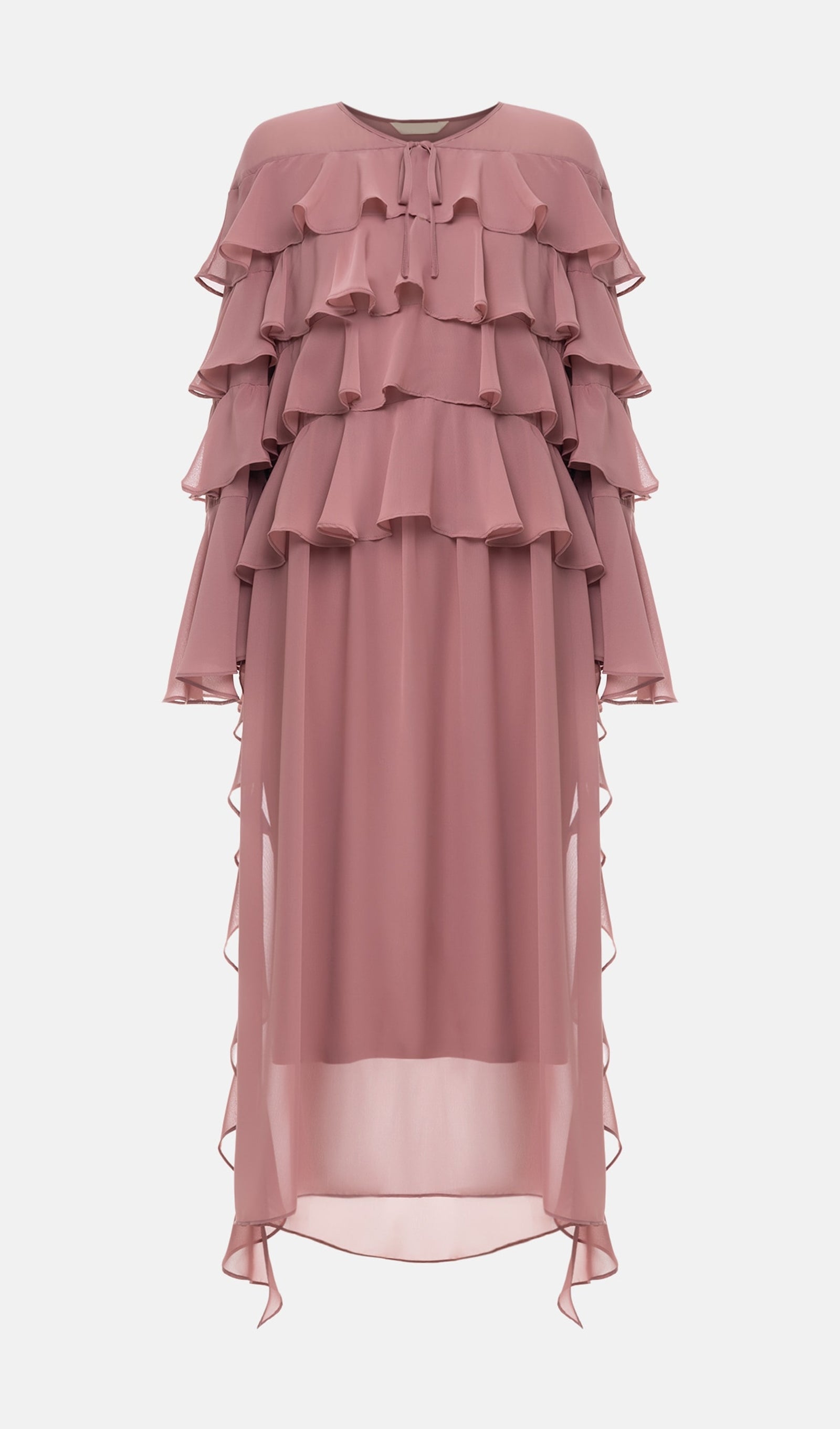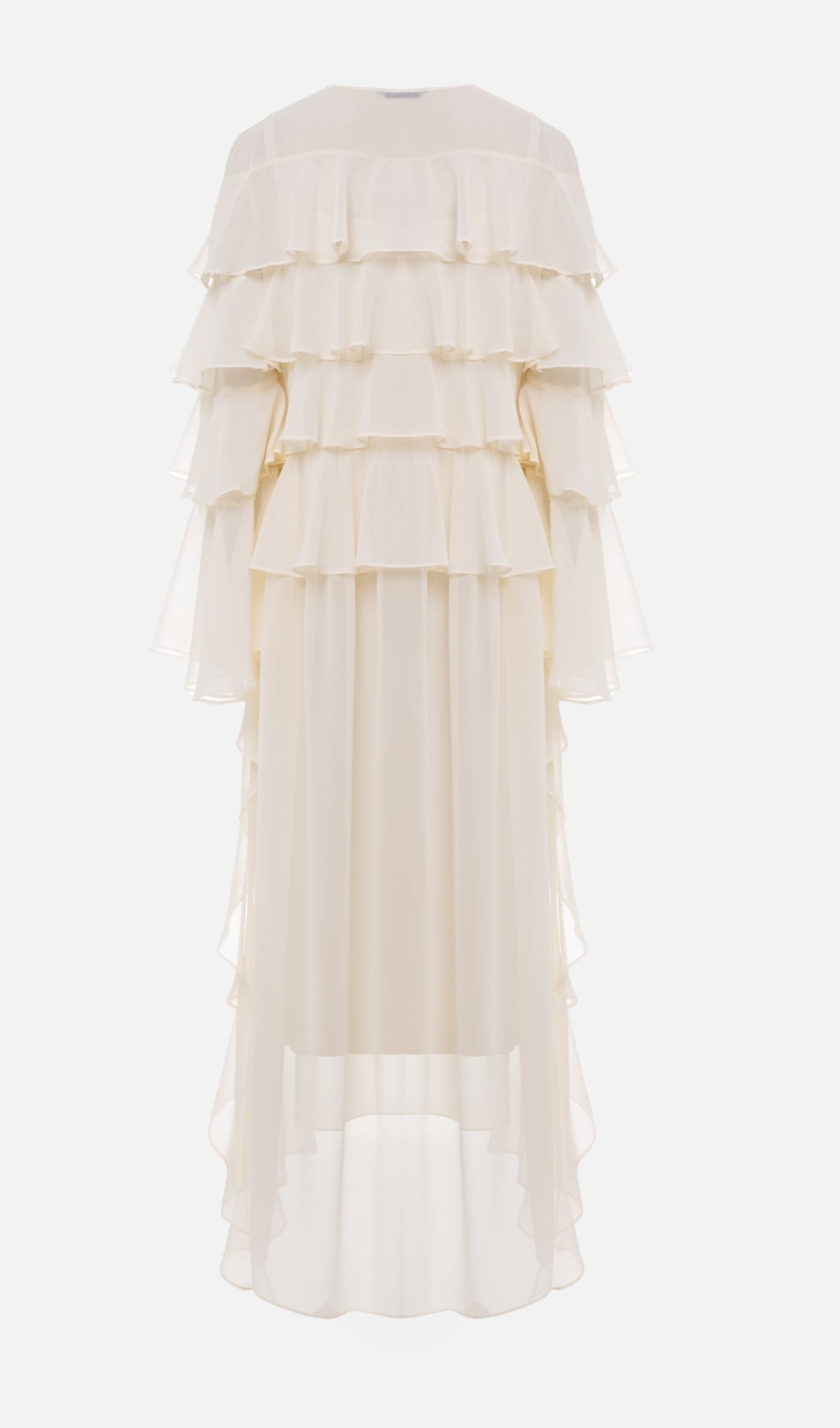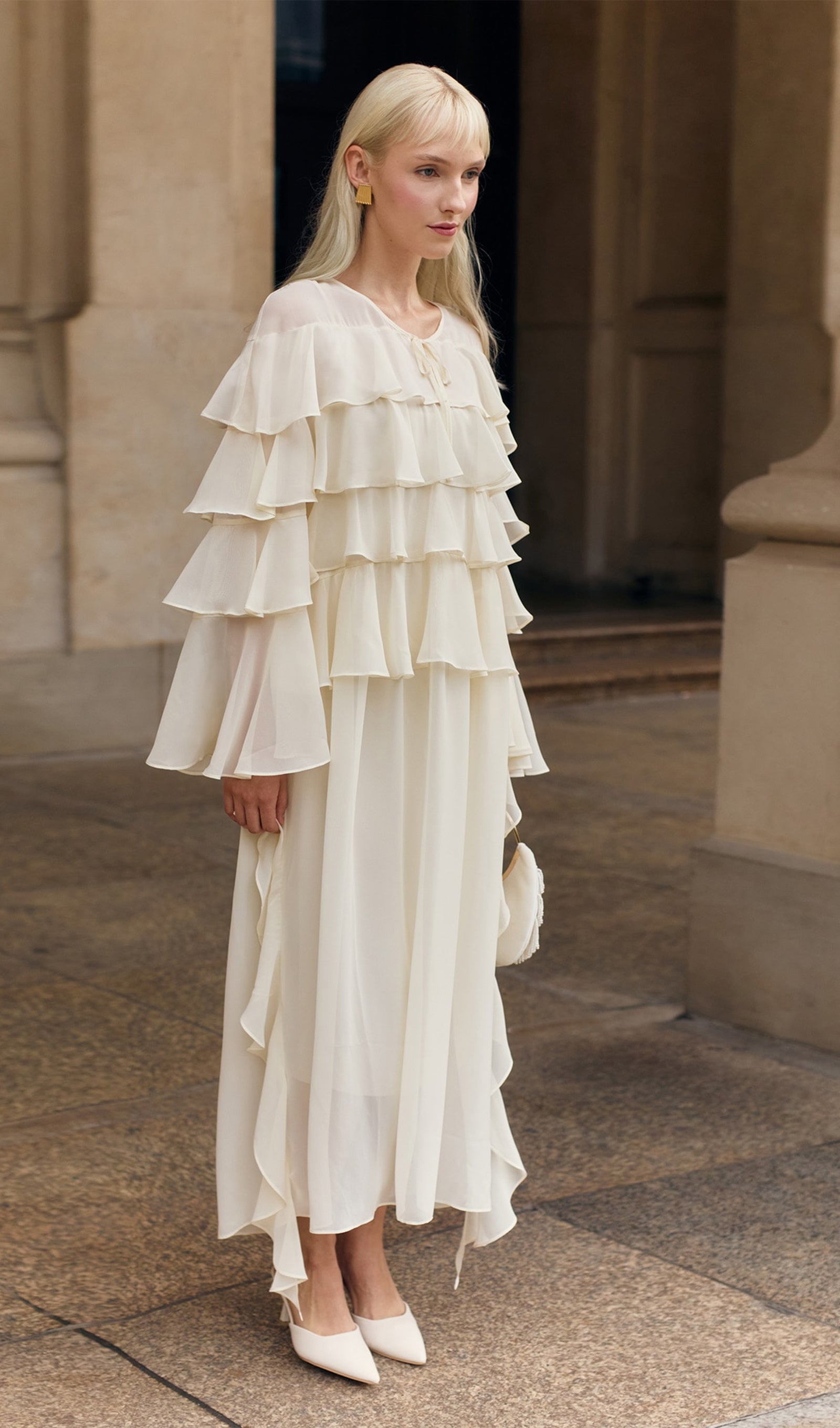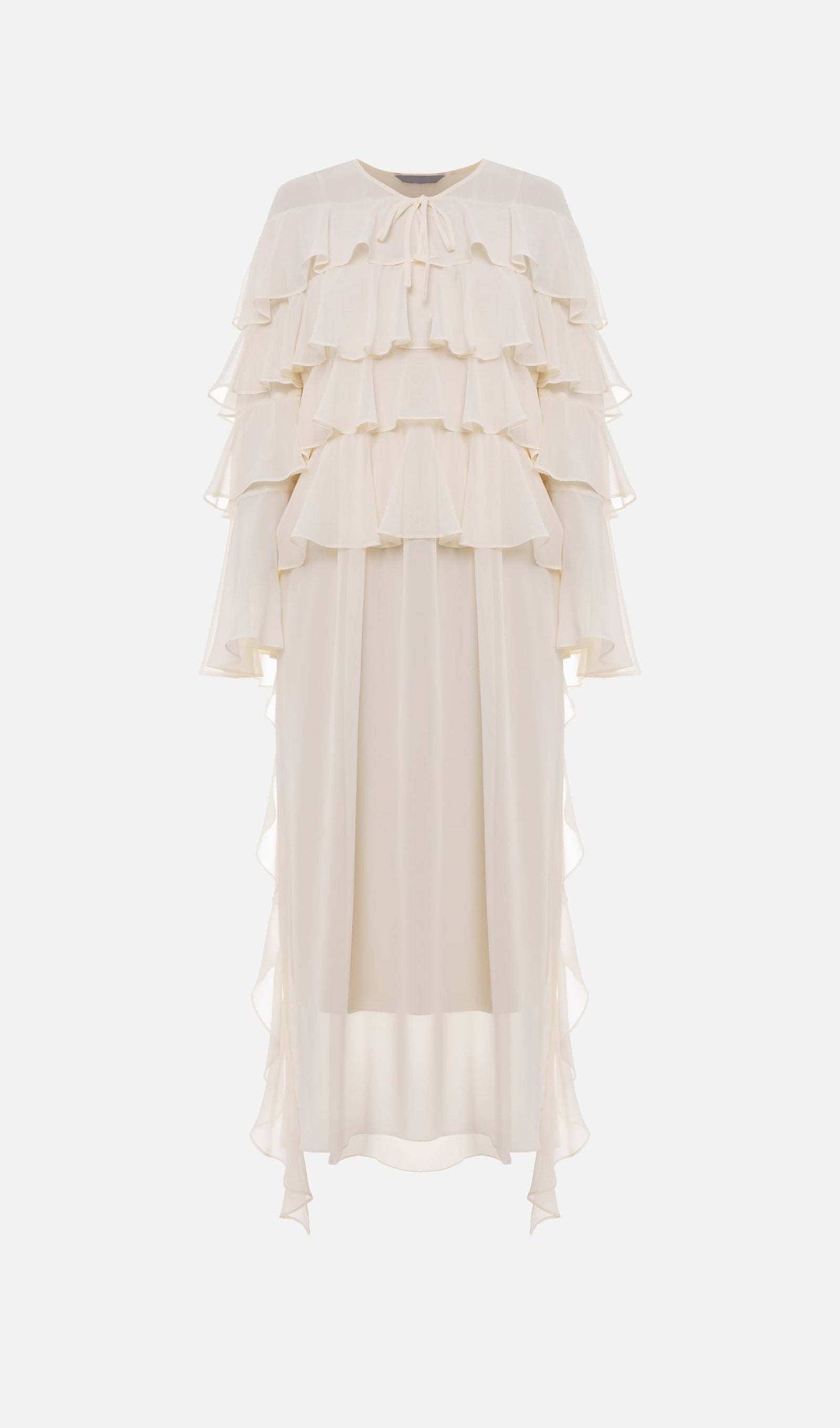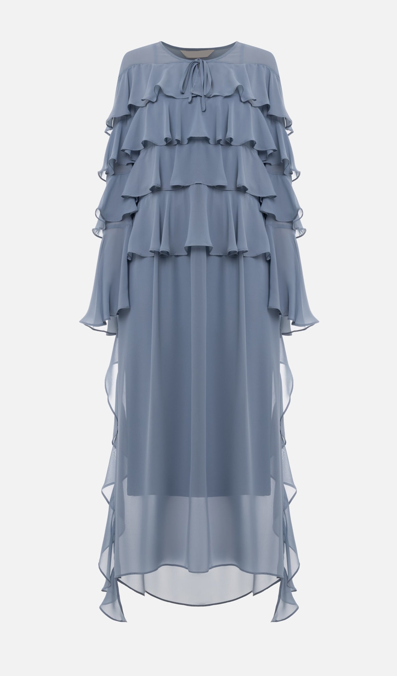 Lightweight maxi A-silhouette dress with a neat oval neckline, complemented with tonal ties, voluminous flared sleeves and a straight skirt. The dress is made from semi-transparent chiffon and has lush ruffles on the bodice and sides of the skirt.