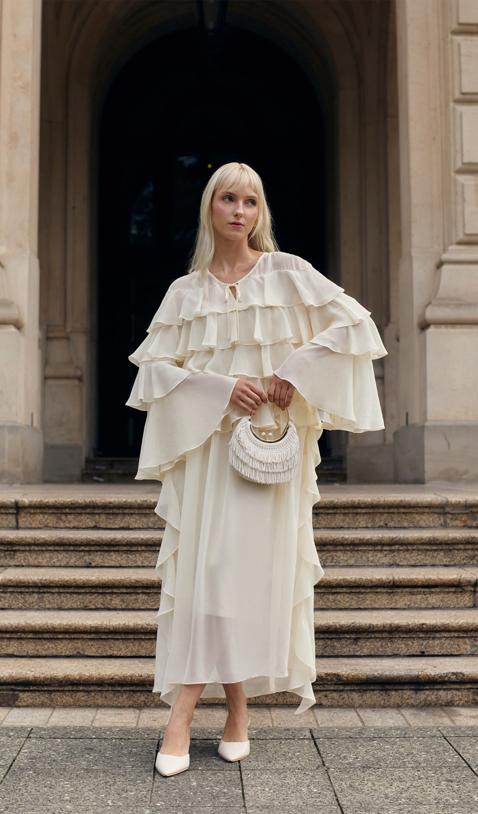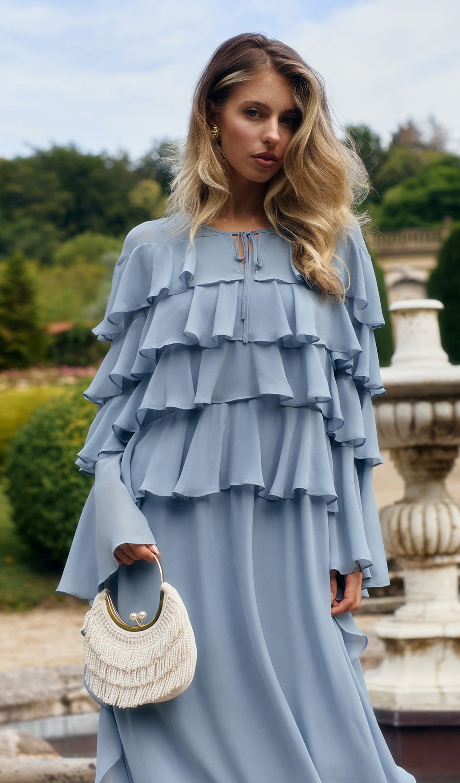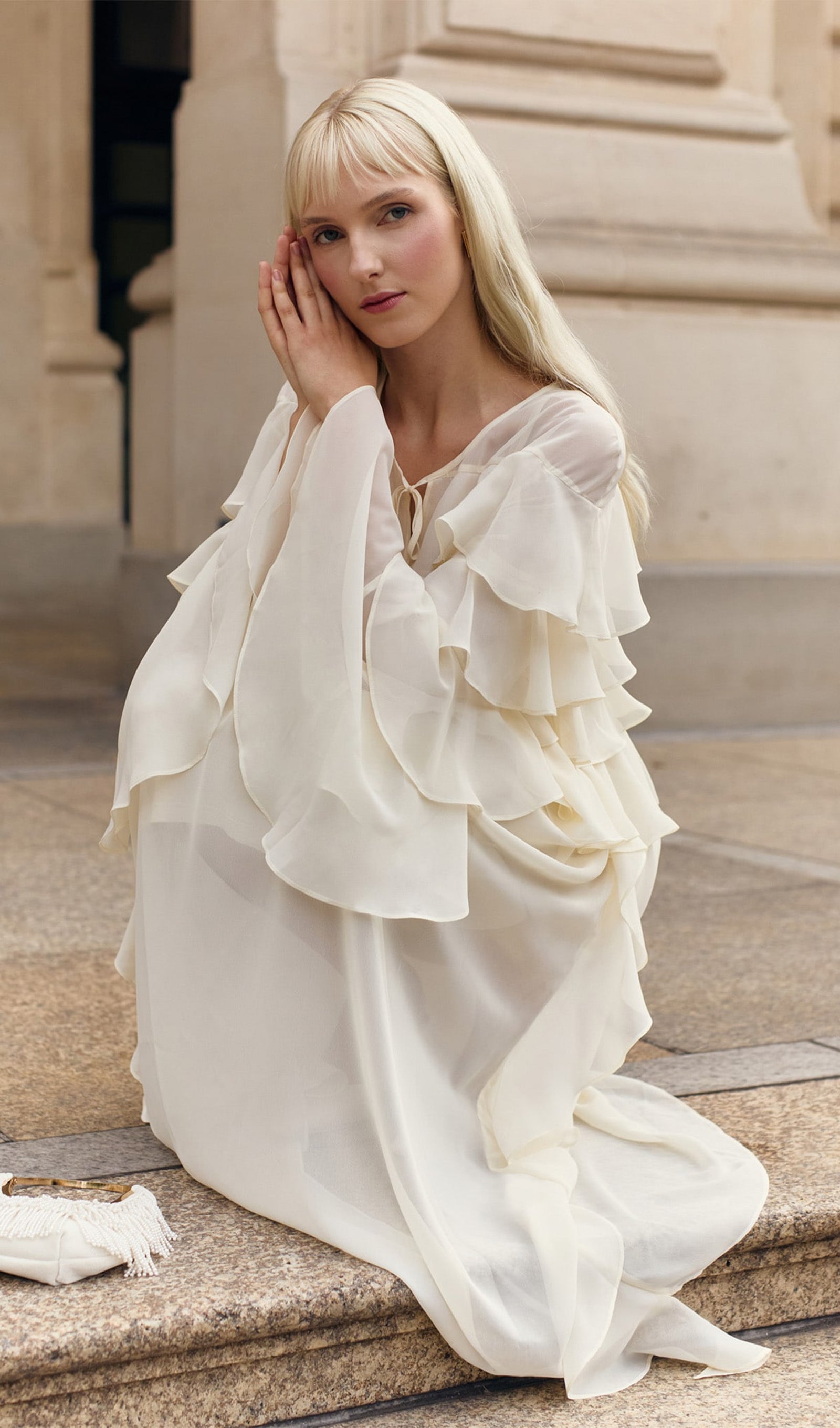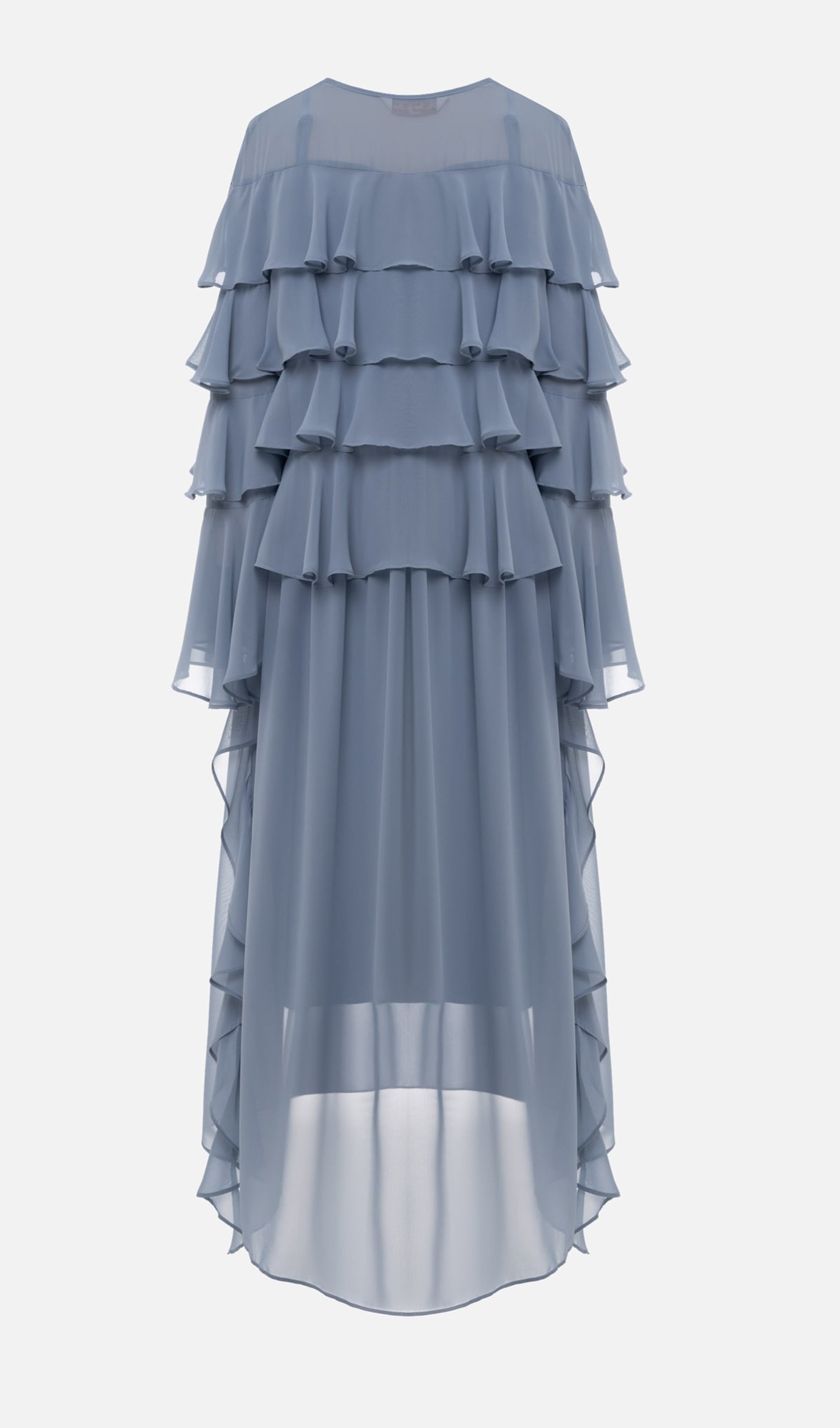 Lightweight maxi A-silhouette dress with a neat oval neckline, complemented with tonal ties, voluminous flared sleeves and a straight skirt. The dress is made from semi-transparent chiffon and has lush ruffles on the bodice and sides of the skirt.