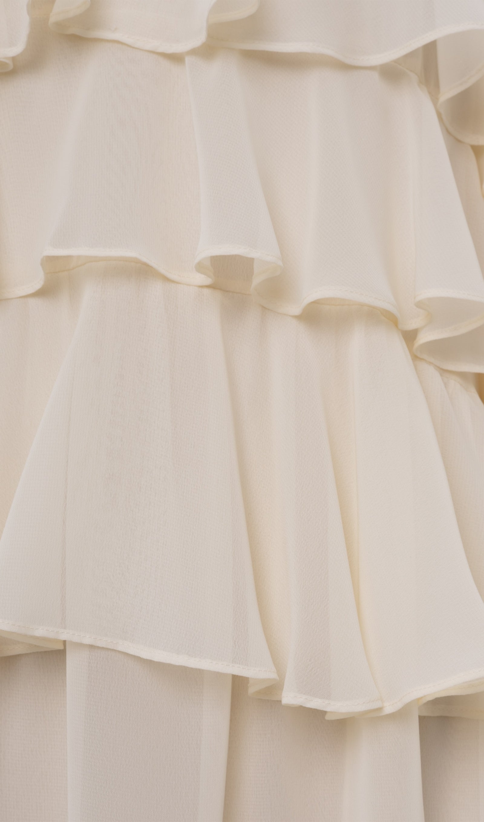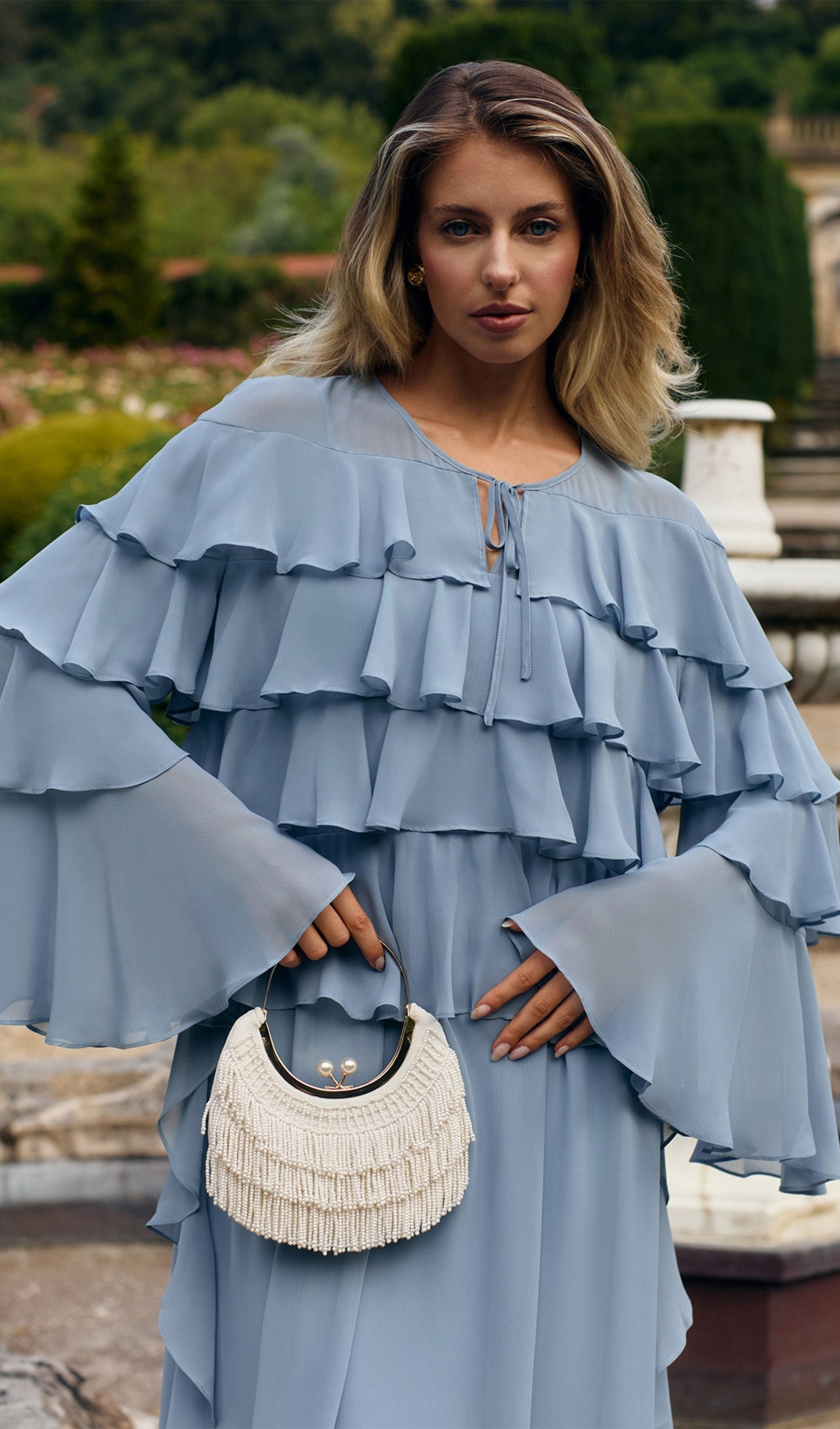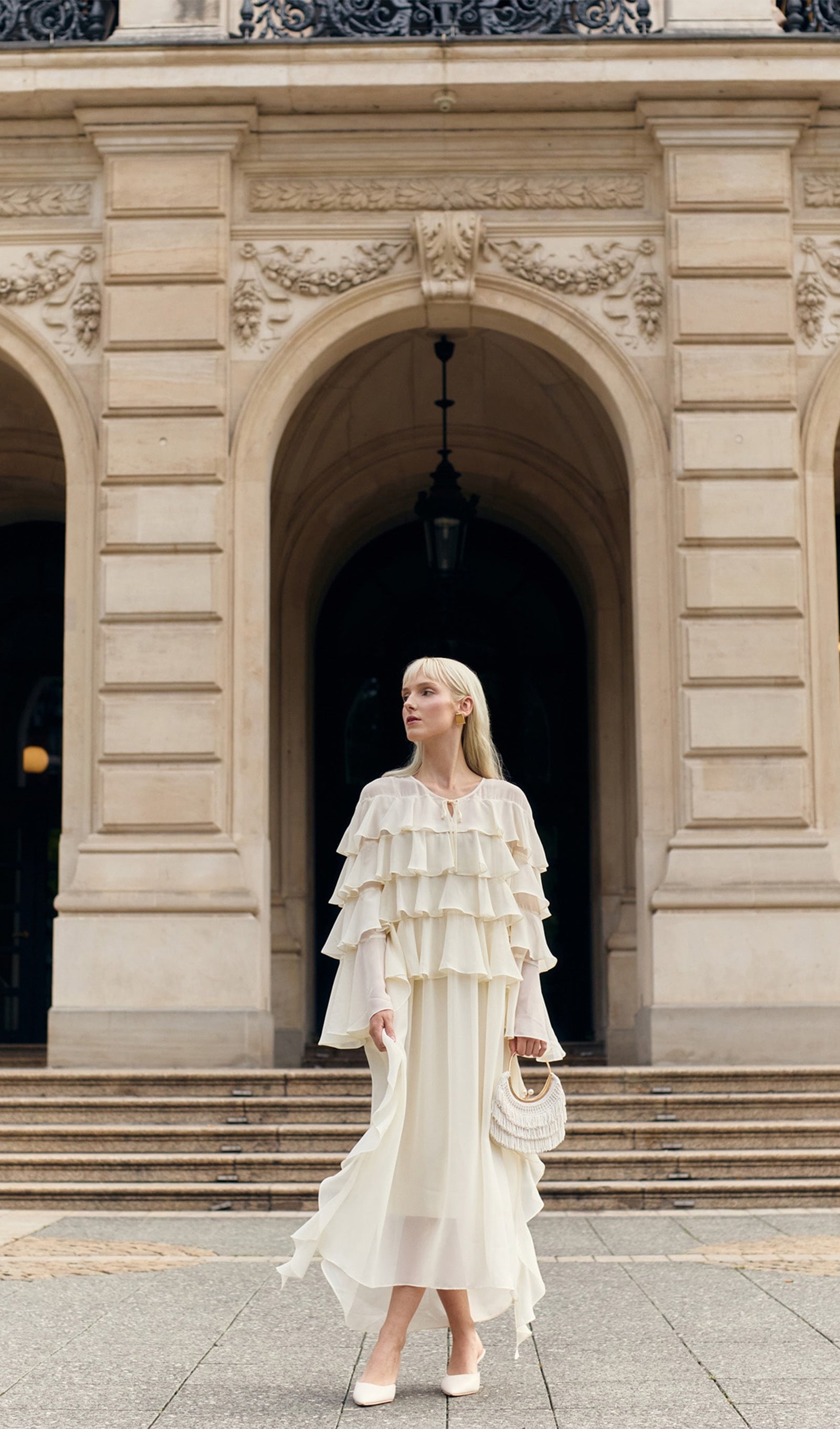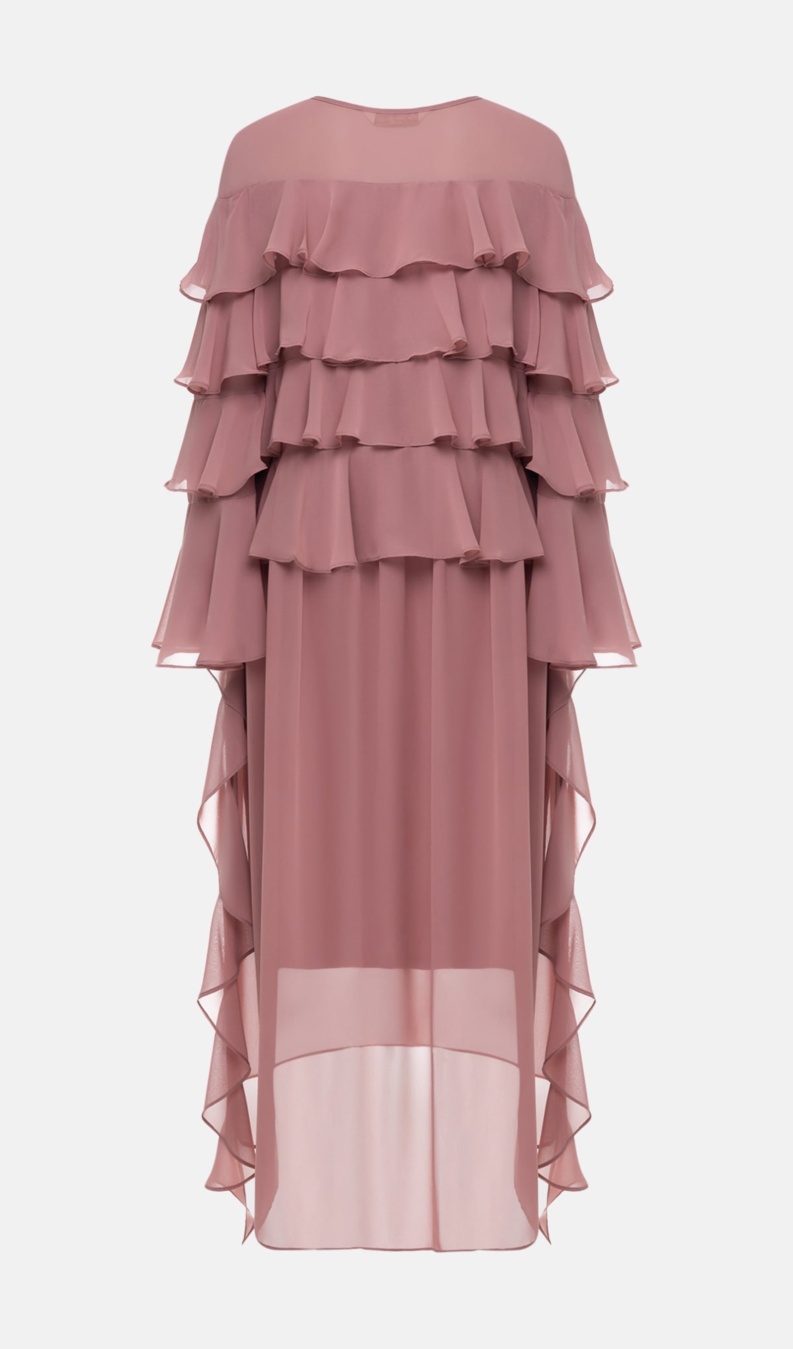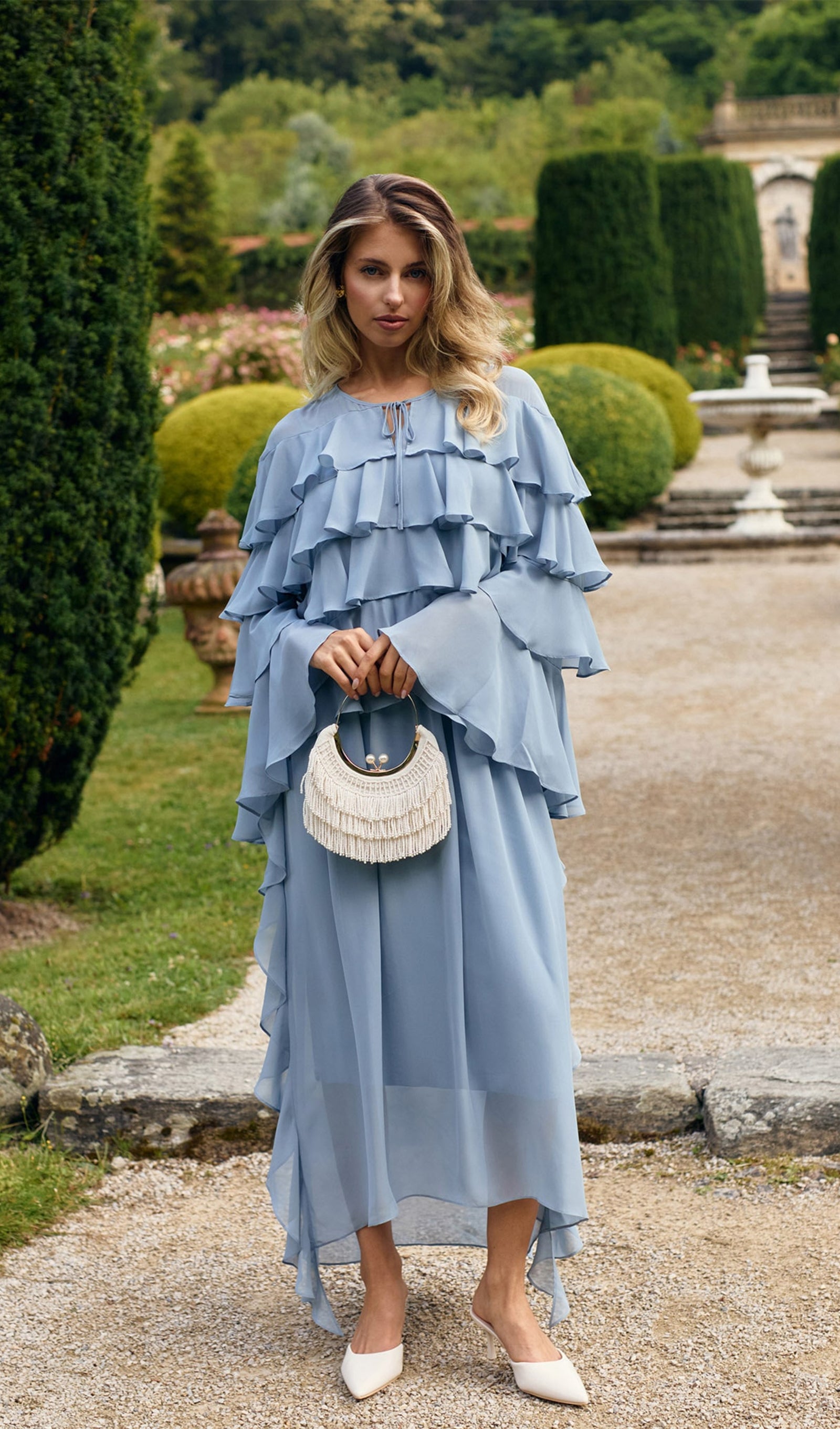 Lightweight maxi A-silhouette dress with a neat oval neckline, complemented with tonal ties, voluminous flared sleeves and a straight skirt. The dress is made from semi-transparent chiffon and has lush ruffles on the bodice and sides of the skirt.