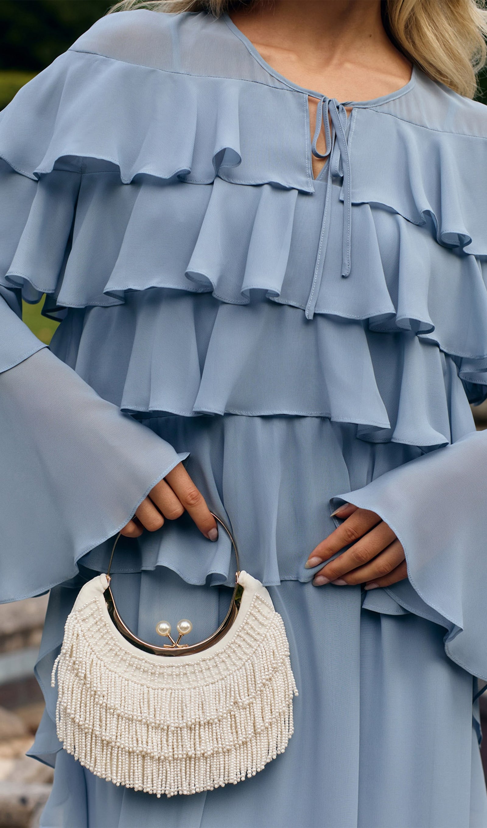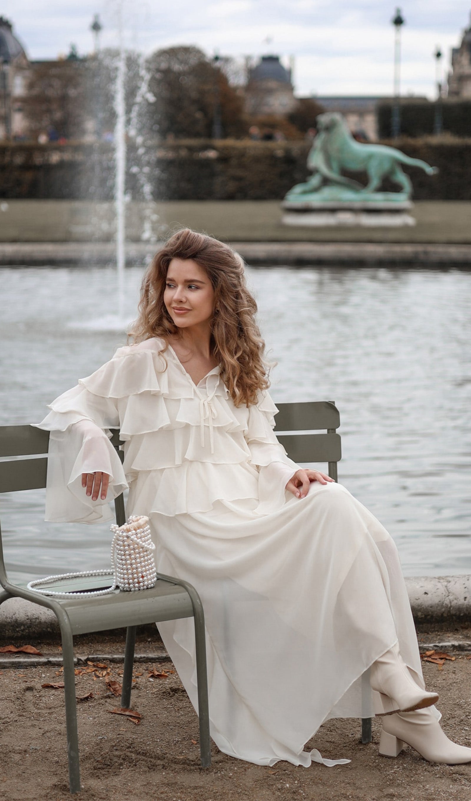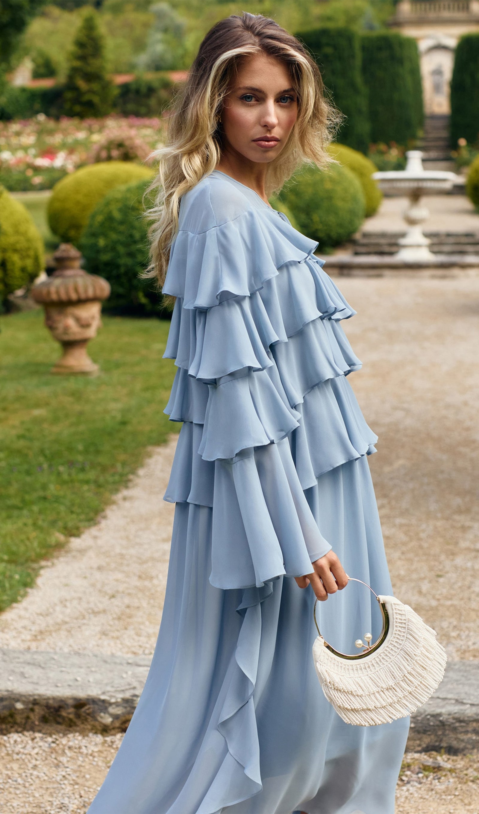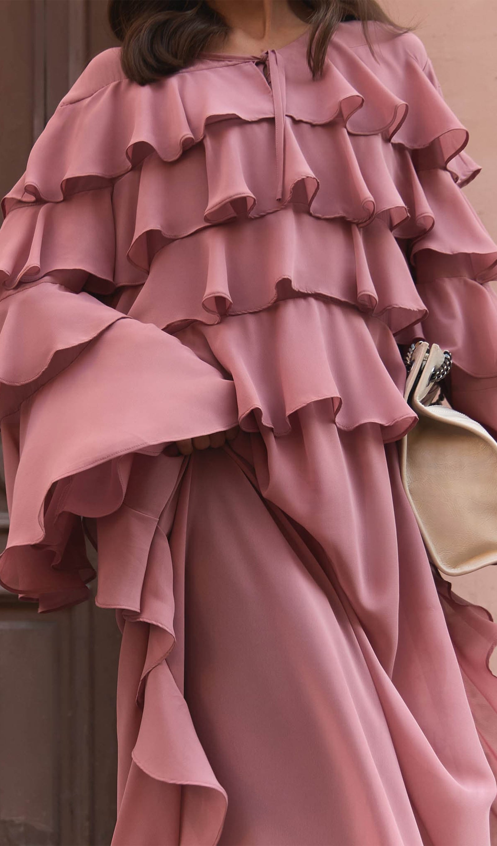 Lightweight maxi A-silhouette dress with a neat oval neckline, complemented with tonal ties, voluminous flared sleeves and a straight skirt. The dress is made from semi-transparent chiffon and has lush ruffles on the bodice and sides of the skirt.