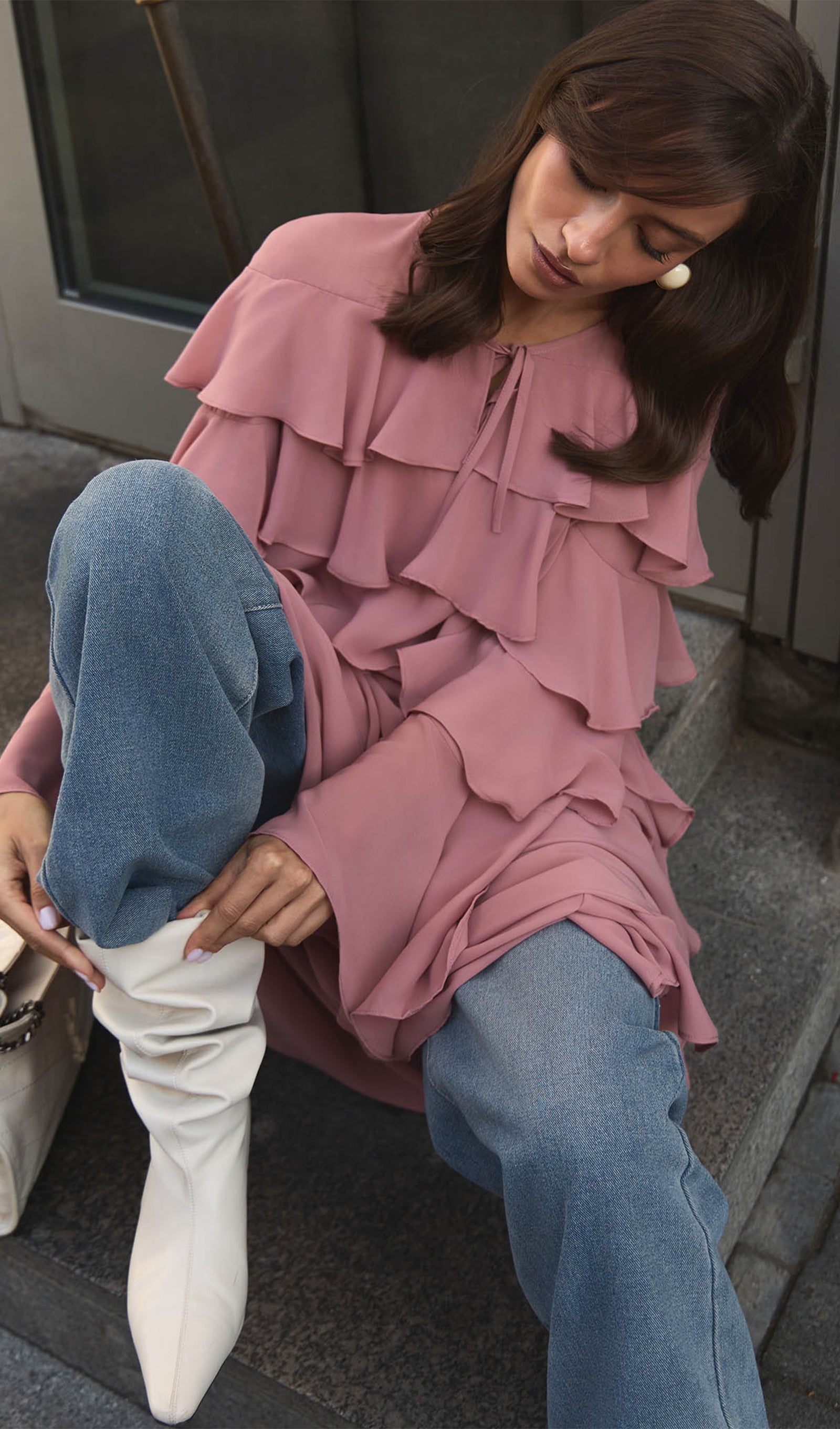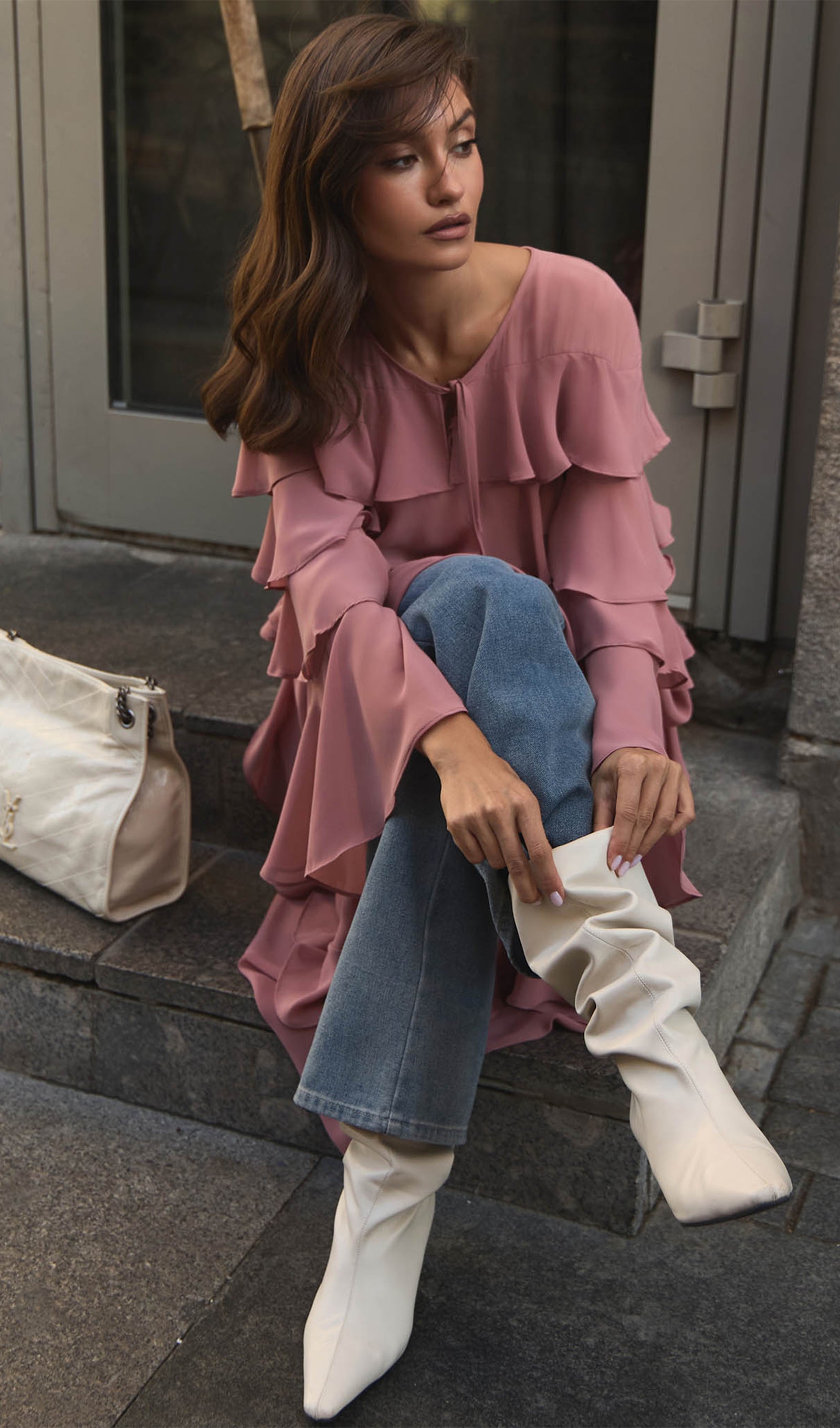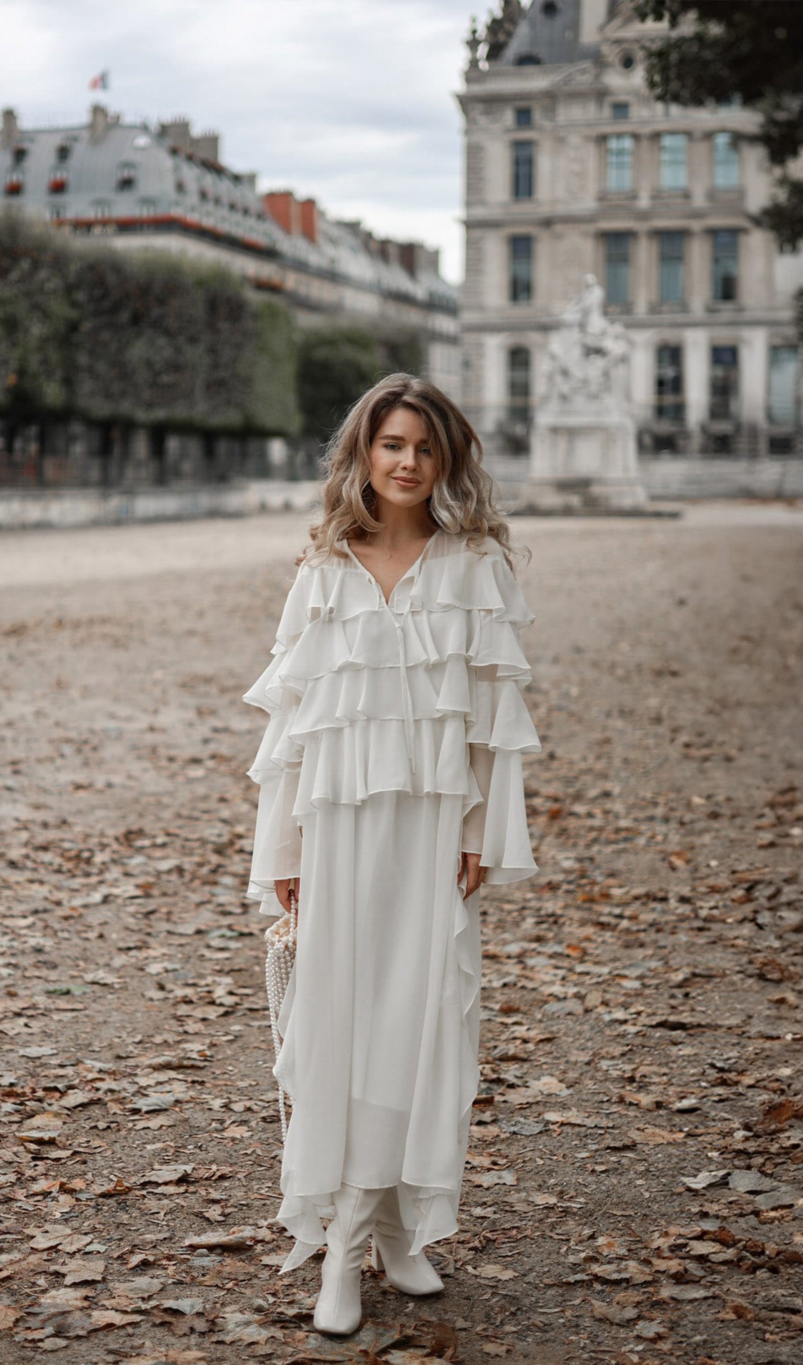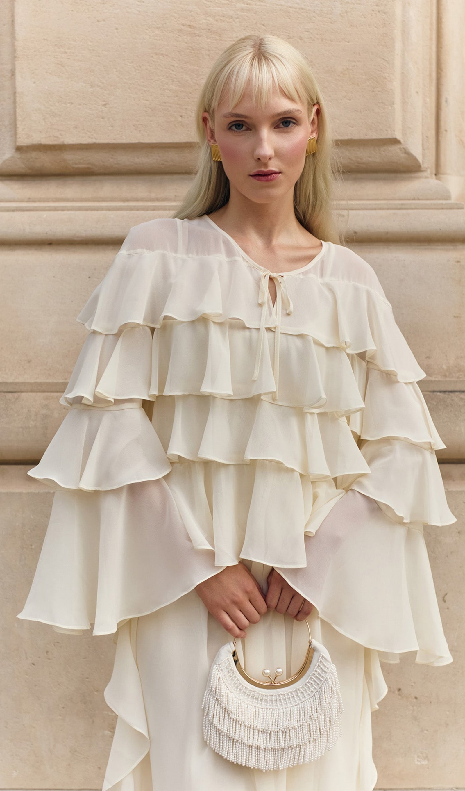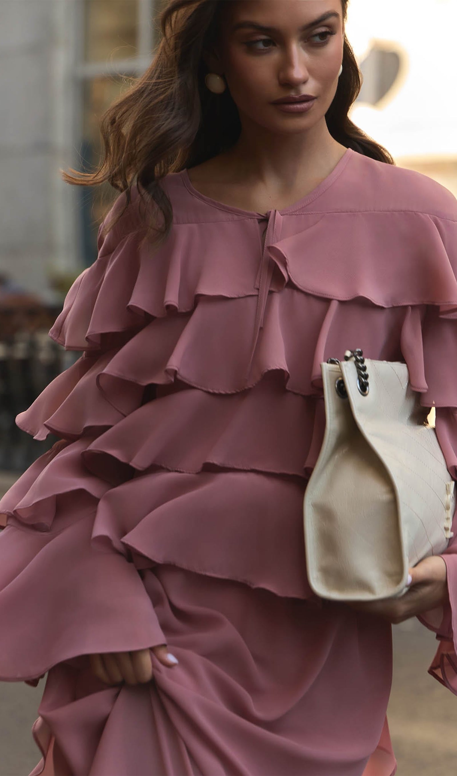 Lightweight maxi A-silhouette dress with a neat oval neckline, complemented with tonal ties, voluminous flared sleeves and a straight skirt. The dress is made from semi-transparent chiffon and has lush ruffles on the bodice and sides of the skirt.