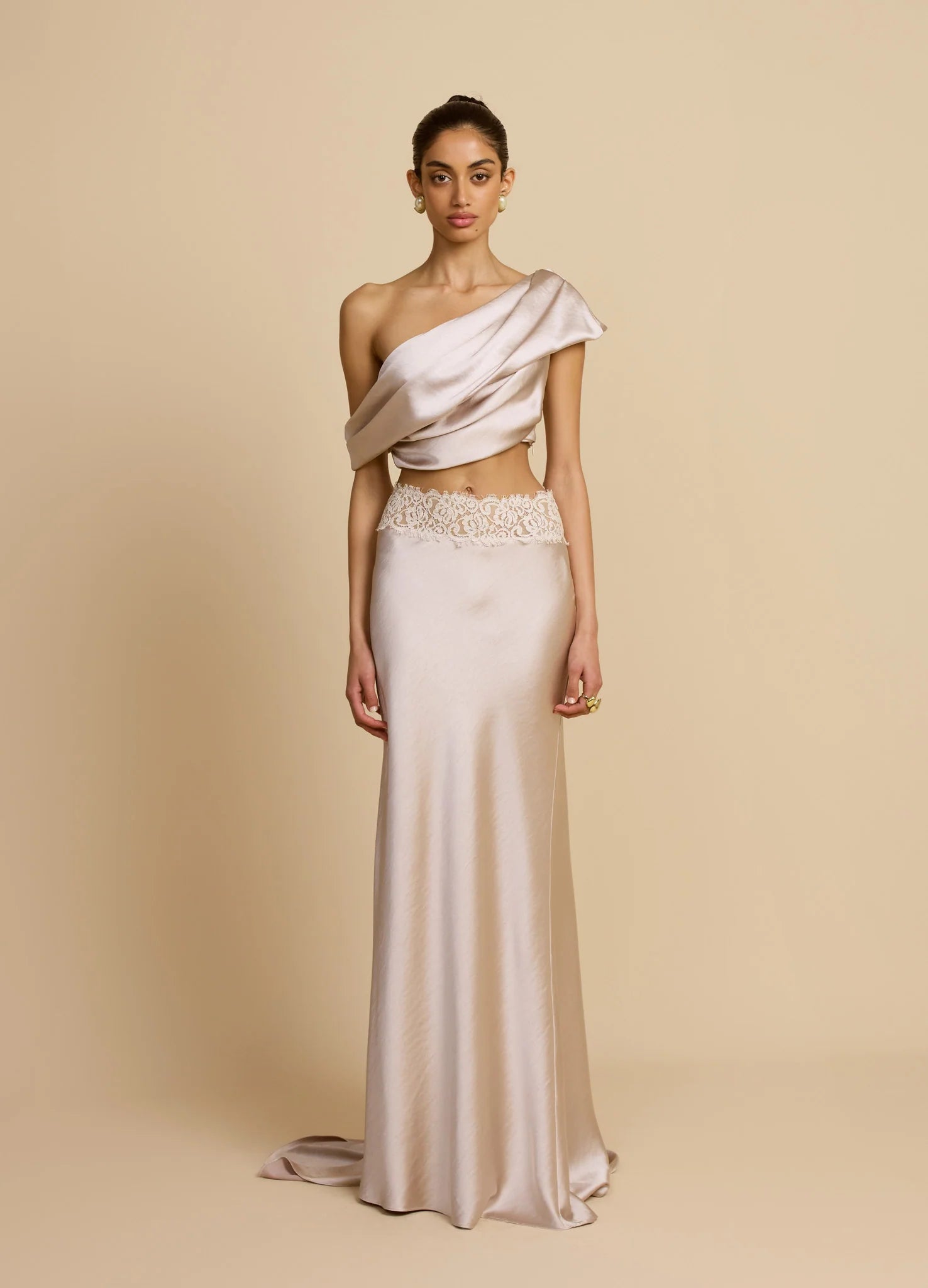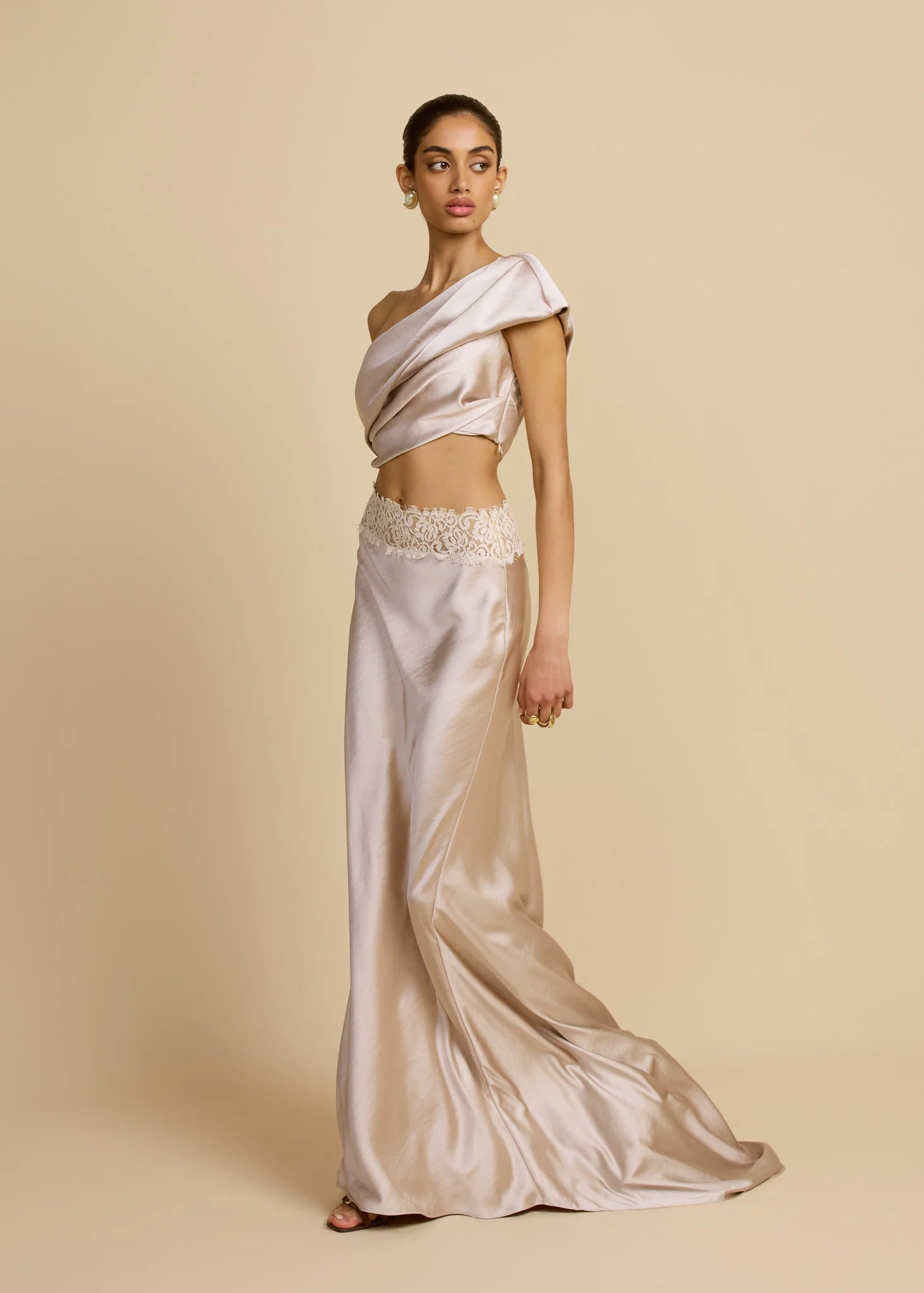 Introducing this skirt, a floor length bias cut silhouette made in in an iridescent oyster hue. Featuring a vintage inspired lace trim and an exaggerated draped back train, she is a seamless balance of elegance and vintage charm. Complete the set with our top for a captivating and refined finish.