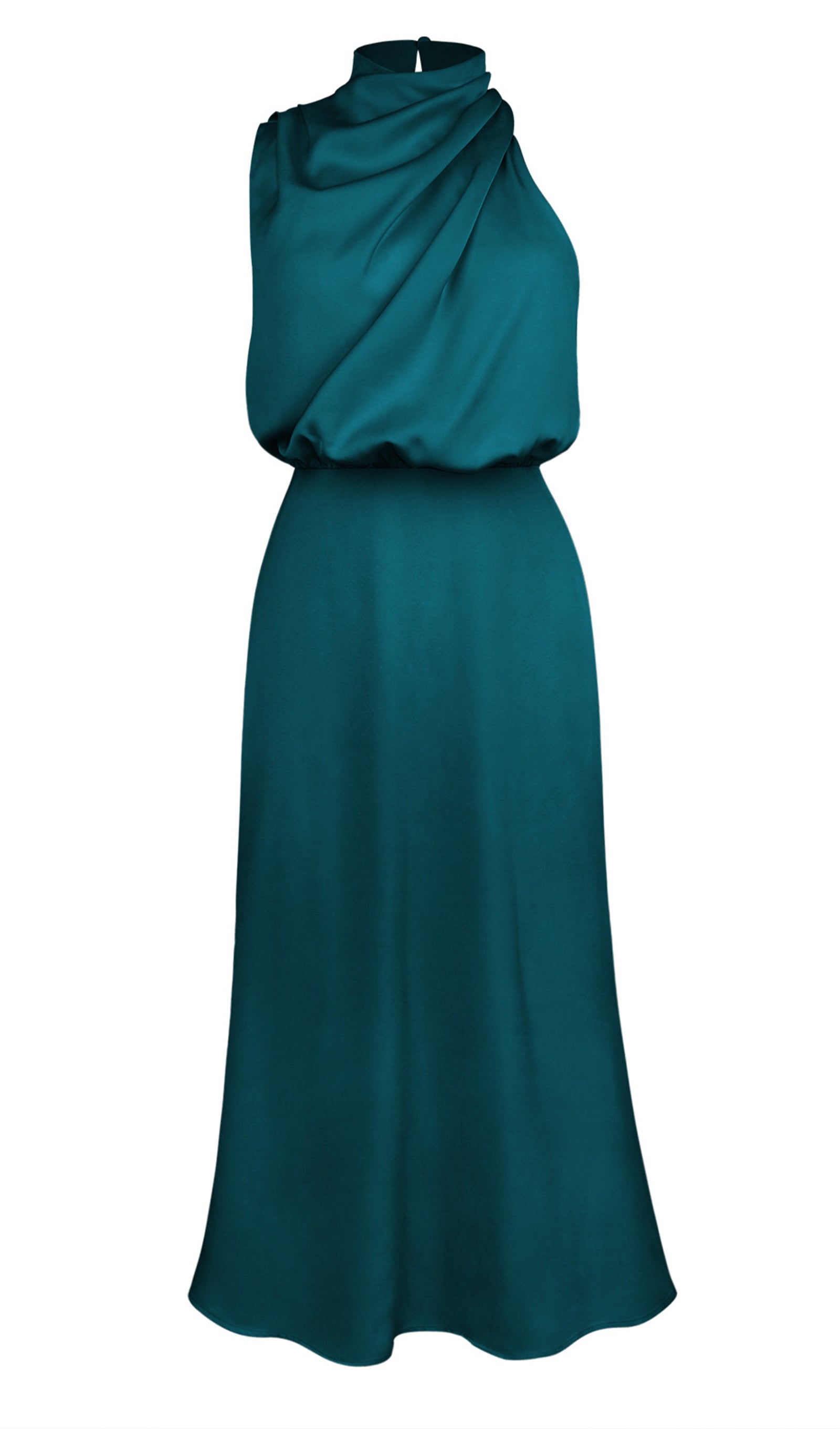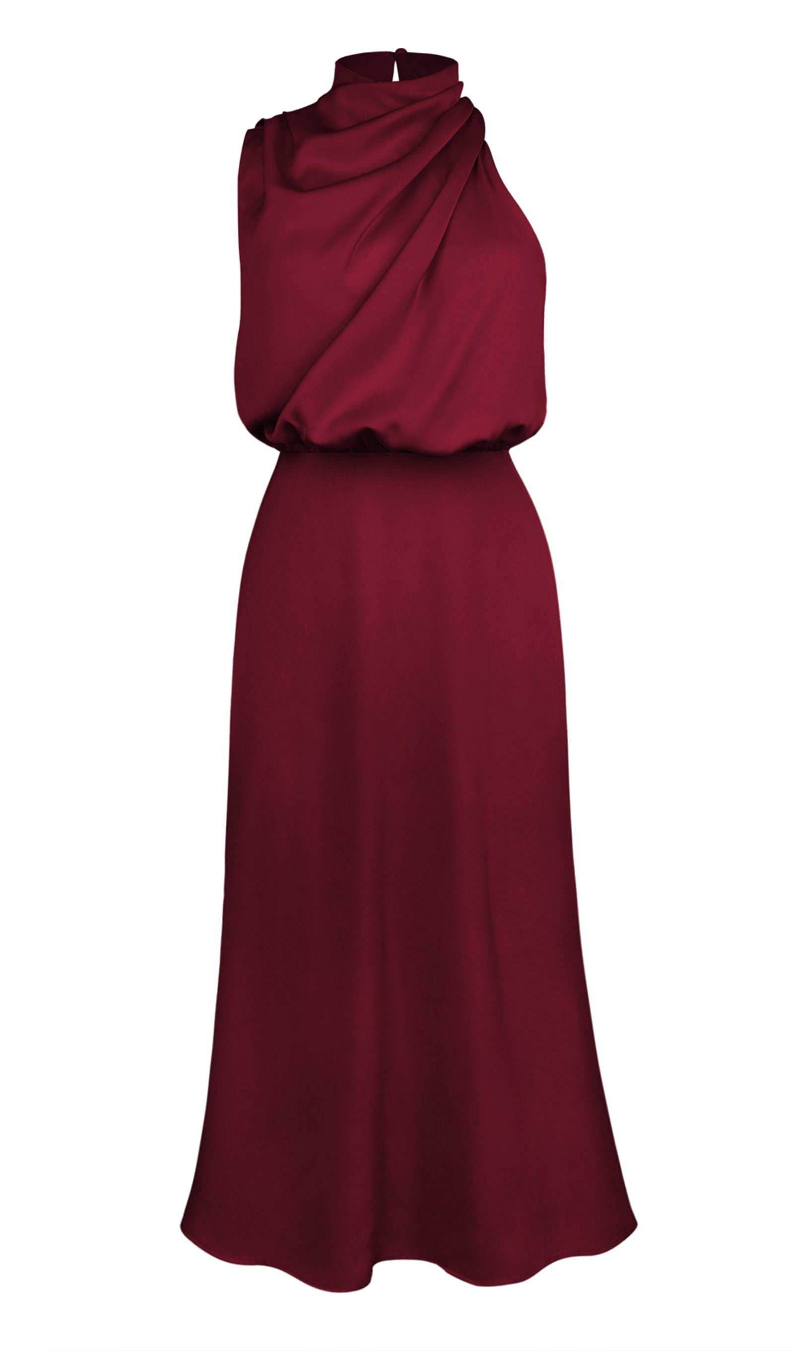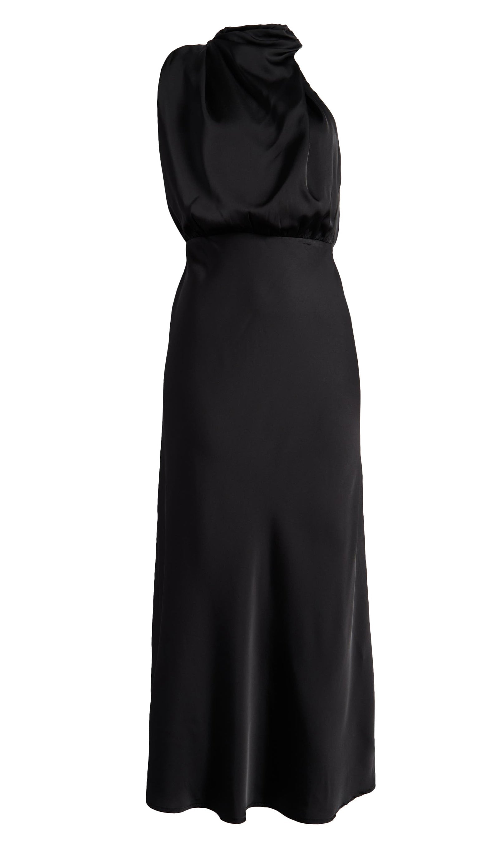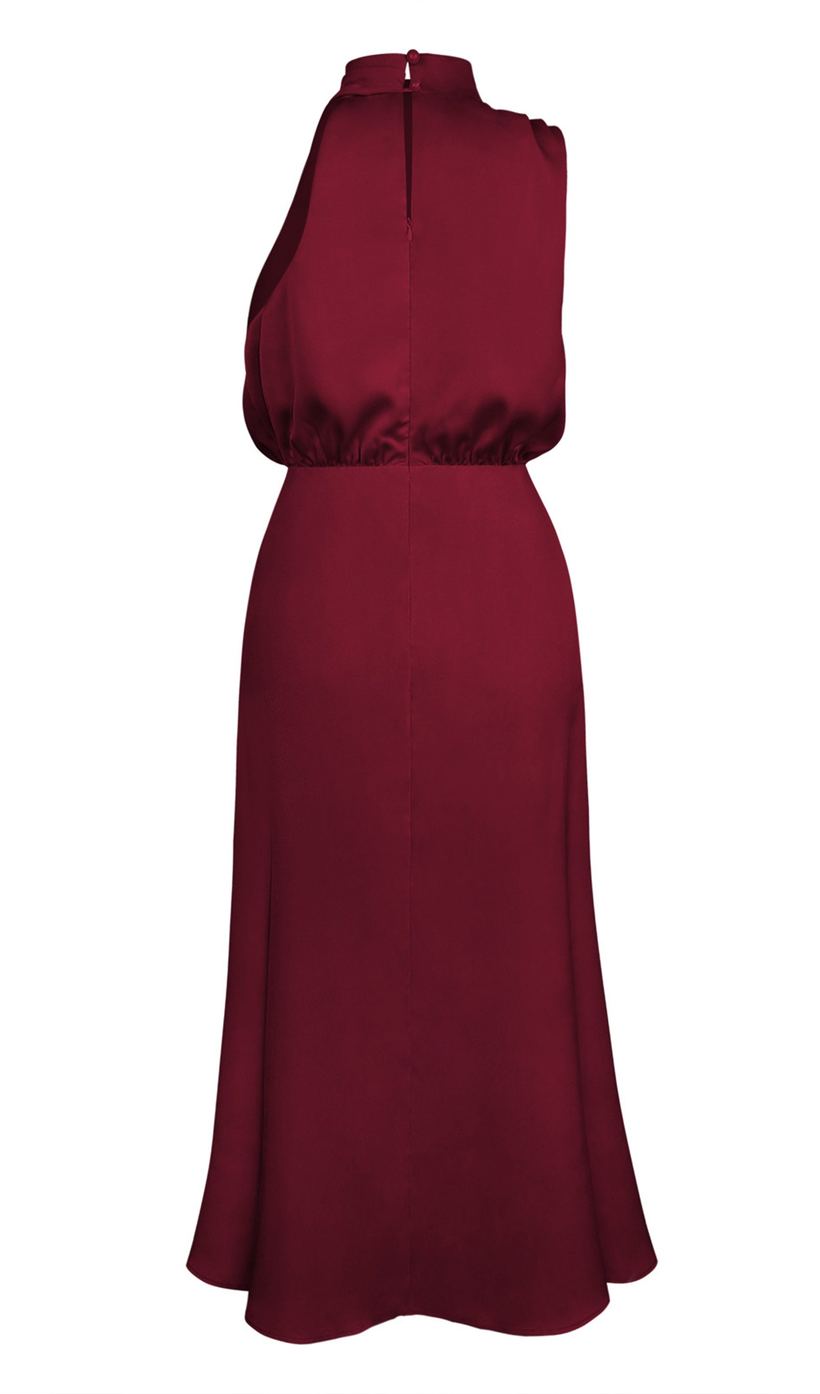 Feel your most charming in this satin cocktail dress that gets an edgy vibe from asymmetric details along the bodice.
