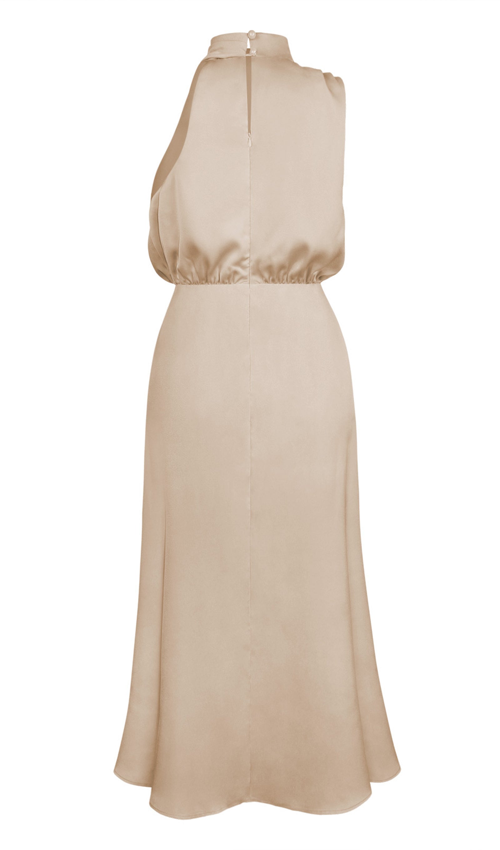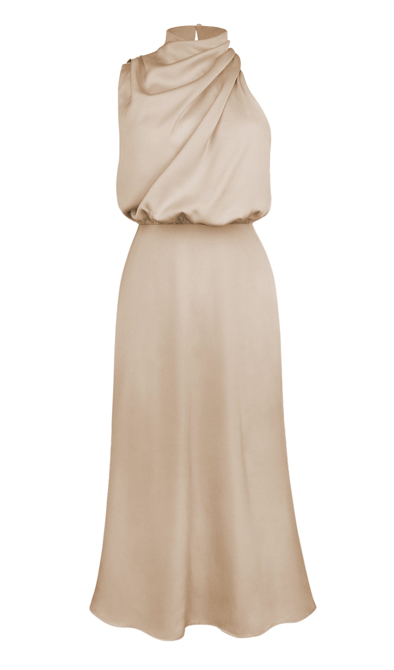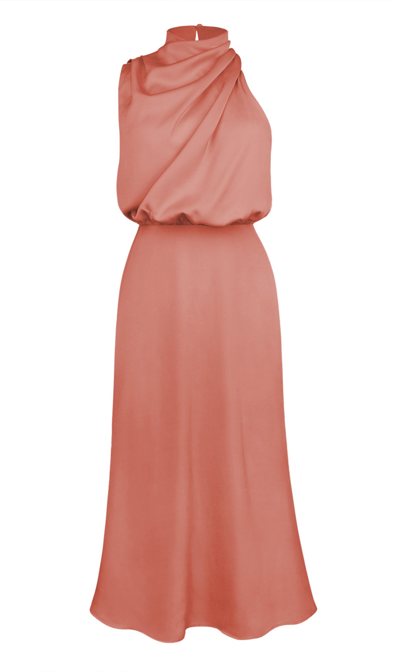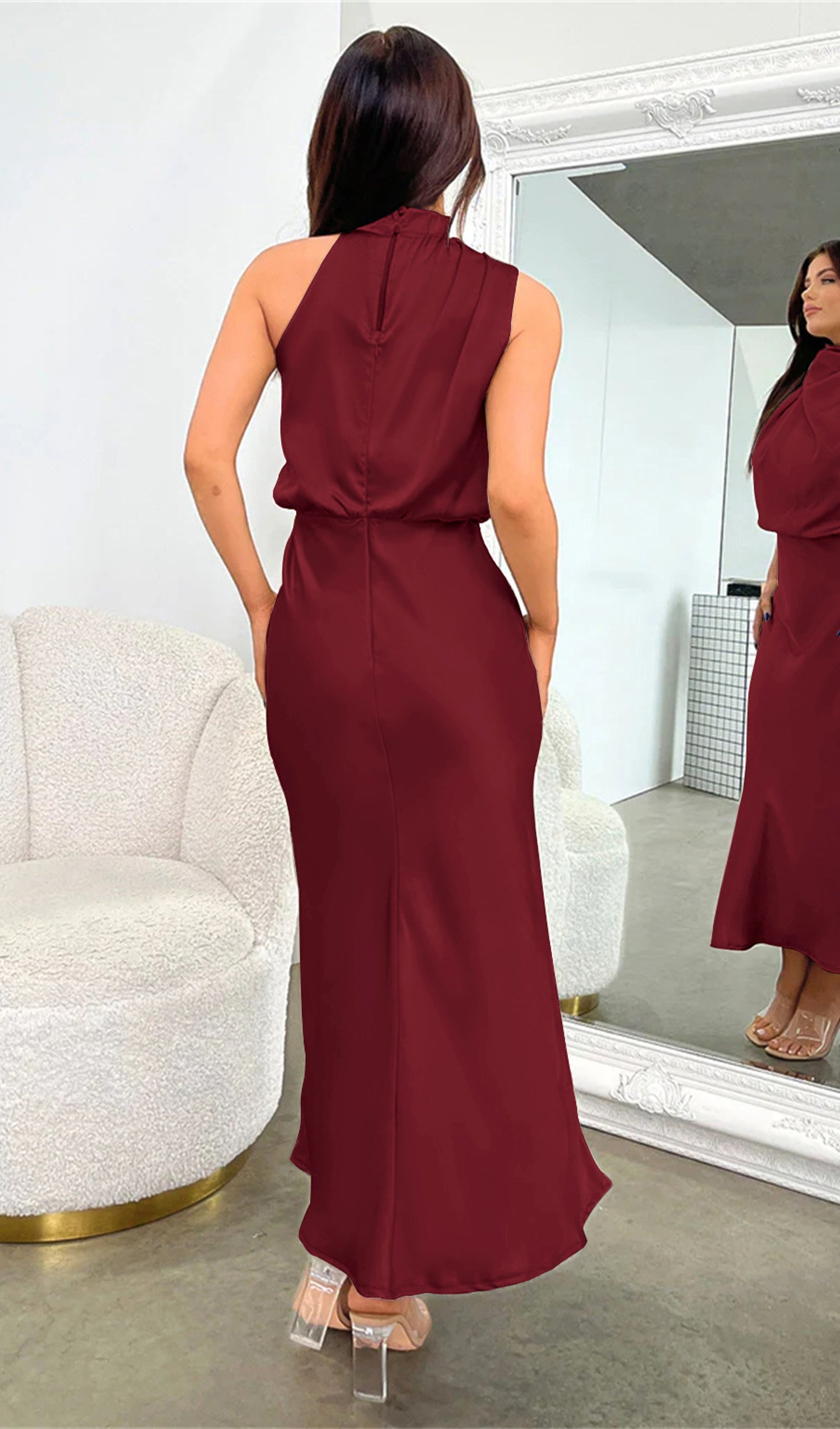 Feel your most charming in this satin cocktail dress that gets an edgy vibe from asymmetric details along the bodice.