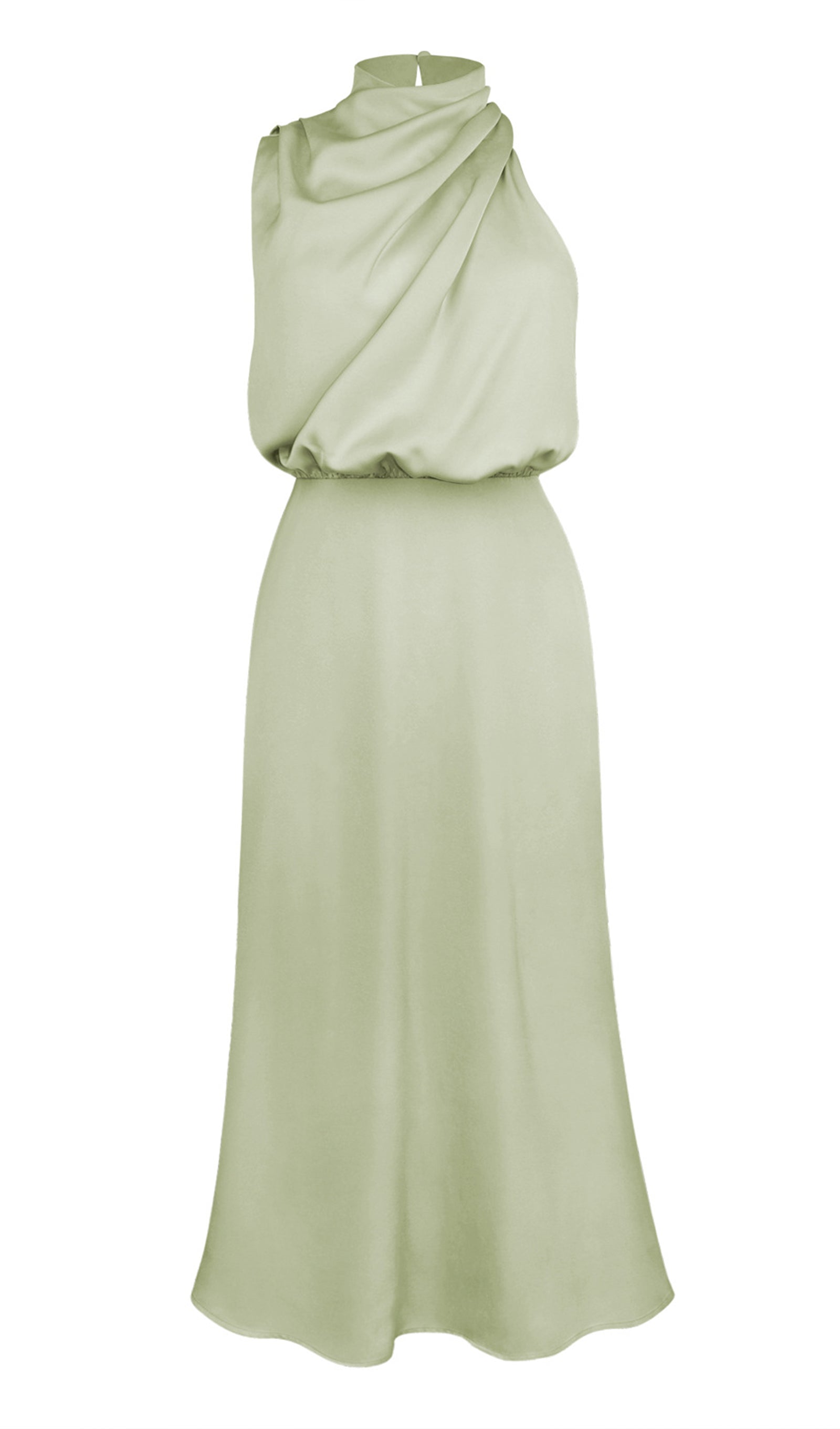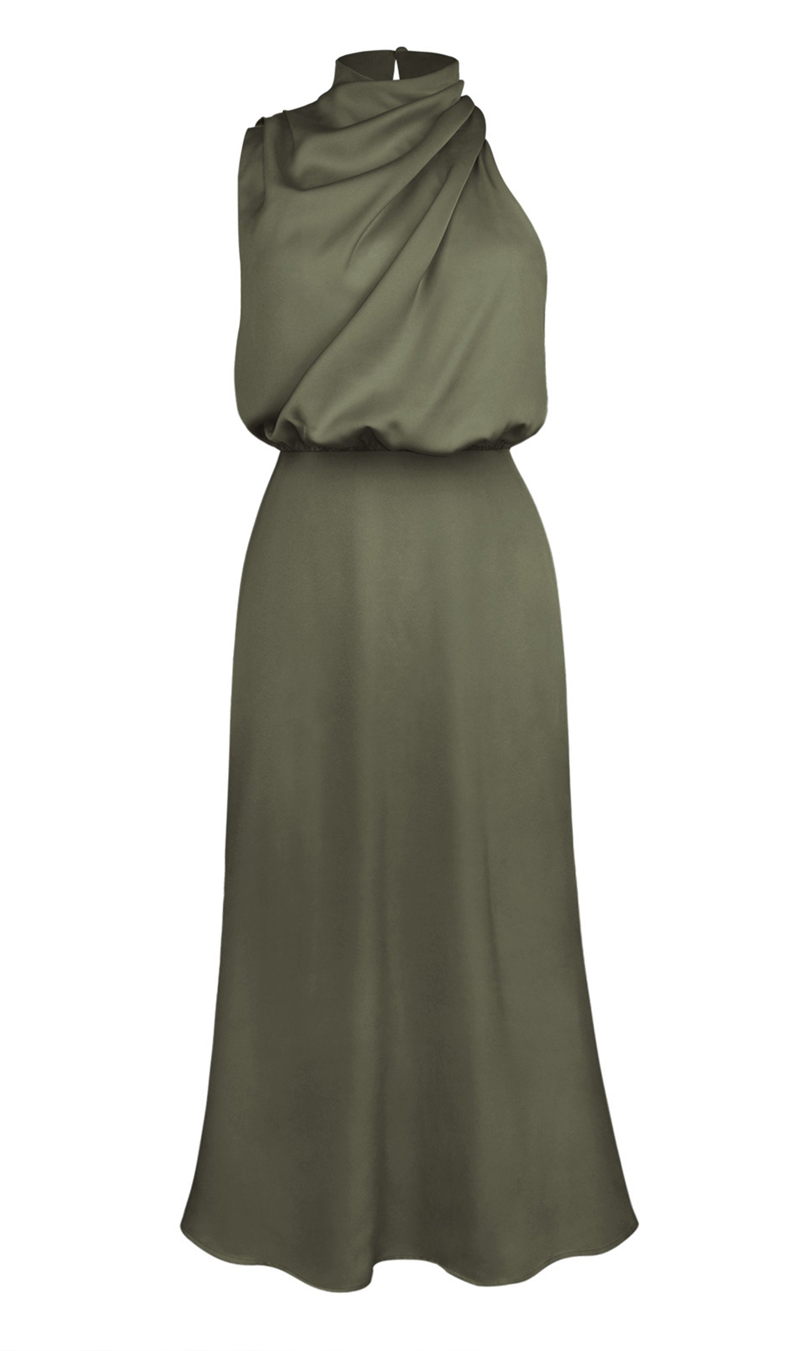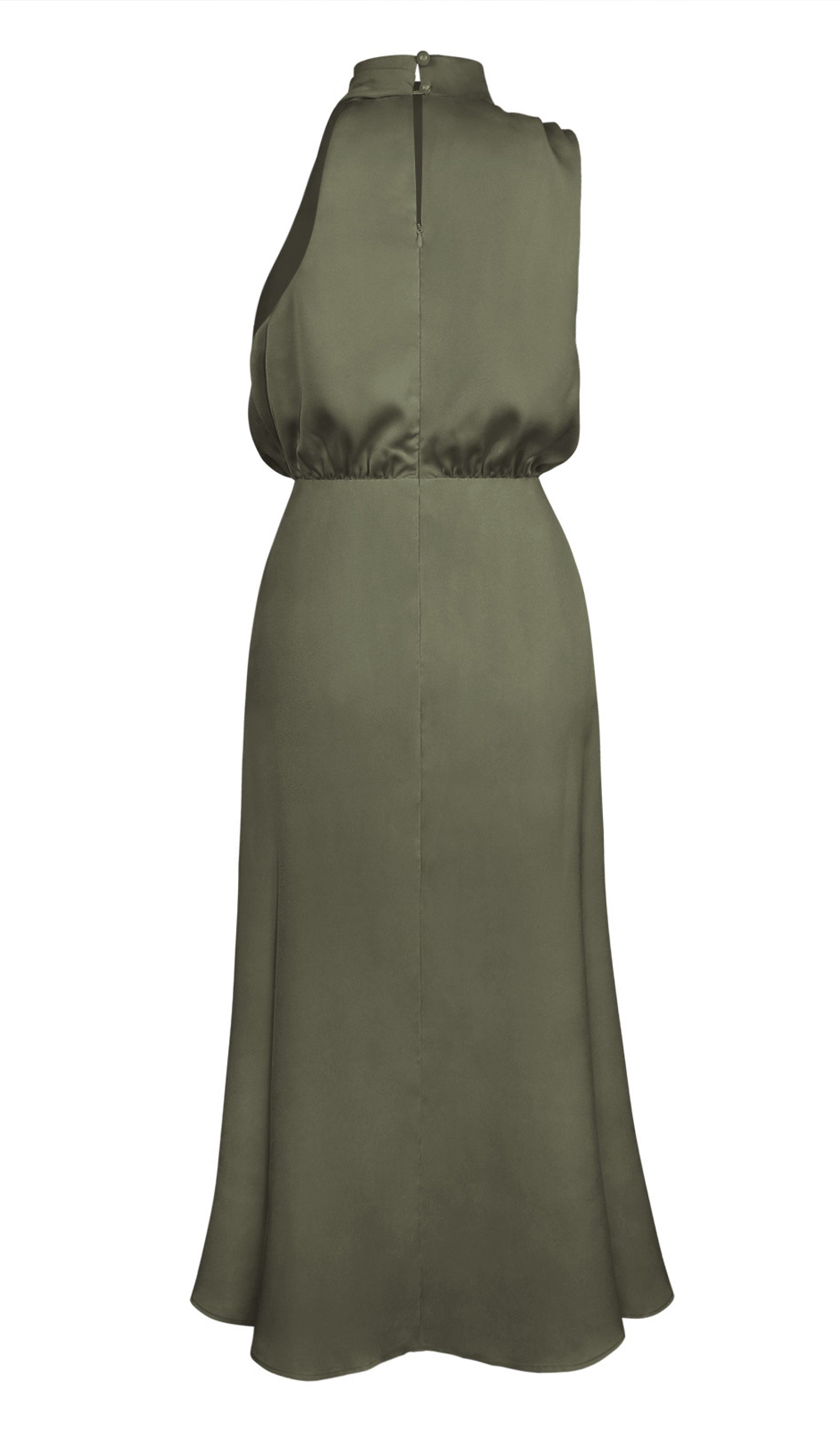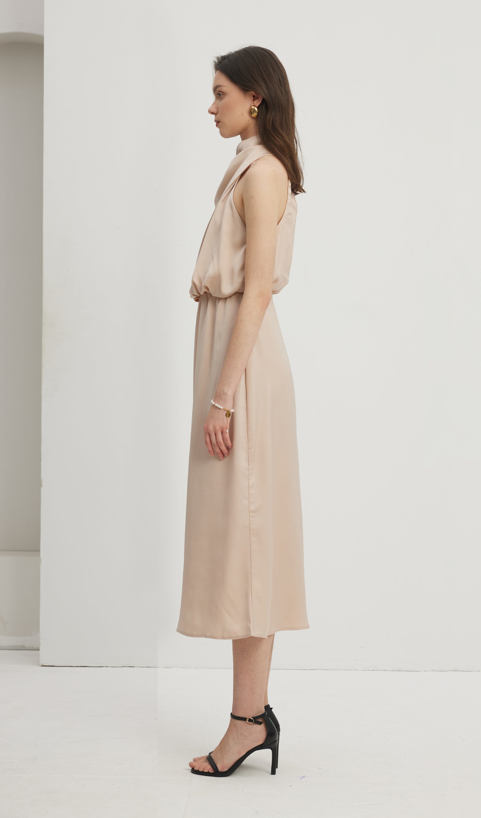 Feel your most charming in this satin cocktail dress that gets an edgy vibe from asymmetric details along the bodice.