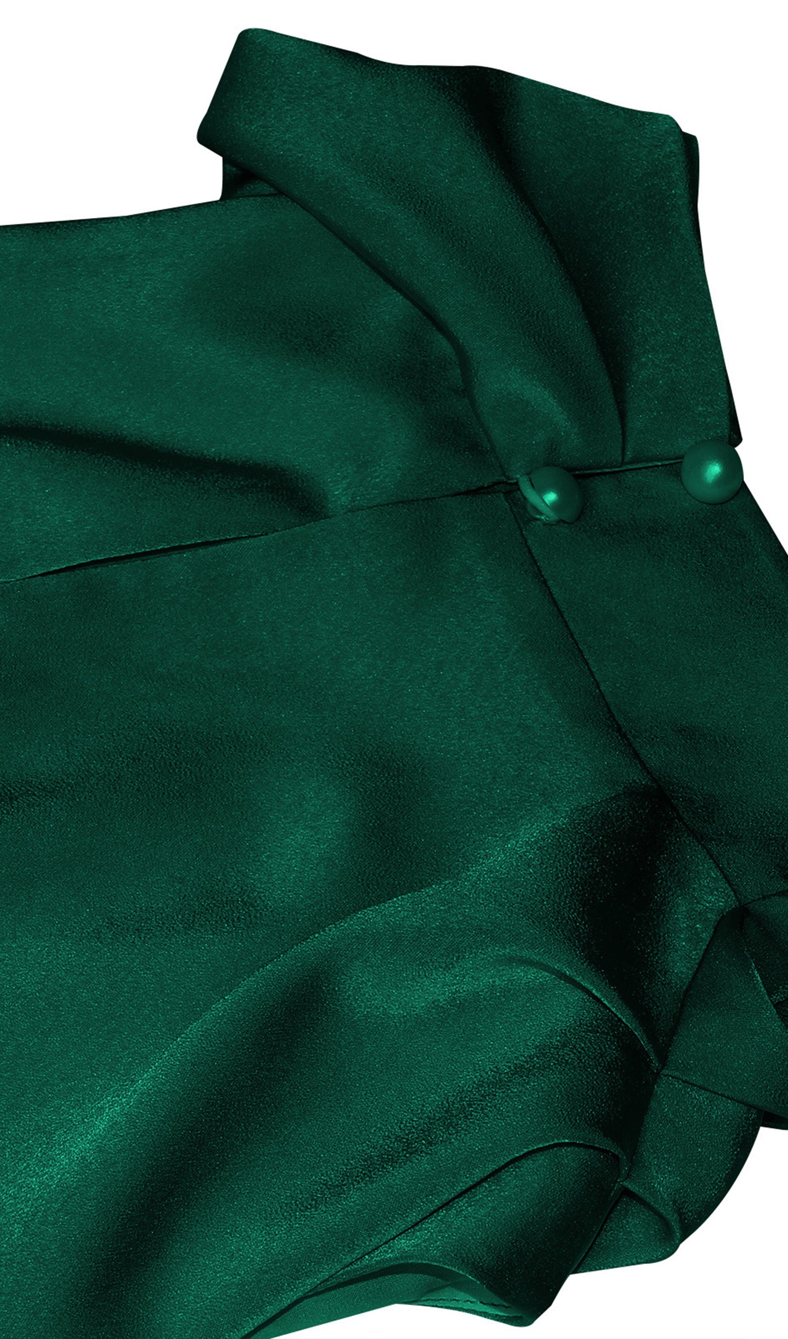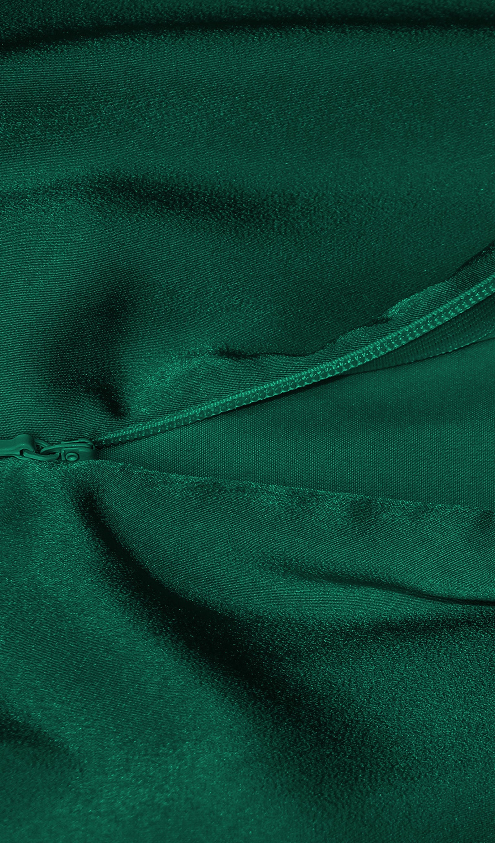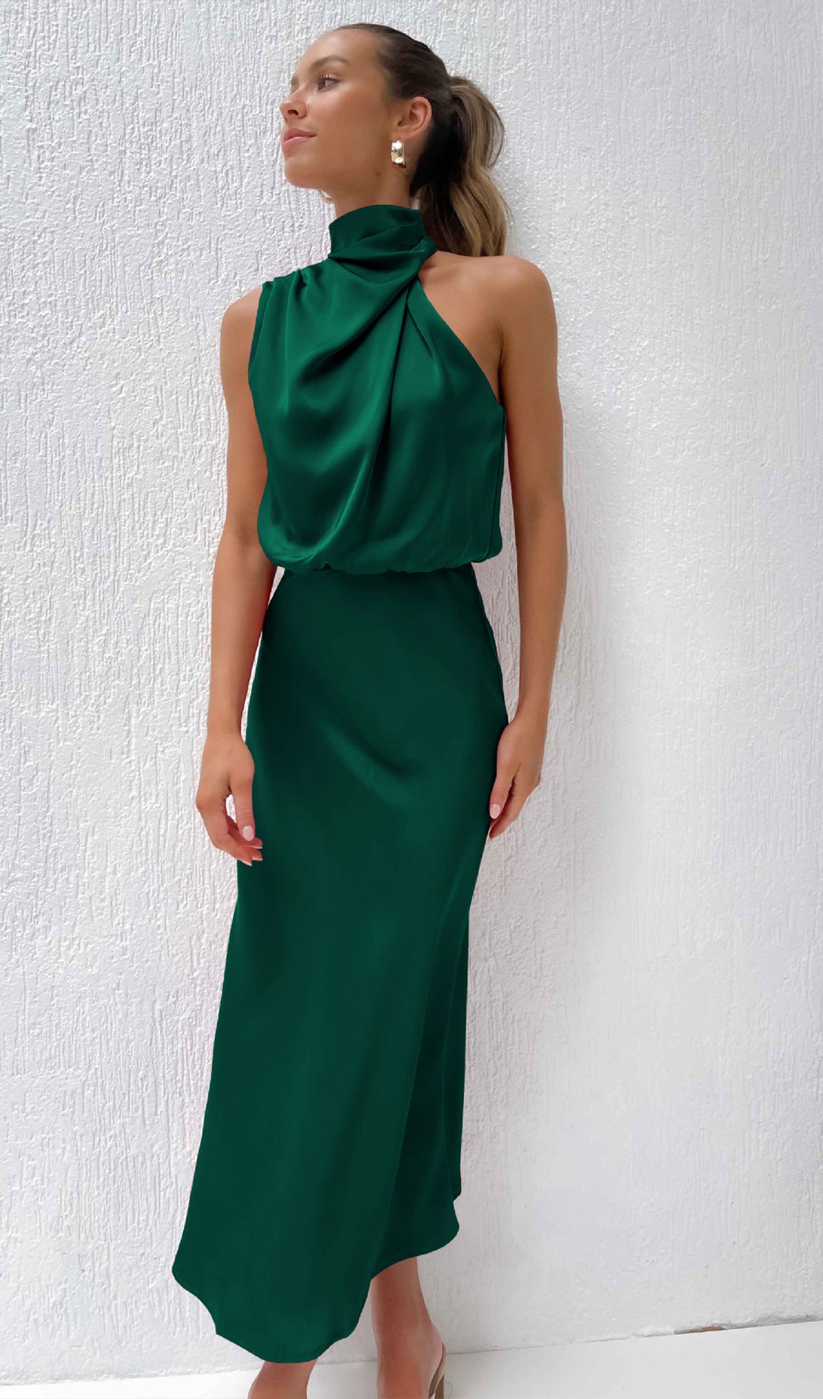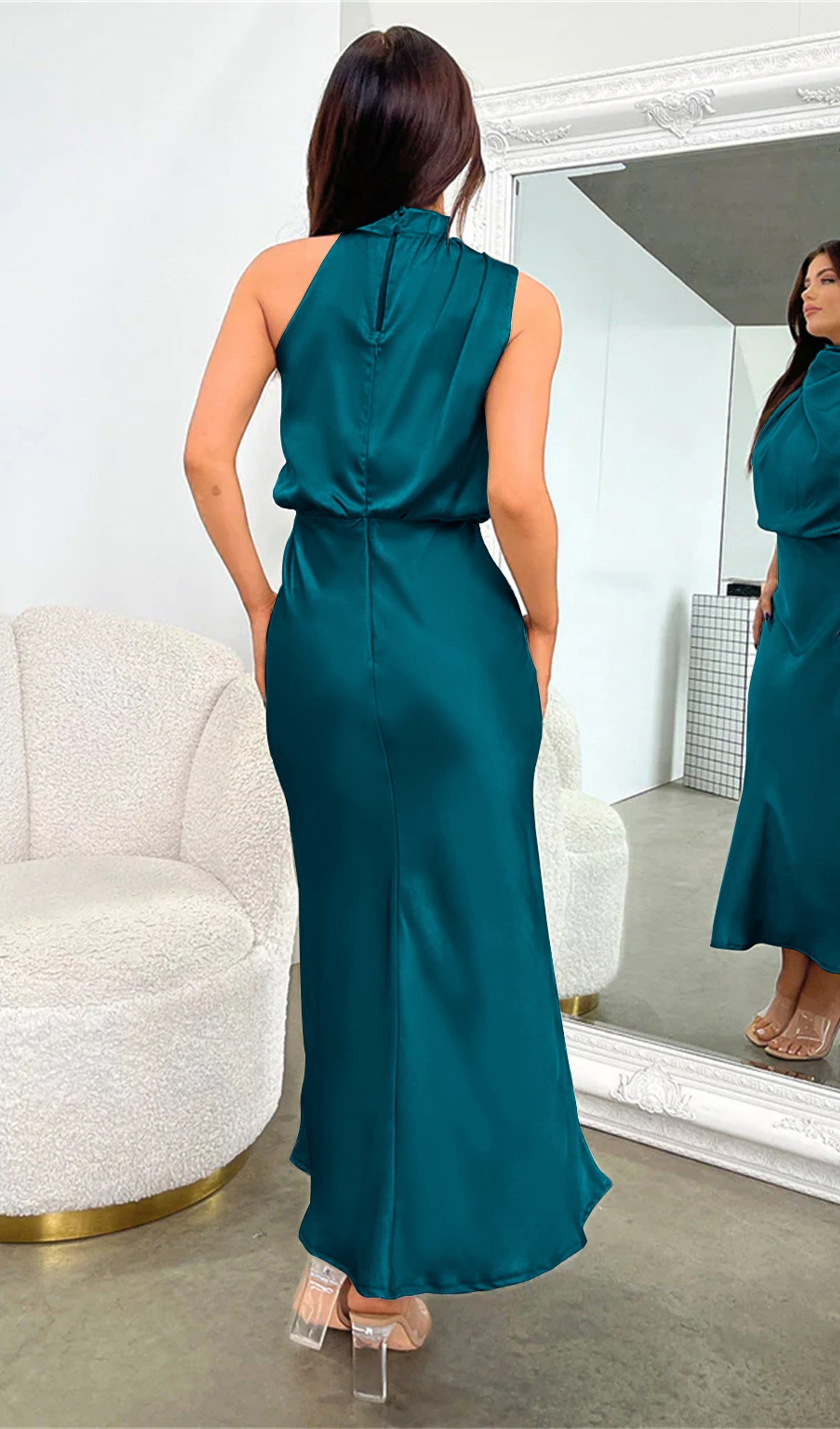 Feel your most charming in this satin cocktail dress that gets an edgy vibe from asymmetric details along the bodice.