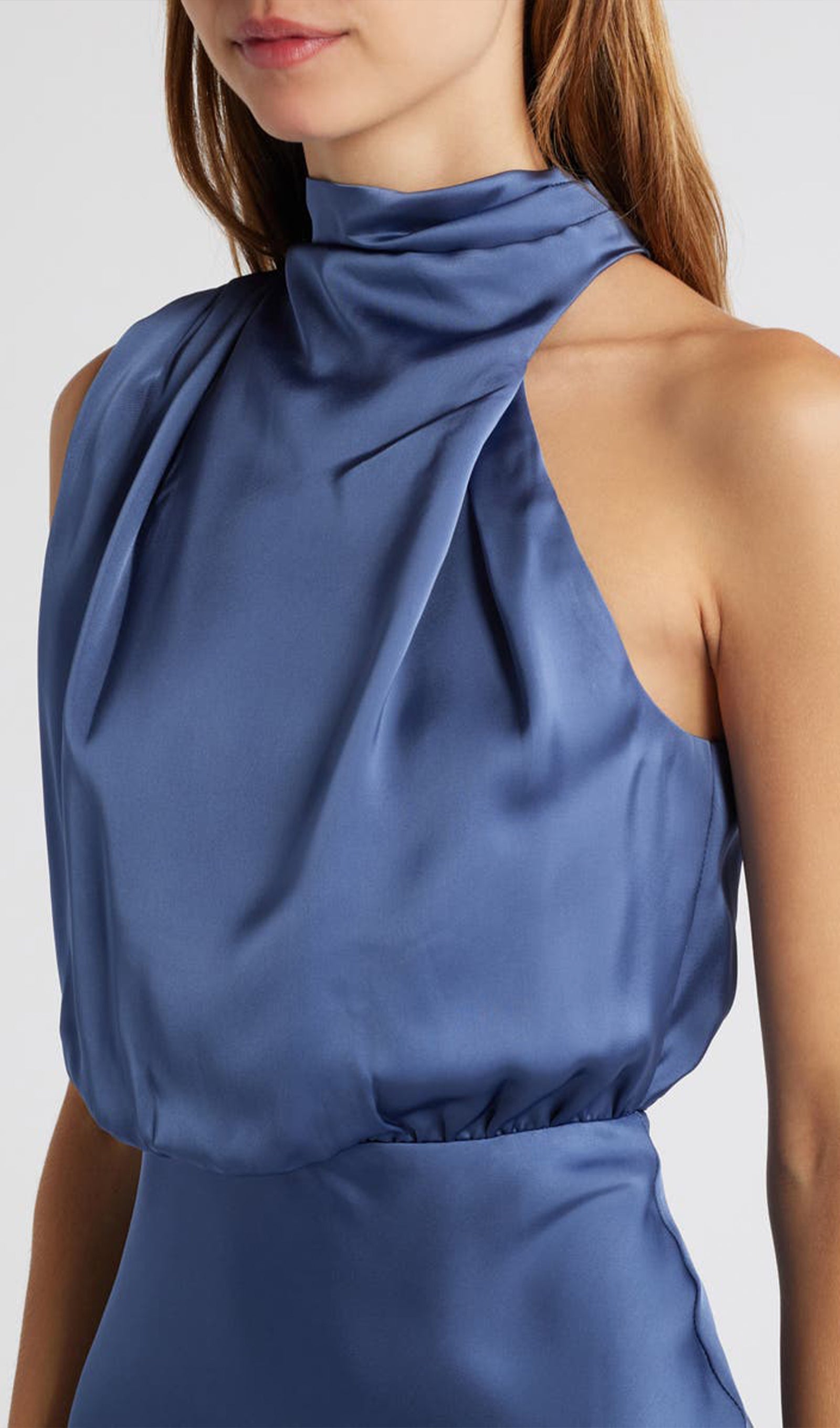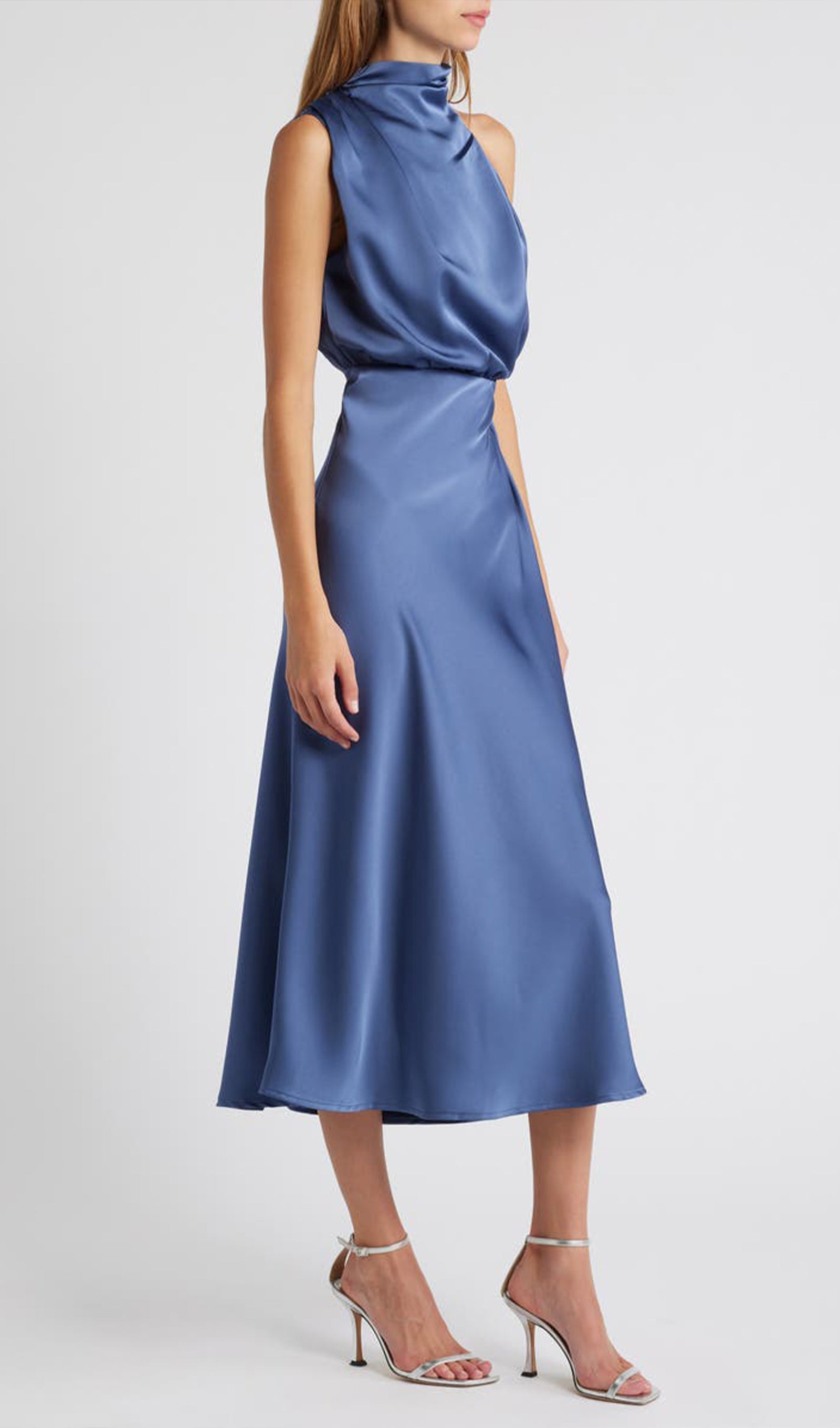 Feel your most charming in this satin cocktail dress that gets an edgy vibe from asymmetric details along the bodice.