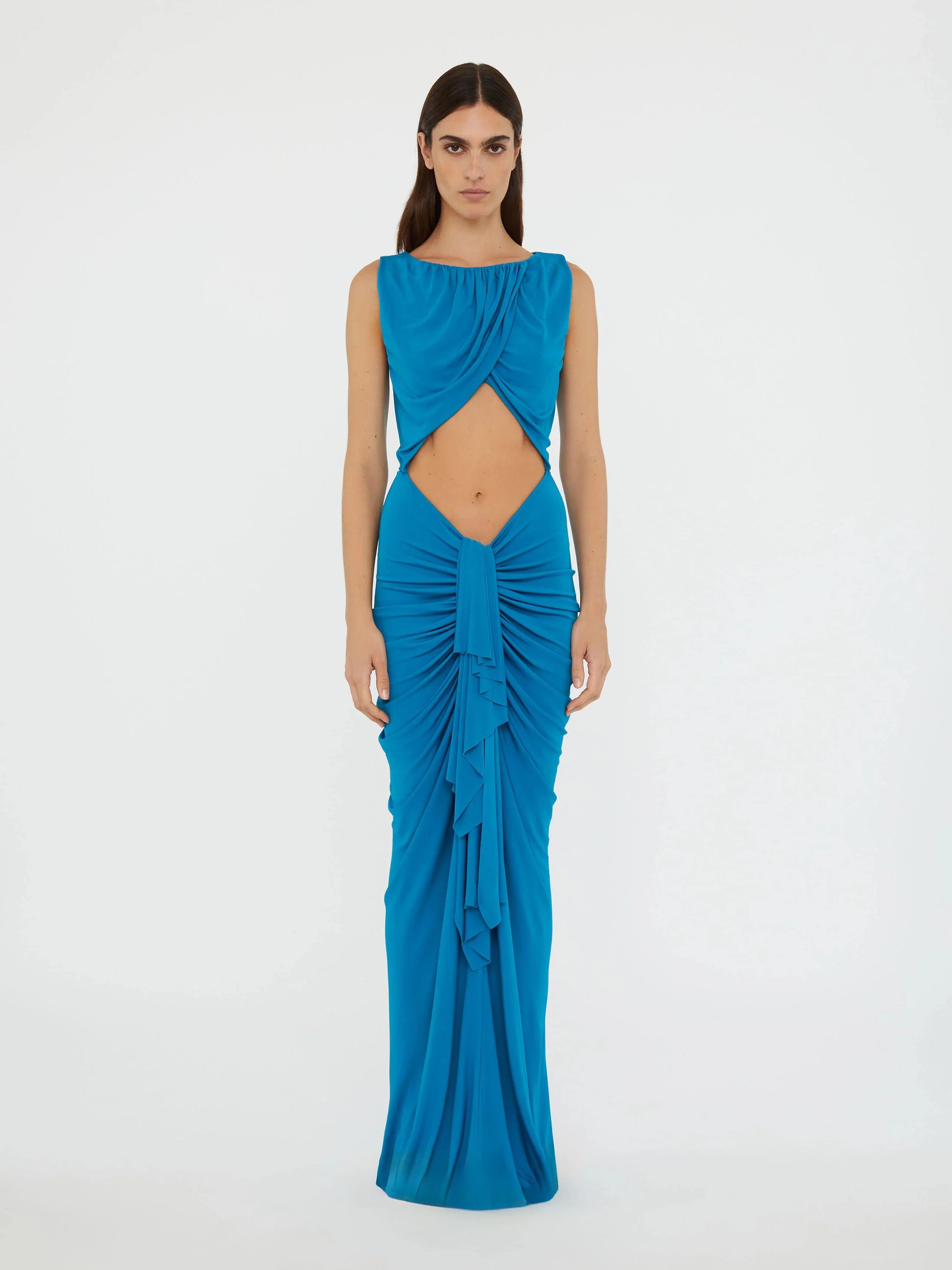 An exploration of fluidity and form, this sleeveless draped jersey maxi gown is artfully constructed with an exposed midriff and cascading draped panel. Refined by a ruched bateau neckline and signature cut-out accents.