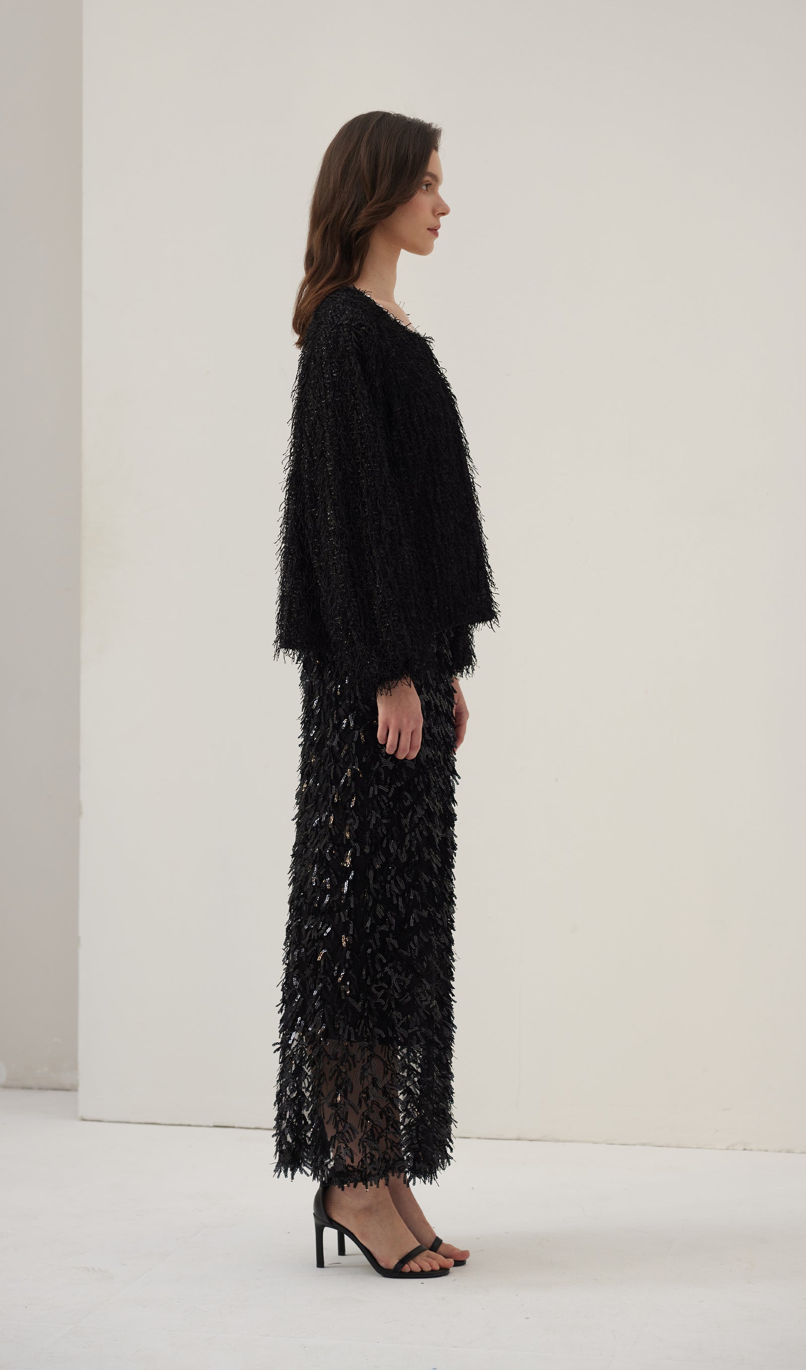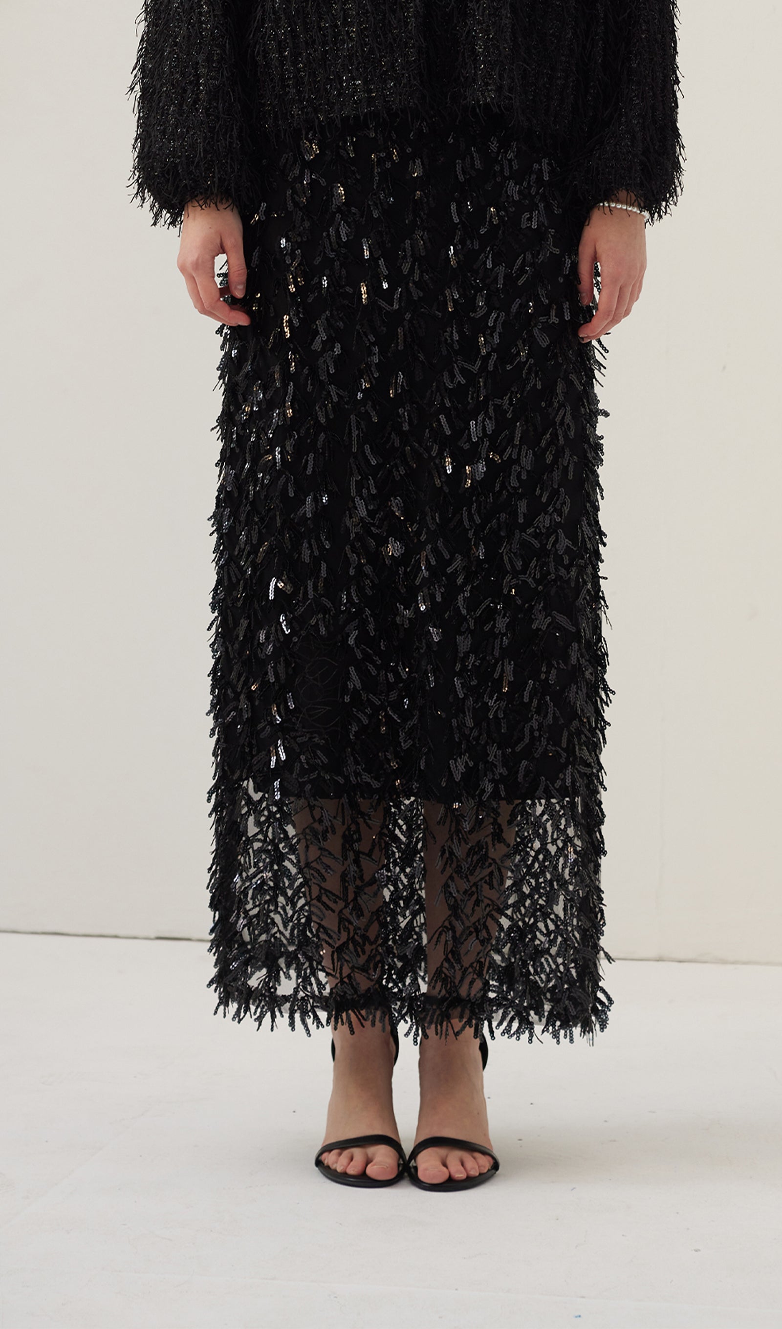 Introducing our Black Feather Midi Skirt - a must-have for any fashion-forward individual. Crafted with intricate black feathers, this skirt adds a touch of elegance to any outfit. Expertly designed for comfort and style, it's perfect for both formal and casual occasions. Make a statement and elevate your wardrobe with this unique piece.