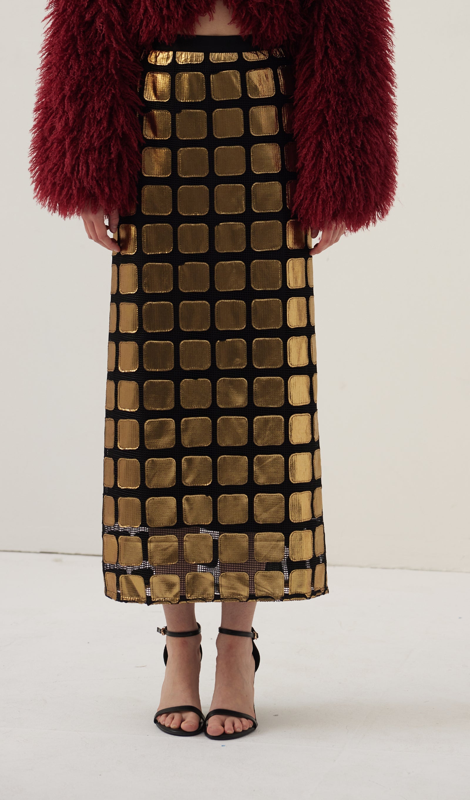 Expertly crafted from high-quality fabric, this Block Panel Midi Skirt in Gold adds a touch of sophistication to any outfit. The unique block panel design creates a flattering silhouette, while the midi length offers versatility for day or night wear. Elevate your style with this must-have wardrobe staple.