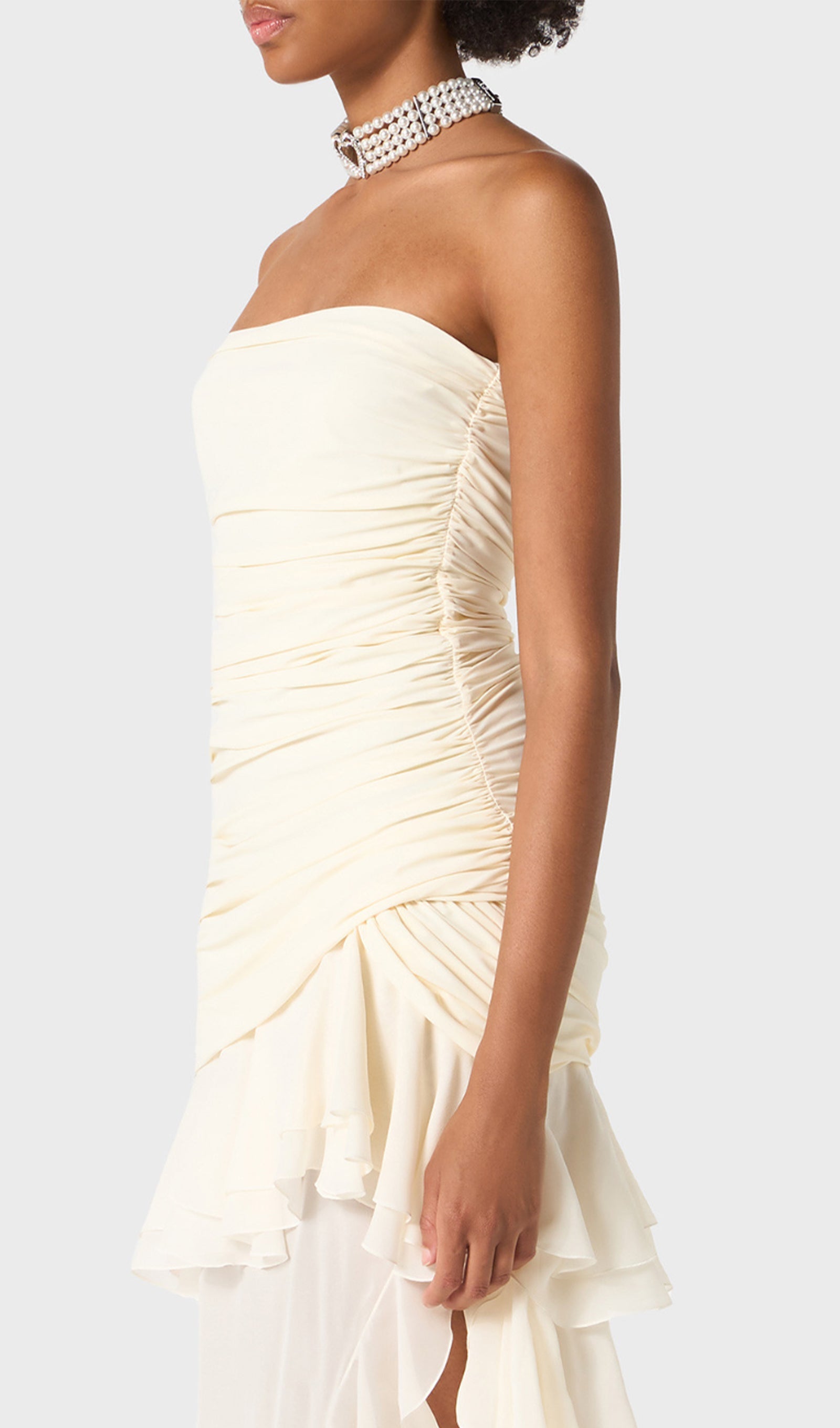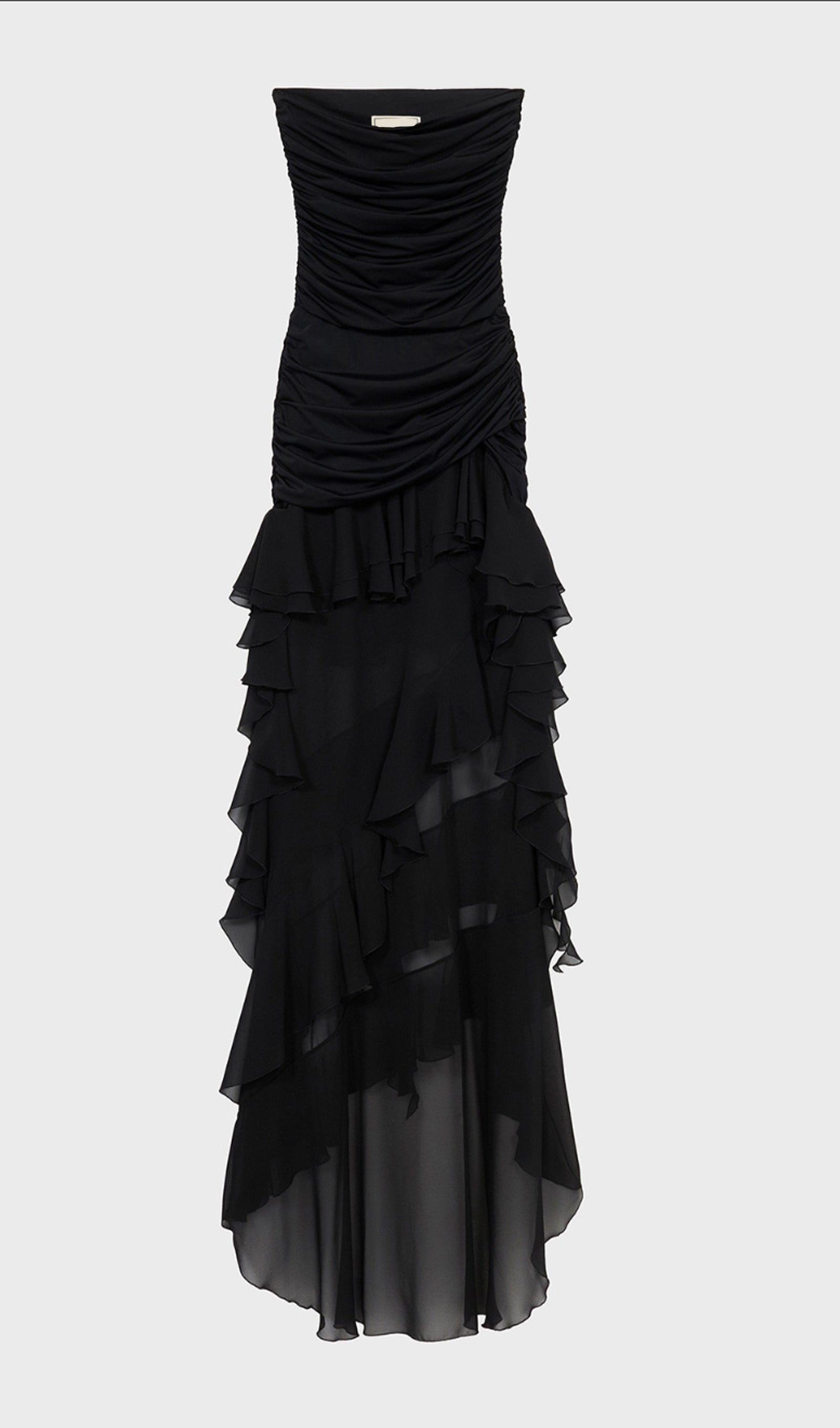 Expertly designed, the Bustier Chiffon Flounces Midi Dress is constructed with a second-skin jersey material for a seamless and comfortable fit. The ruffled sides add a touch of elegance, while the asymmetric chiffon skirt with flounces creates a beautiful, flowing silhouette. Perfect for any formal event.