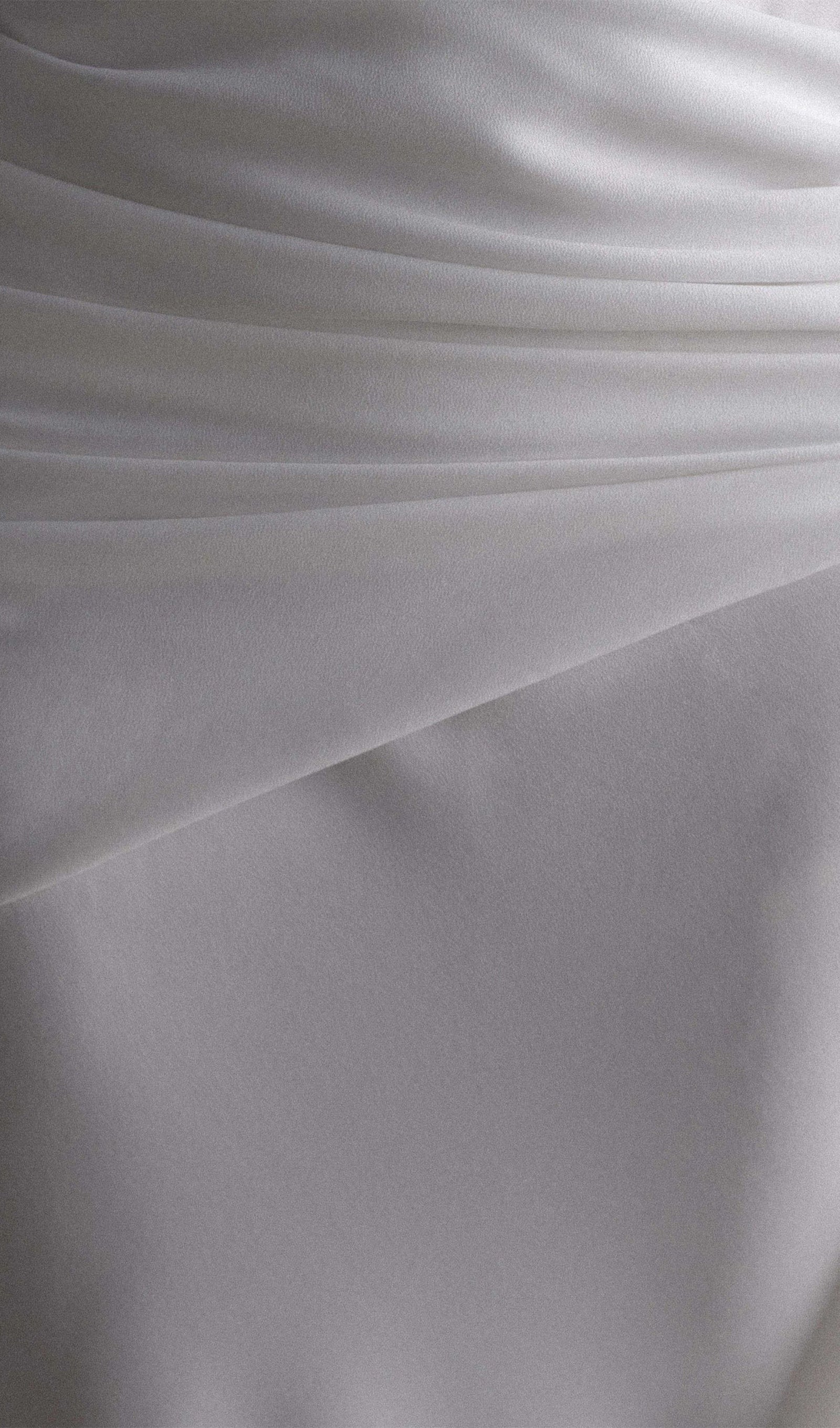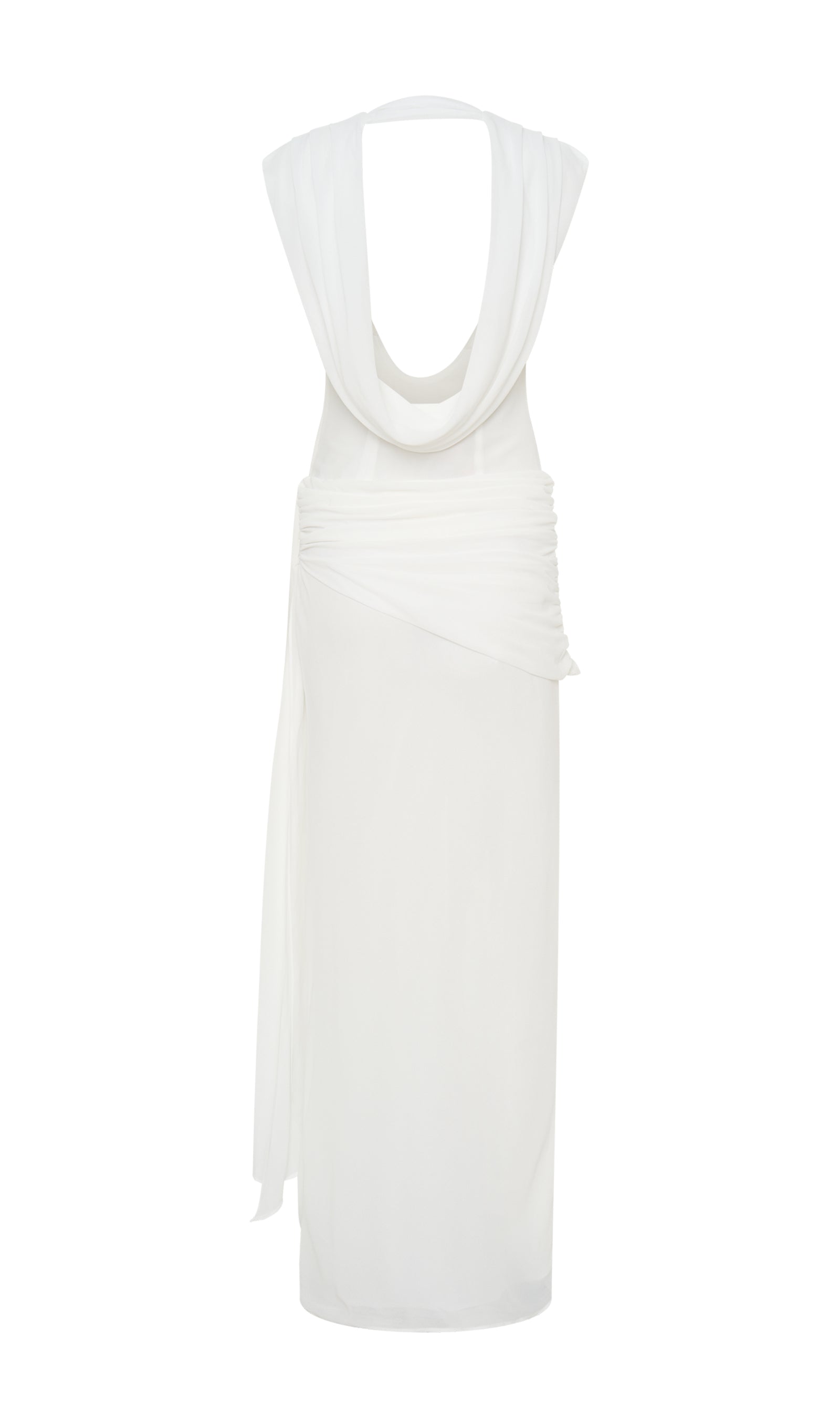 The Chiffon Draped Maxi Dress is a breathtaking display of fluidity and grace. Designed with a deep cowl neckline at both the front and back, this silhouette drapes effortlessly for a touch of timeless allure. The fitted waist creates a flattering shape, while the gathered overlay detail at the hip adds soft dimension. A flowing hip sash enhances movement, complementing the airy chiffon fabrication. Sleeveless and maxi in length, this dress is the perfect choice for elegant soirées, formal occasions, or modern bridal moments.