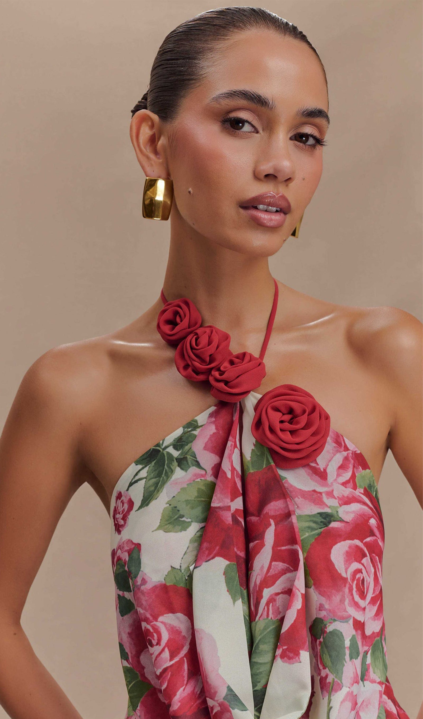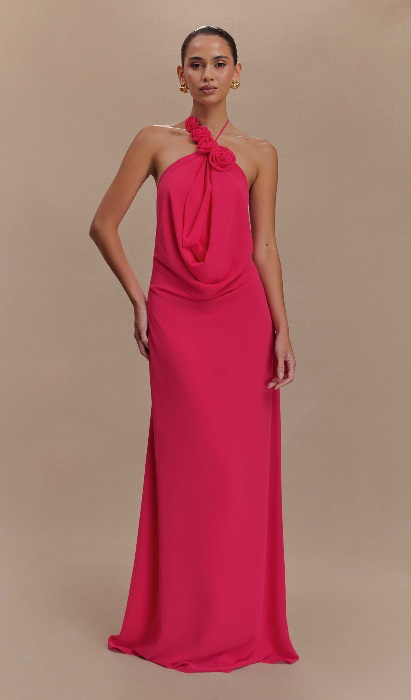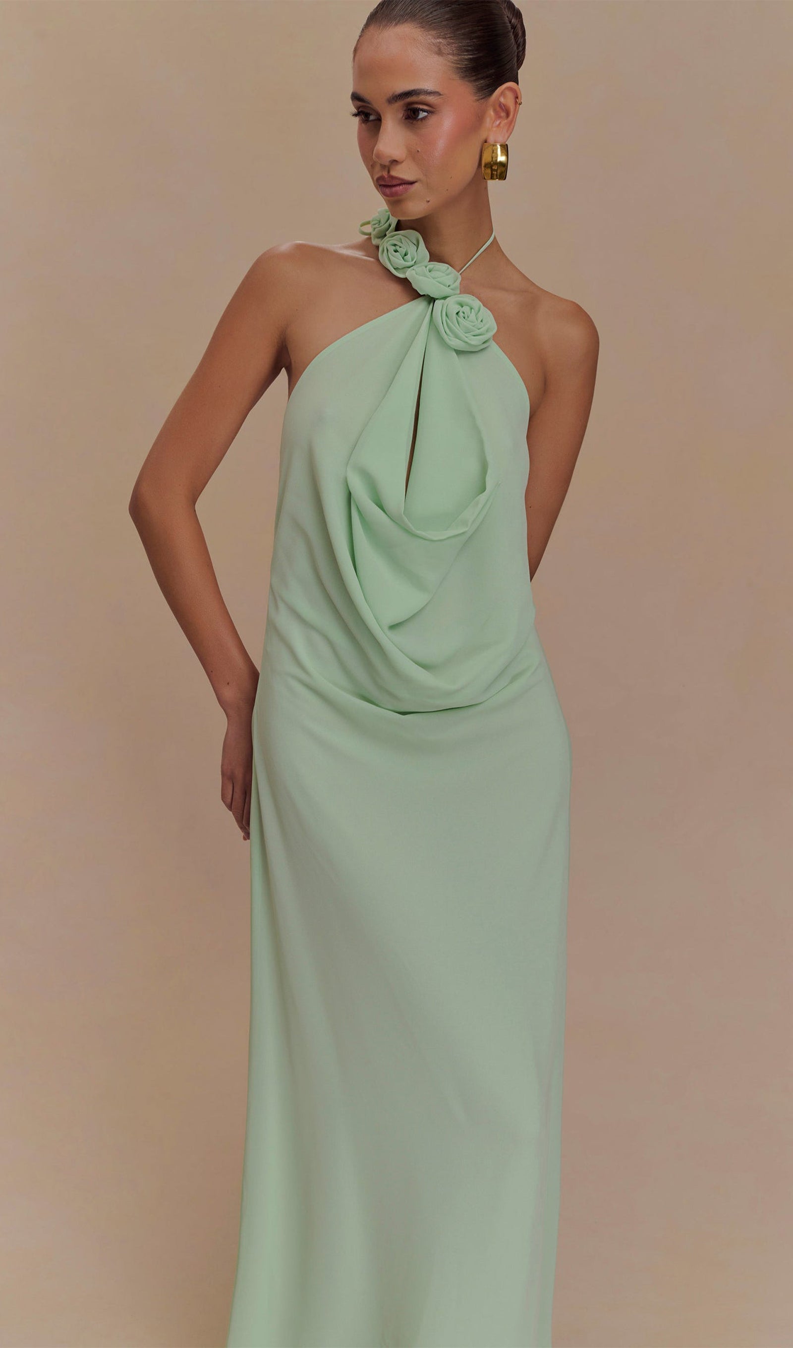 The Cowl Neck Maxi Dress is a captivating blend of elegance and romance. Featuring a deep cowl neckline and an alluring open back, this dress is designed to turn heads. Designed to have a soft draped fit around the neckline and soft fit body, the adjustable halter tie ensures a perfect fit, while the delicate chiffon rose applique detail adds a touch of whimsical charm. With its relaxed, drapey fit and floor-skimming maxi length, this dress is both effortlessly graceful and strikingly sophisticated.