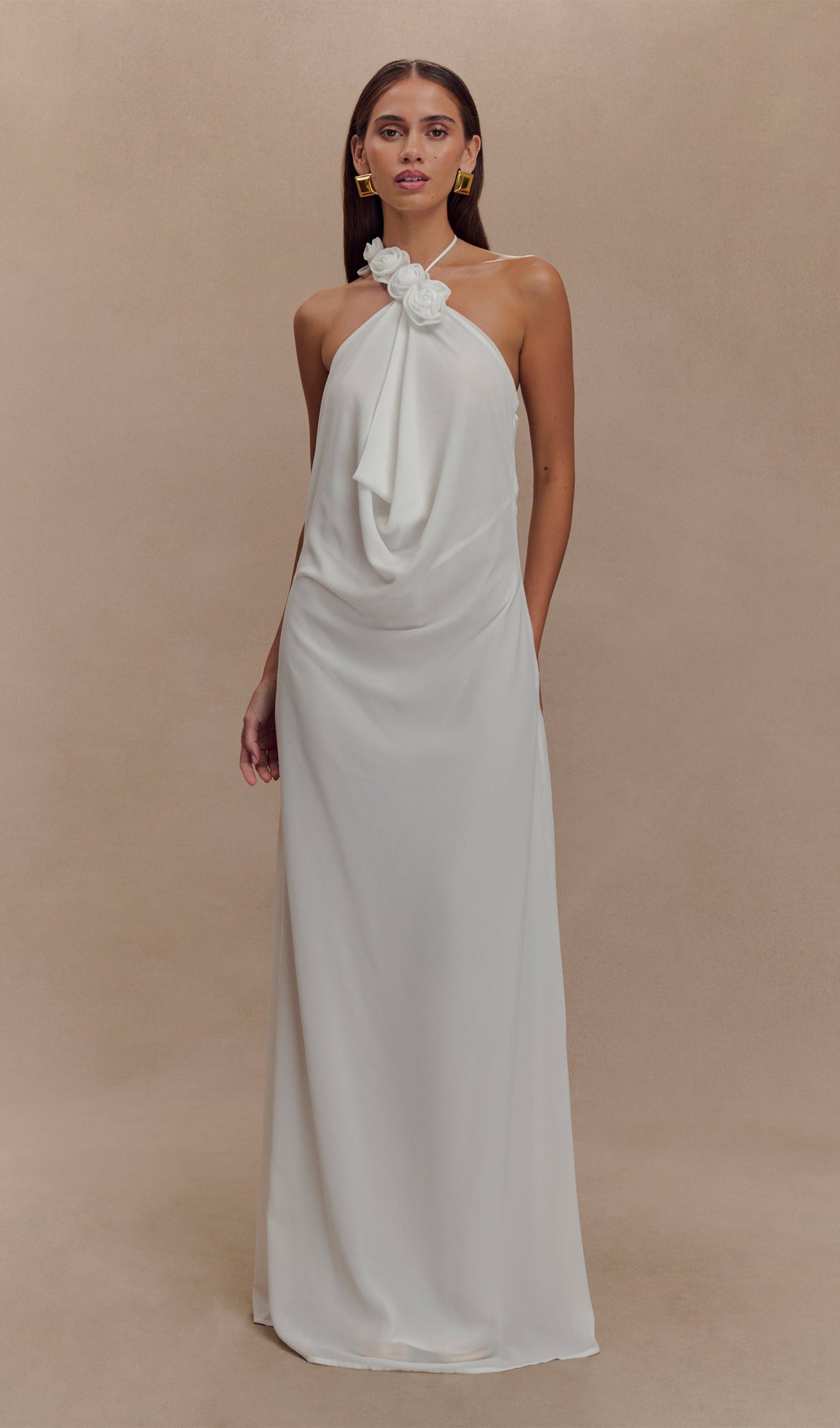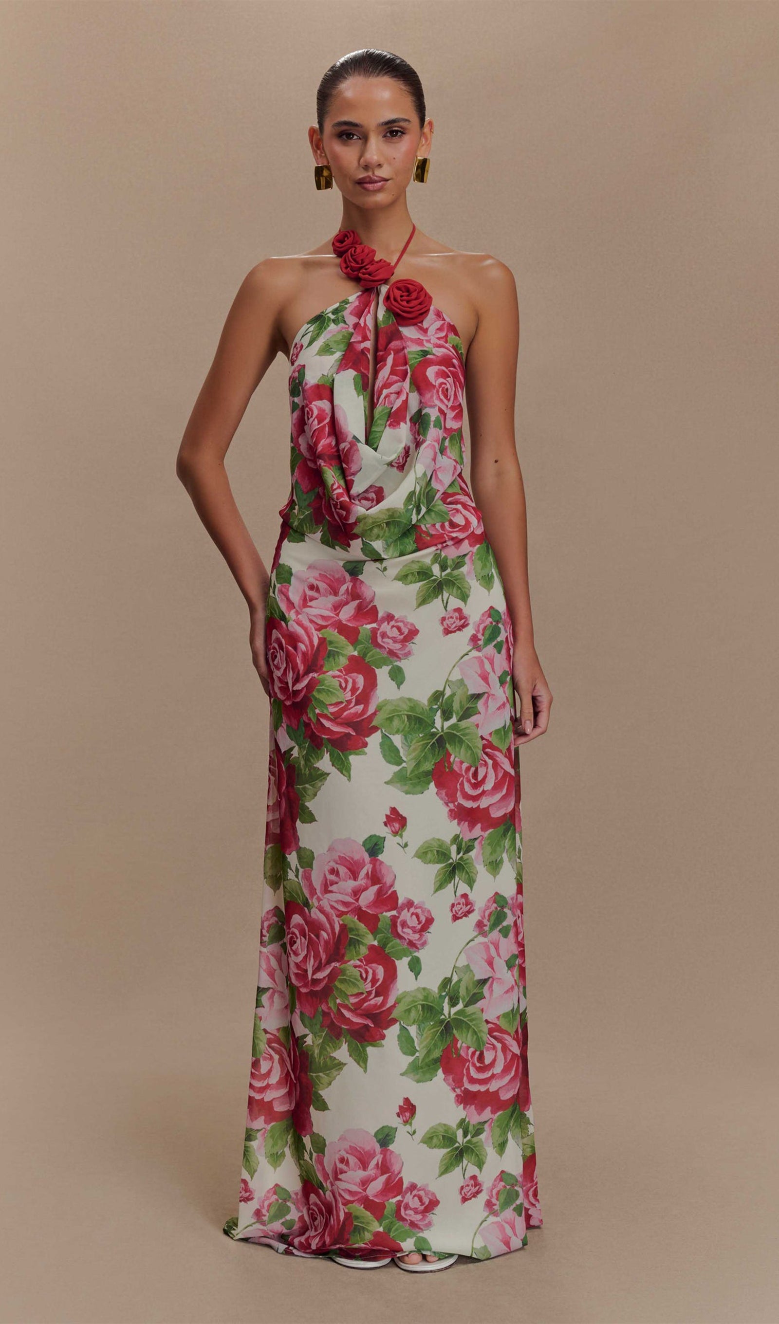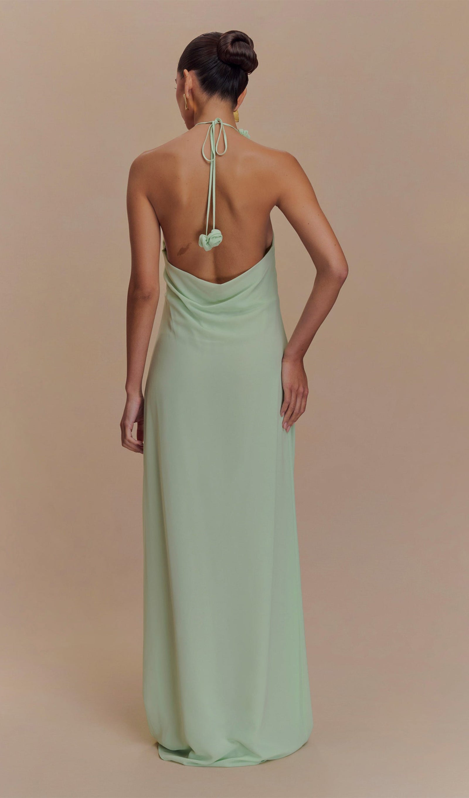 The Cowl Neck Maxi Dress is a captivating blend of elegance and romance. Featuring a deep cowl neckline and an alluring open back, this dress is designed to turn heads. Designed to have a soft draped fit around the neckline and soft fit body, the adjustable halter tie ensures a perfect fit, while the delicate chiffon rose applique detail adds a touch of whimsical charm. With its relaxed, drapey fit and floor-skimming maxi length, this dress is both effortlessly graceful and strikingly sophisticated.