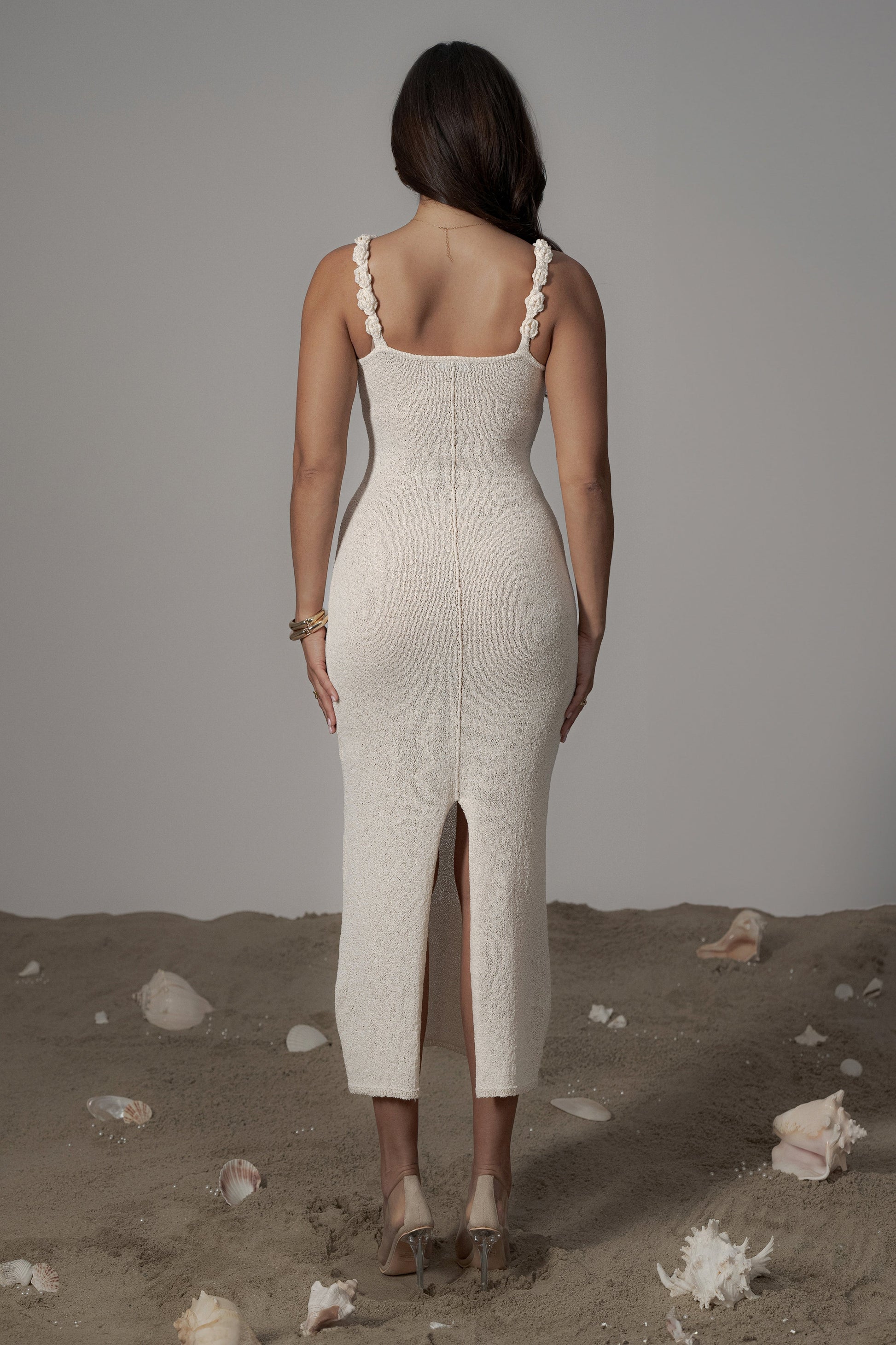 Transition from the beach to the boardwalk with our new Cream Margo Maxi Dress. This effortless maxi dress features a v-neckline, back slit, and shoulder straps adorned with hand-made rose trims. Crafted in a lightweight knit perfect for the summer time. Stretchy. Single-lined.