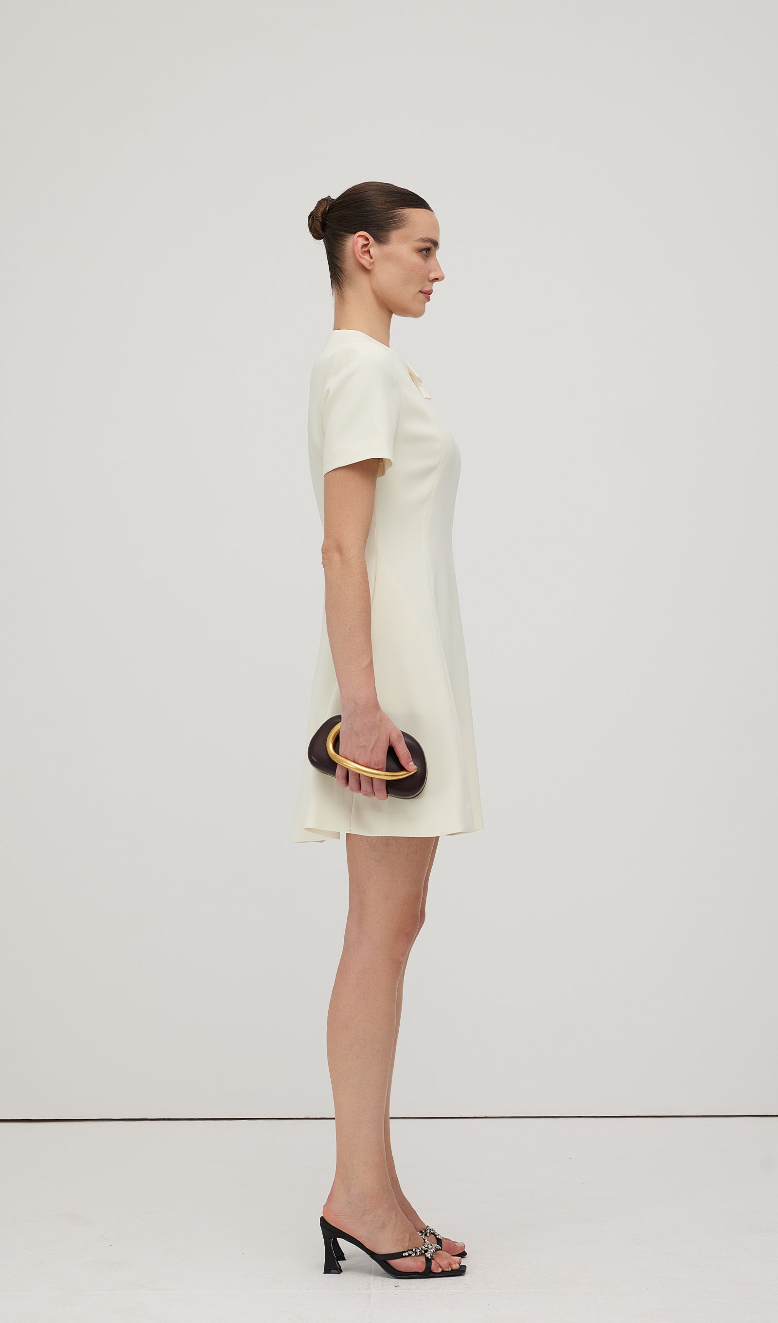 Expertly tailored from crepe fabric, this A-line mini dress features a charming bow detail. Designed to flatter your figure, it's perfect for any occasion. Show off your sophisticated style while feeling confident and comfortable.