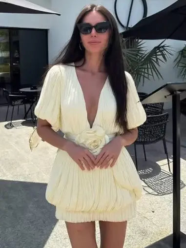 Mesh V-Neck Lantern-Sleeve Ruched Bubble Dress with 3D Floral Appliqué