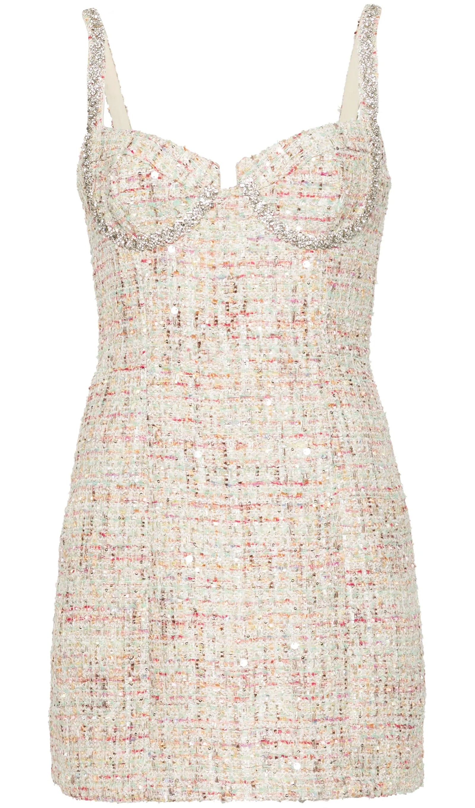 This Embellished Boucle Mini Dress features a multicolored bouclé design with sparkling sequin, crystal, and crystal embellishments. The dress also boasts a sweetheart neckline, sleeveless cut, and full lining for a sleek and comfortable fit. Completed with a straight hem and a rear zip fastening, this dress is perfect for any special occasion.
