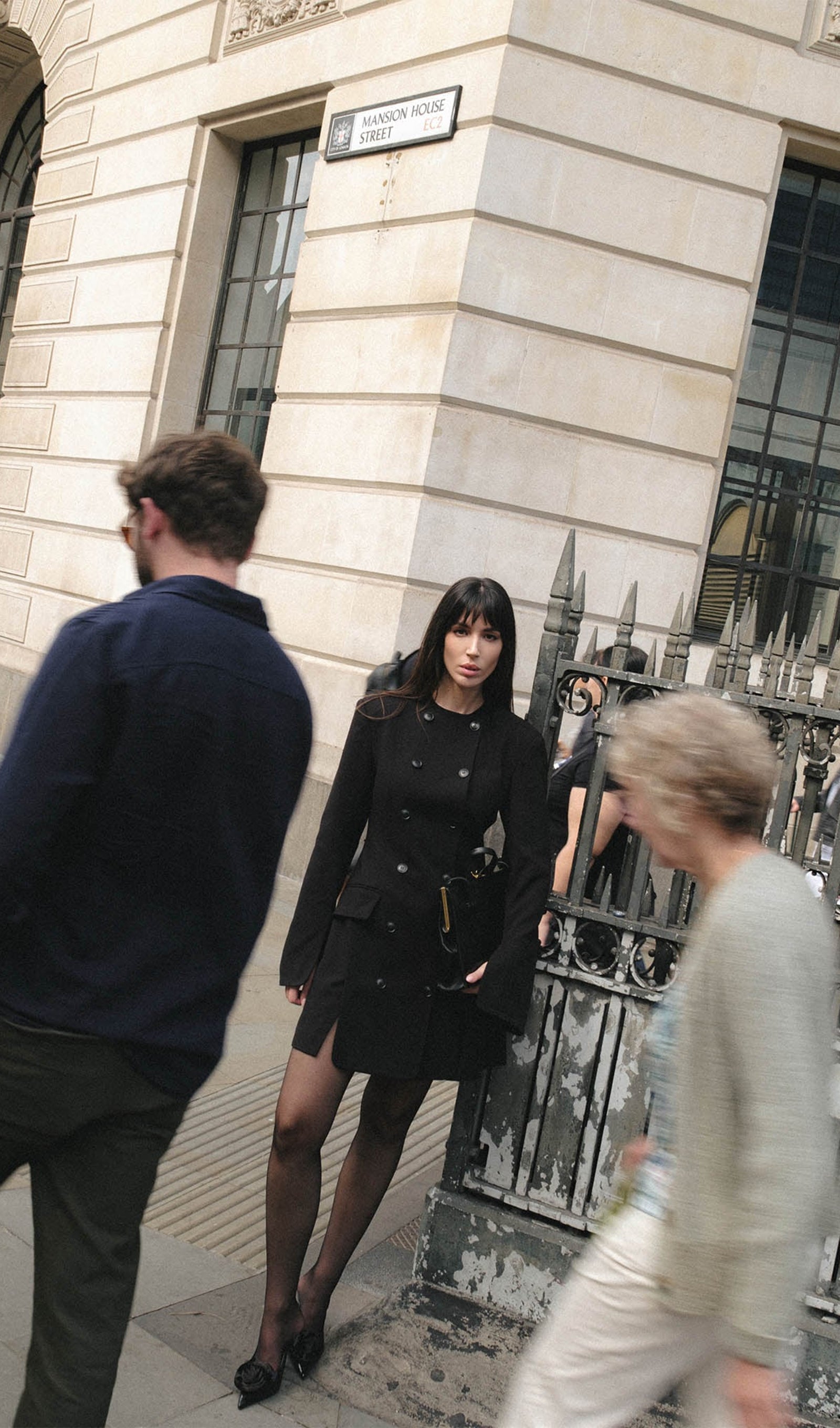 Demure fitted mini jacket dress with round neckline, straight long sleeves with slits on the cuffs and slightly flared skirt. The dress is made from dense suiting fabric and fastens with tonal buttons.
