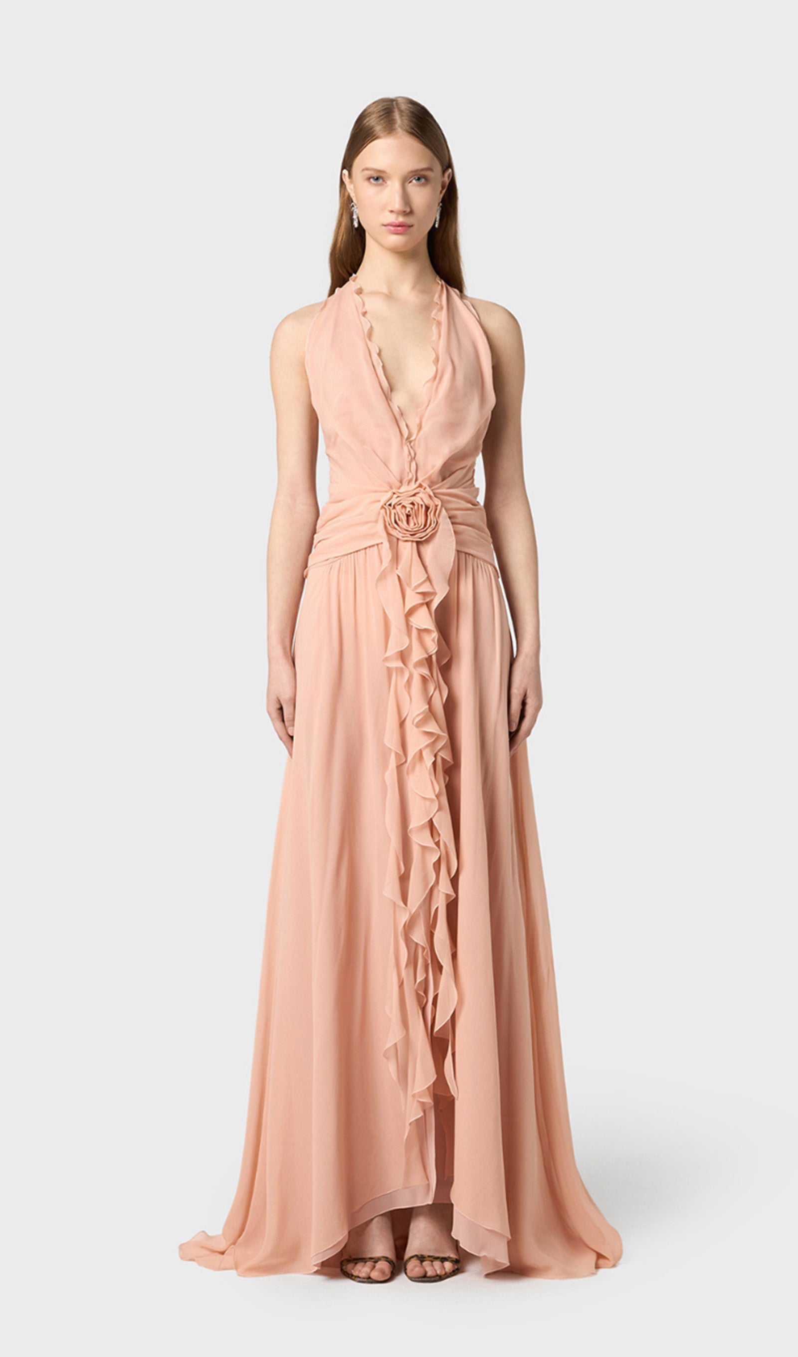 Elevate your style with our Halter Ruffles Rose Decoration Maxi Dress. Crafted from luxurious silk georgette, this dress features a deep halter neckline that accentuates your figure. The 3D rose design, created by draped sashes, cascades into ruffles at the hem for a unique and elegant touch.