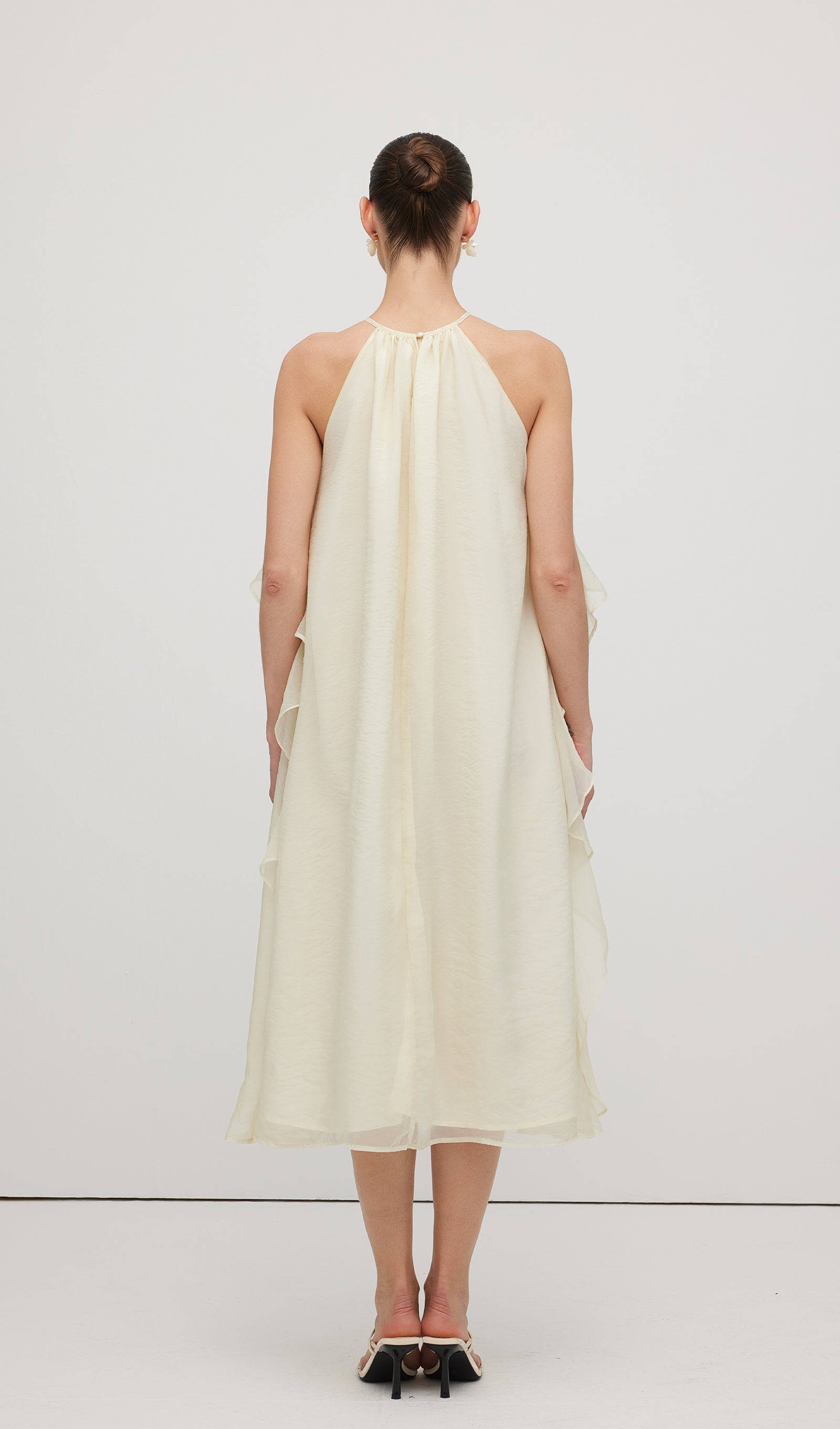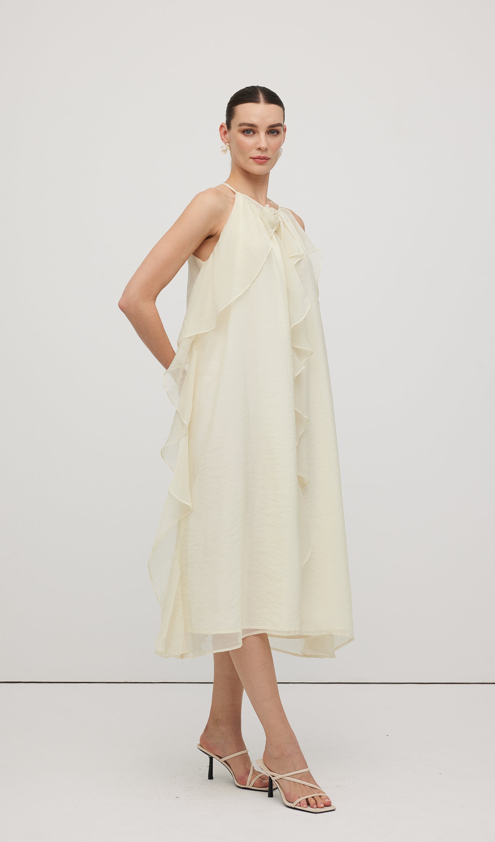 Elevate your style with our Halterneck Rose Detail Ruffle Midi Dress. The halterneck design and rose details give a touch of elegance, while the ruffle hem adds a playful touch. Made from high-quality materials, this dress is perfect for any occasion. Dress to impress with this must-have addition to your wardrobe.