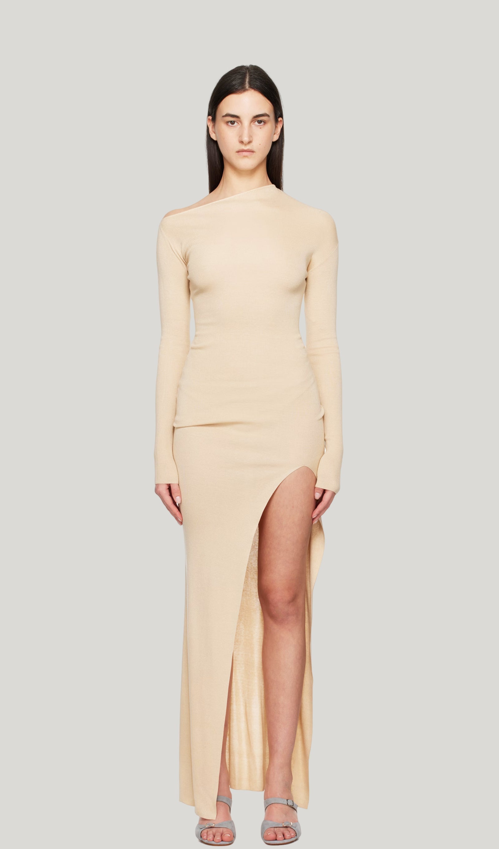 Experience effortless elegance with our Irregular Solid Slit Maxi Dress. Made with a ribbed knit material, this dress features an irregular boat neckline and curved slits at the front hem for a modern twist. Perfect for any occasion, this dress is sure to make a statement and turn heads.