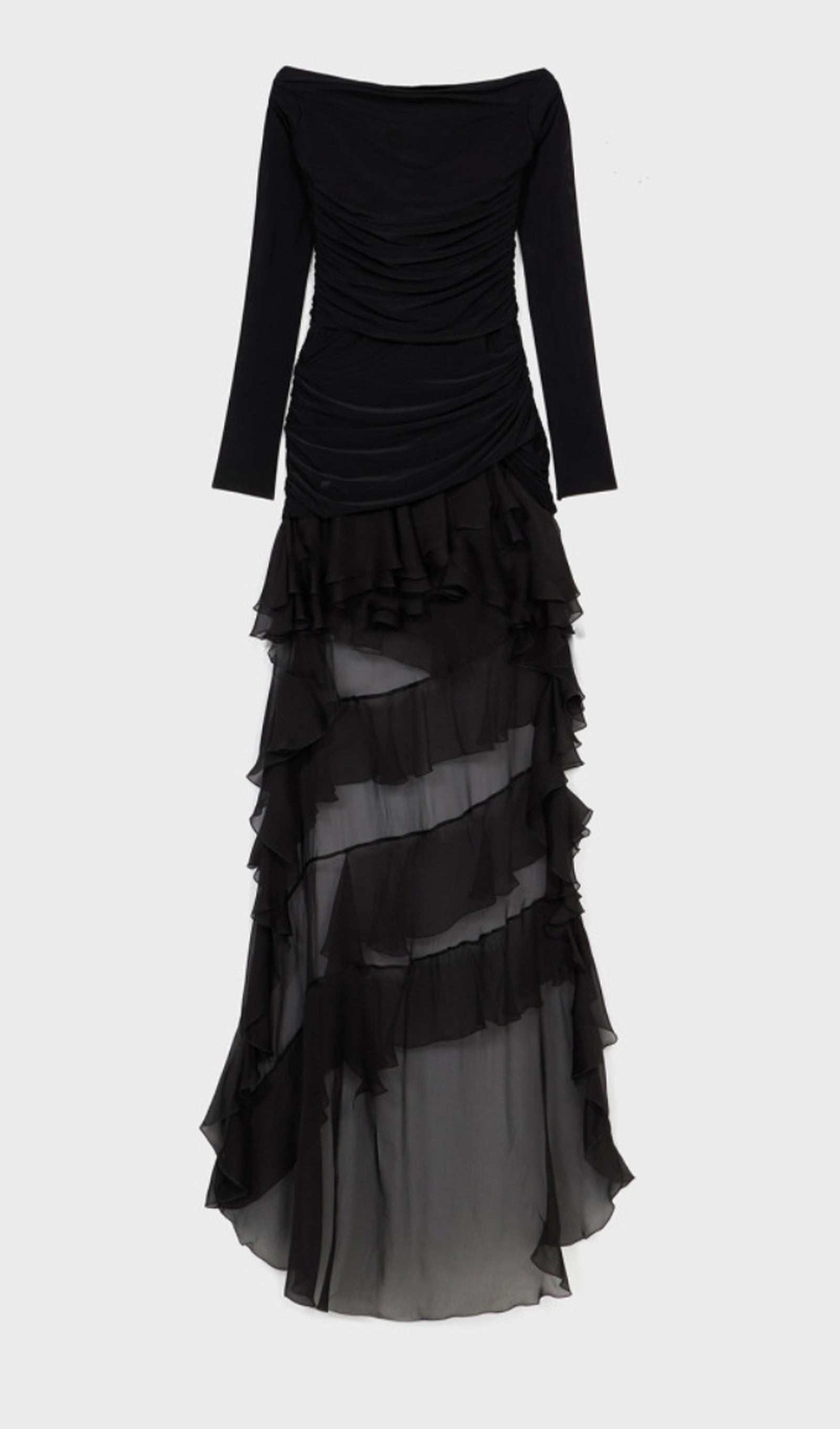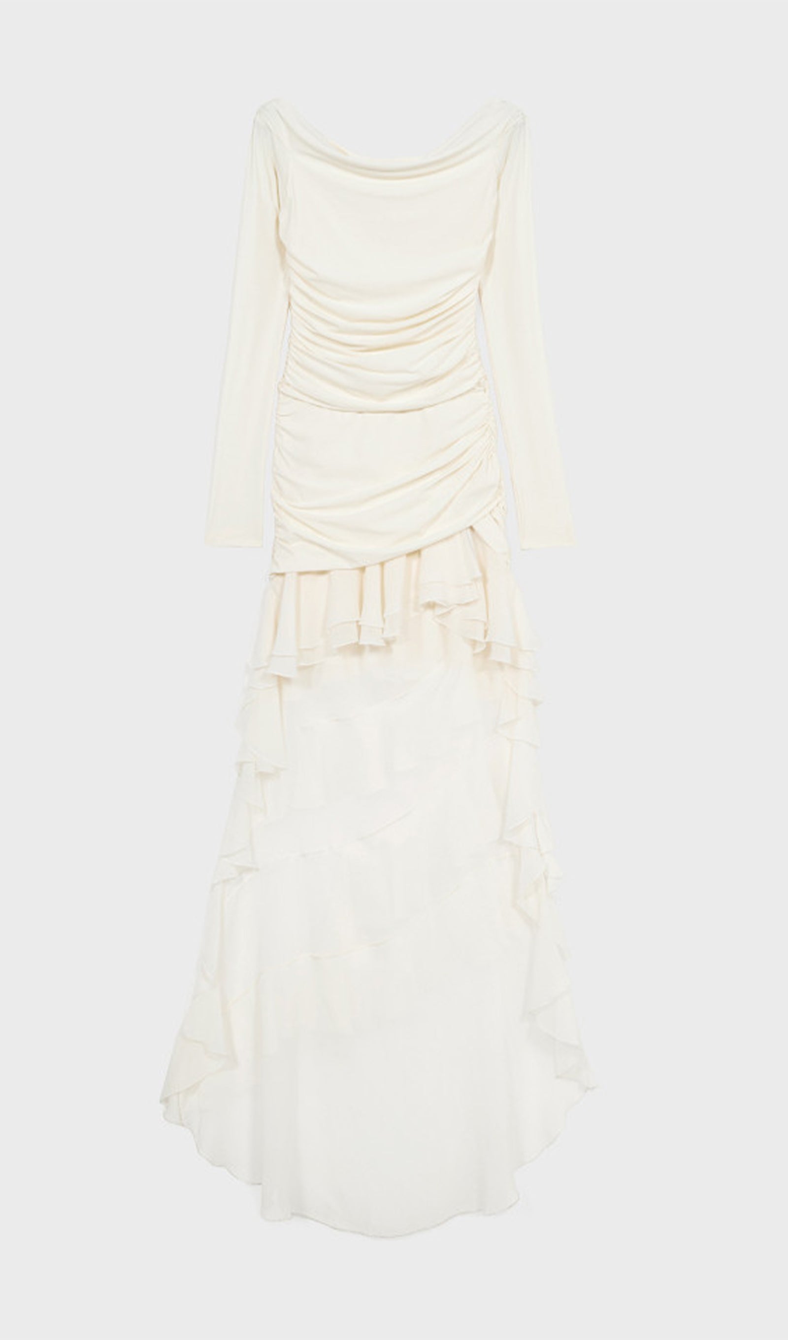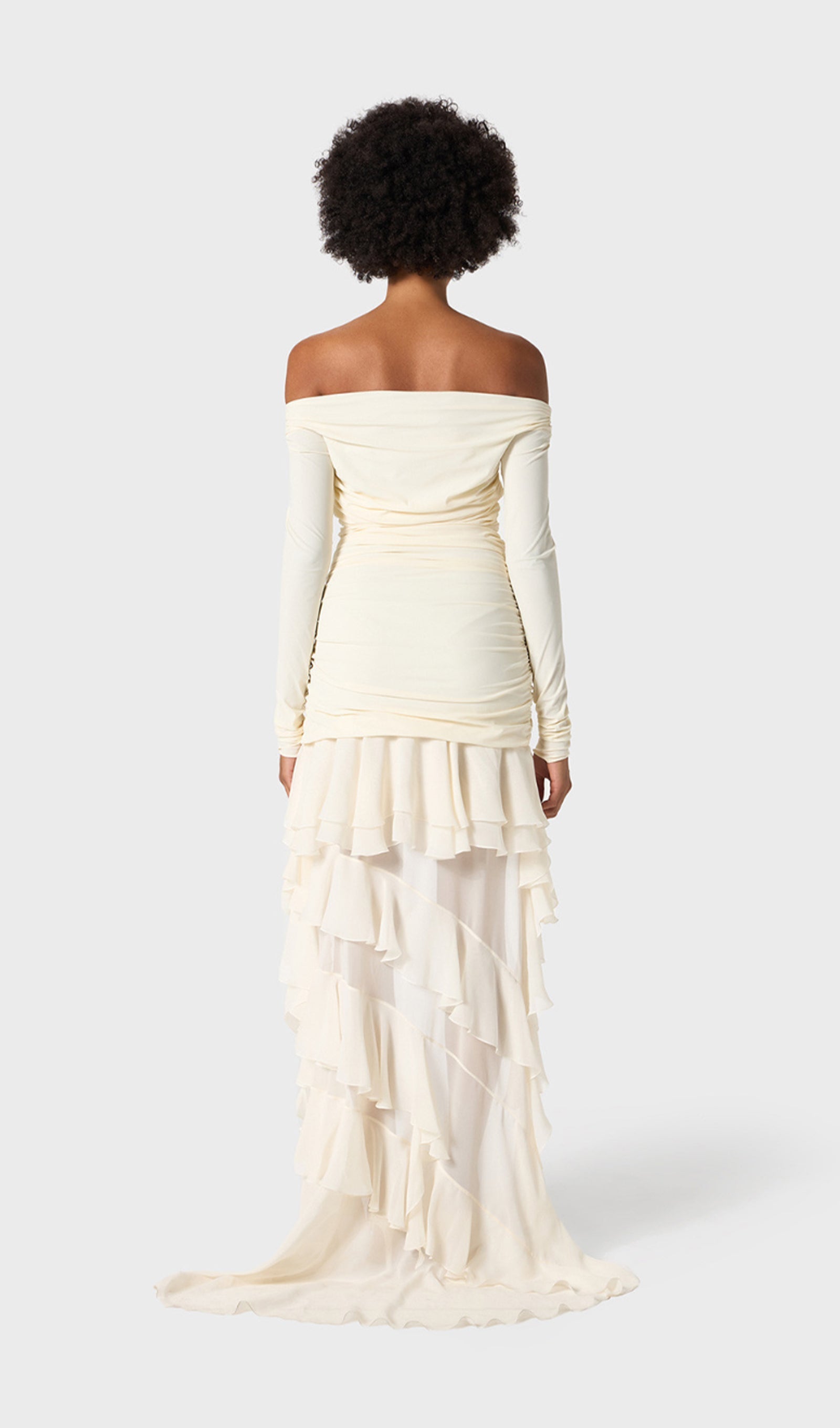 Expertly crafted with ruffled second-skin jersey and a chiffon train detail, this off-shoulder mini dress exudes playful proportions. A statement piece that will elevate your wardrobe, it offers a captivating blend of style and comfort. Add a touch of sophistication to any occasion with this stunning dress.