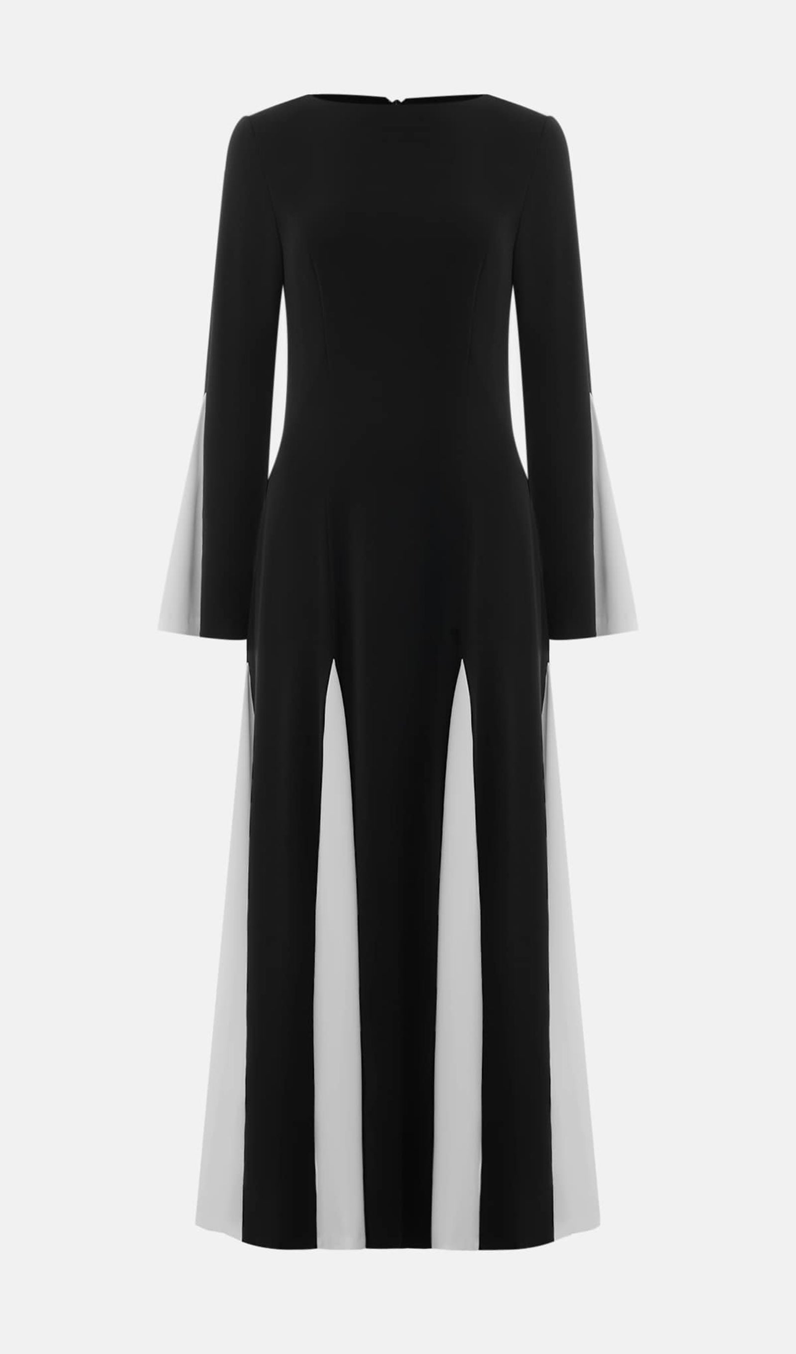 Sophisticated semi-fitted maxi dress with oval neckline, flared sleeves and flowing skirt, made from smooth jersey and completed with contrasting triangular inserts.