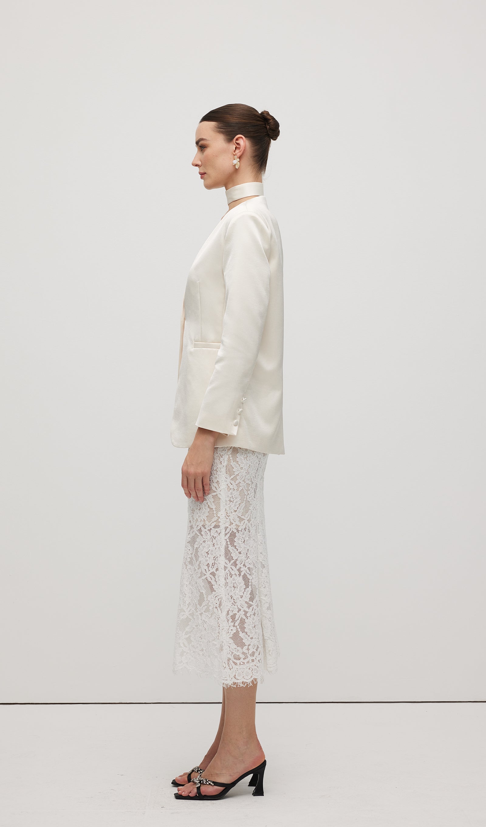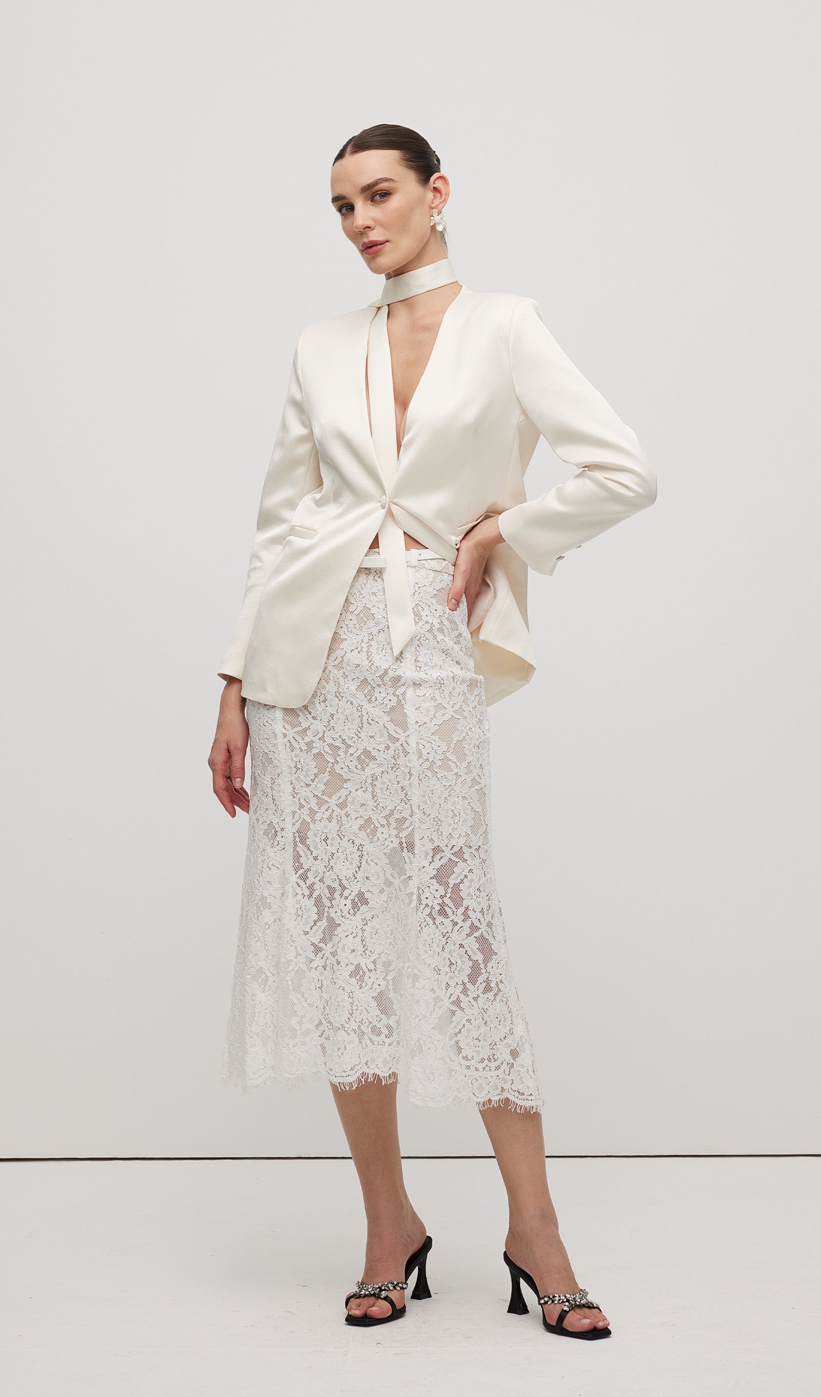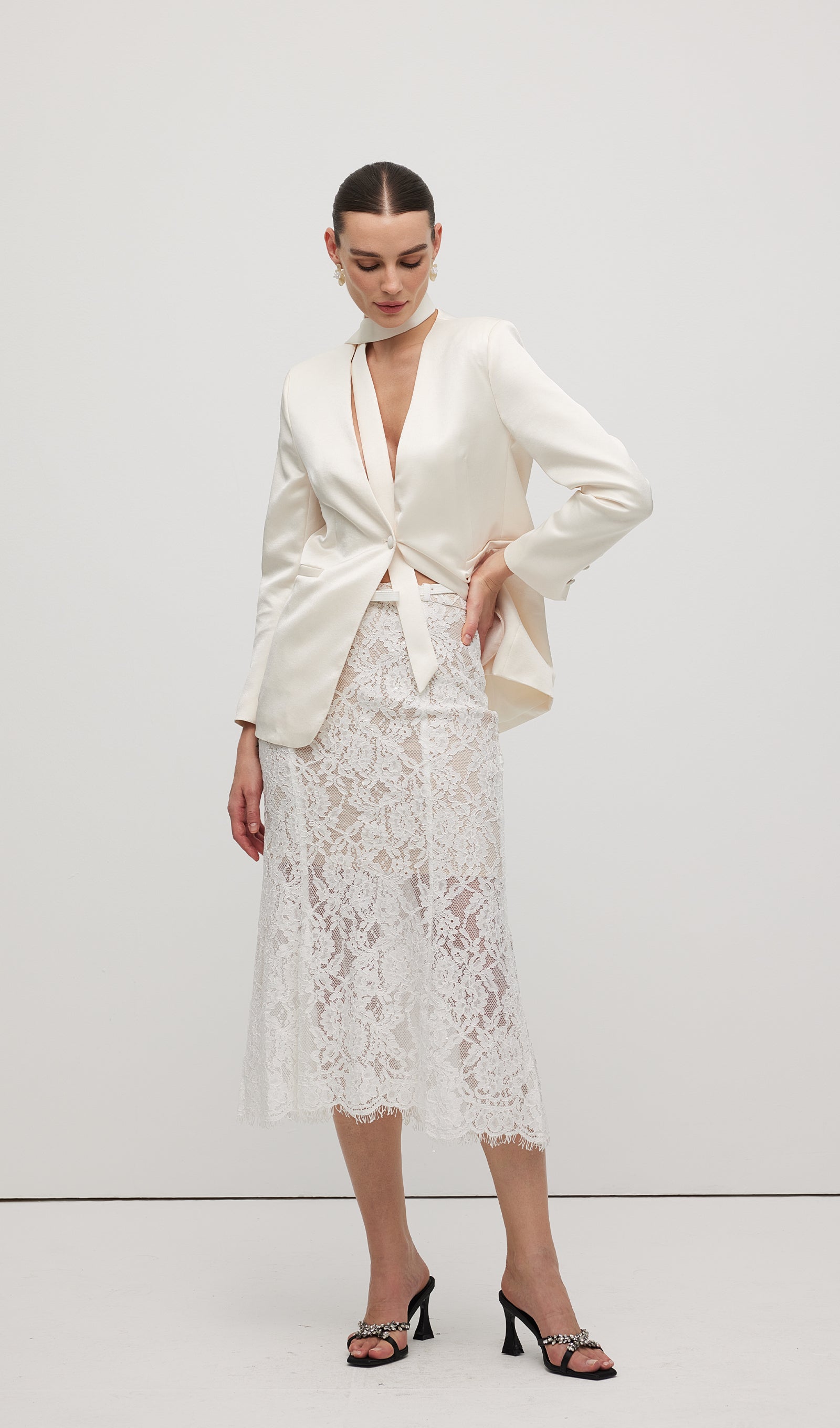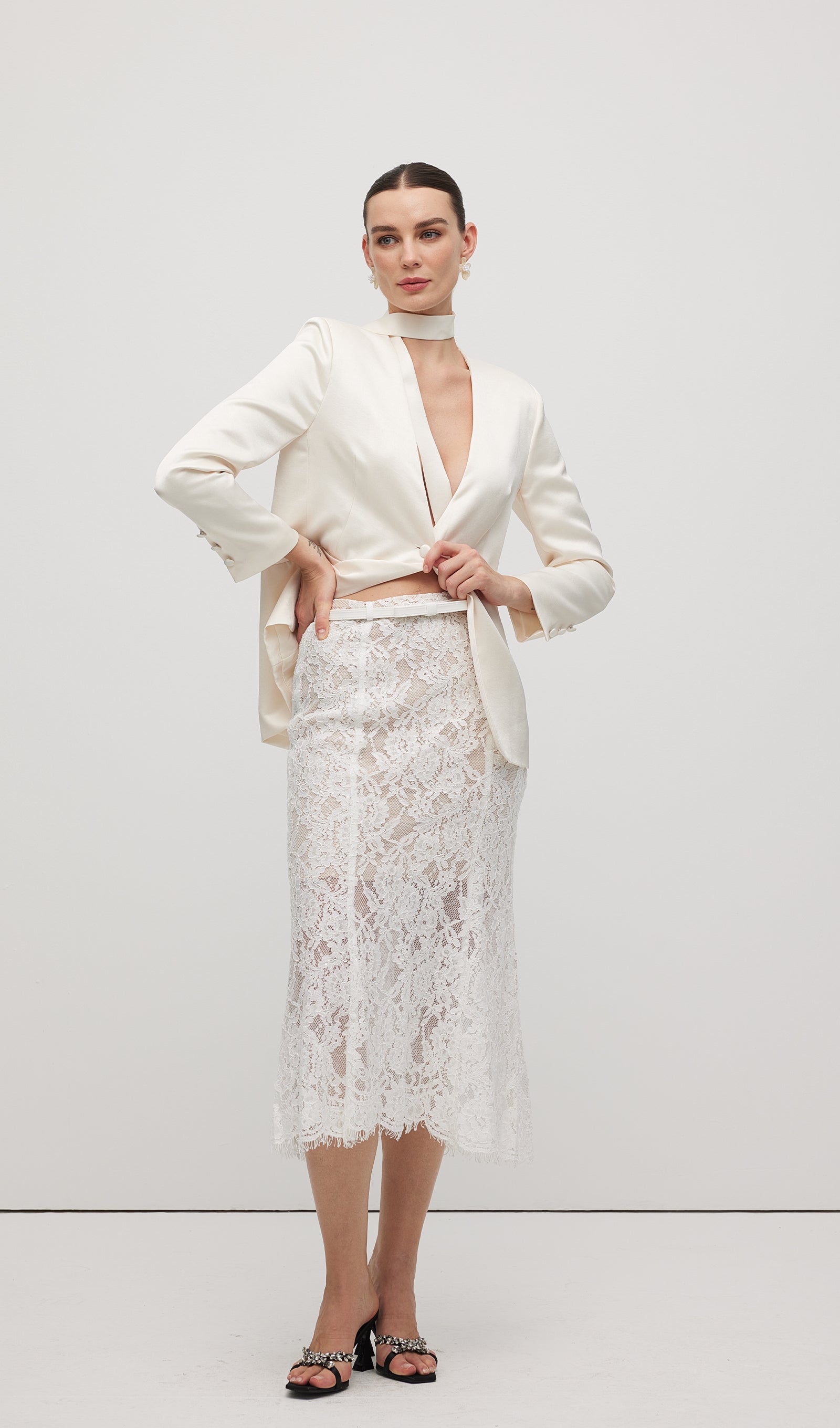 Made with intricate lace, this bodycon midi skirt is the perfect addition to any wardrobe. The form-fitting design accentuates curves while the elegant lace adds a touch of sophistication. Perfect for a night out or a formal event, this skirt is a must-have for any fashion-forward individual.