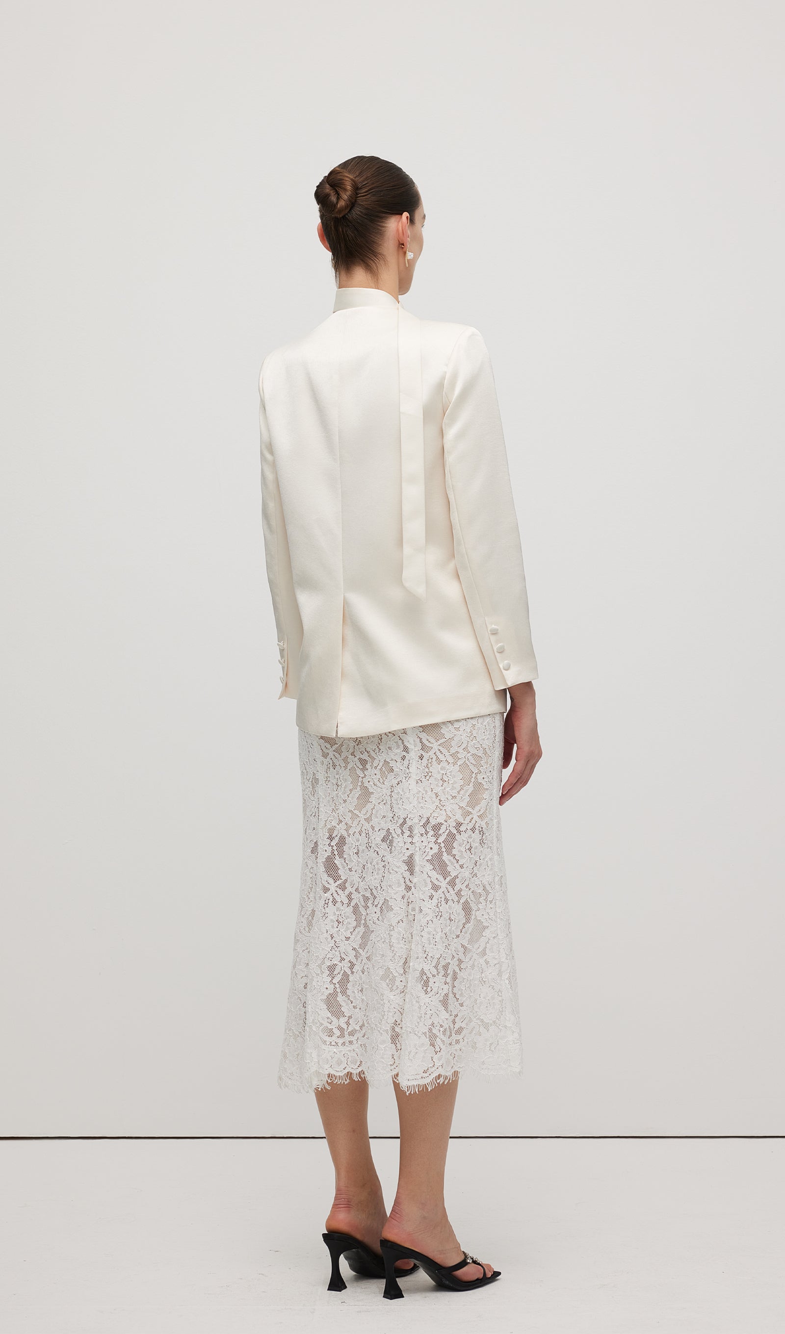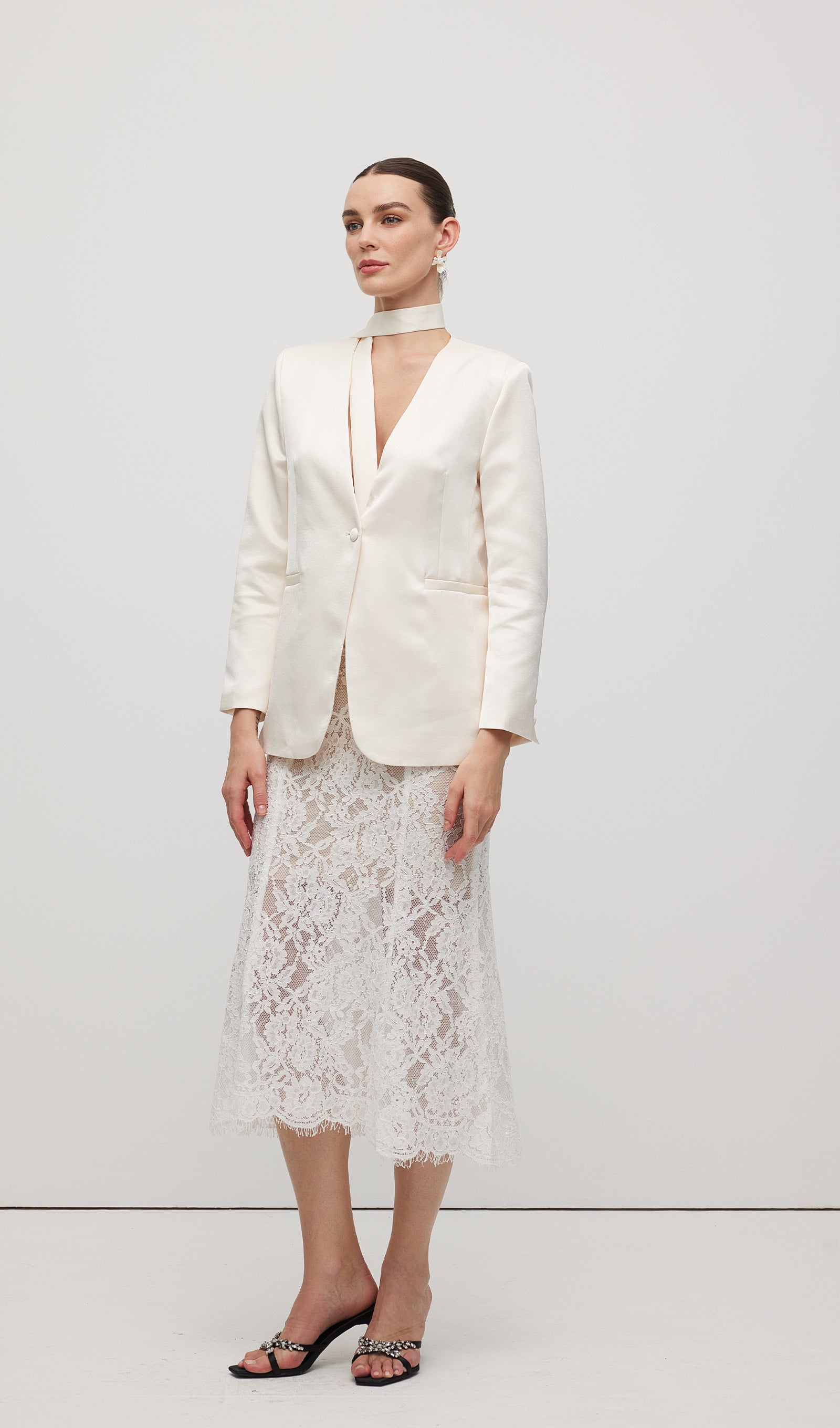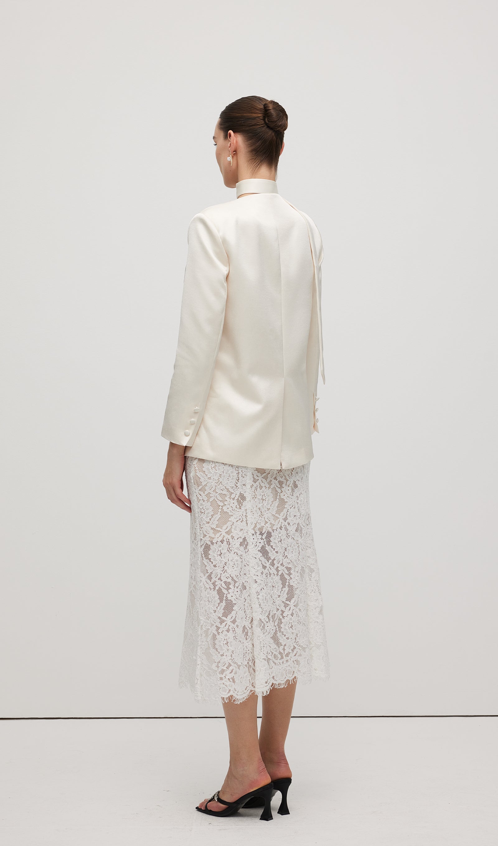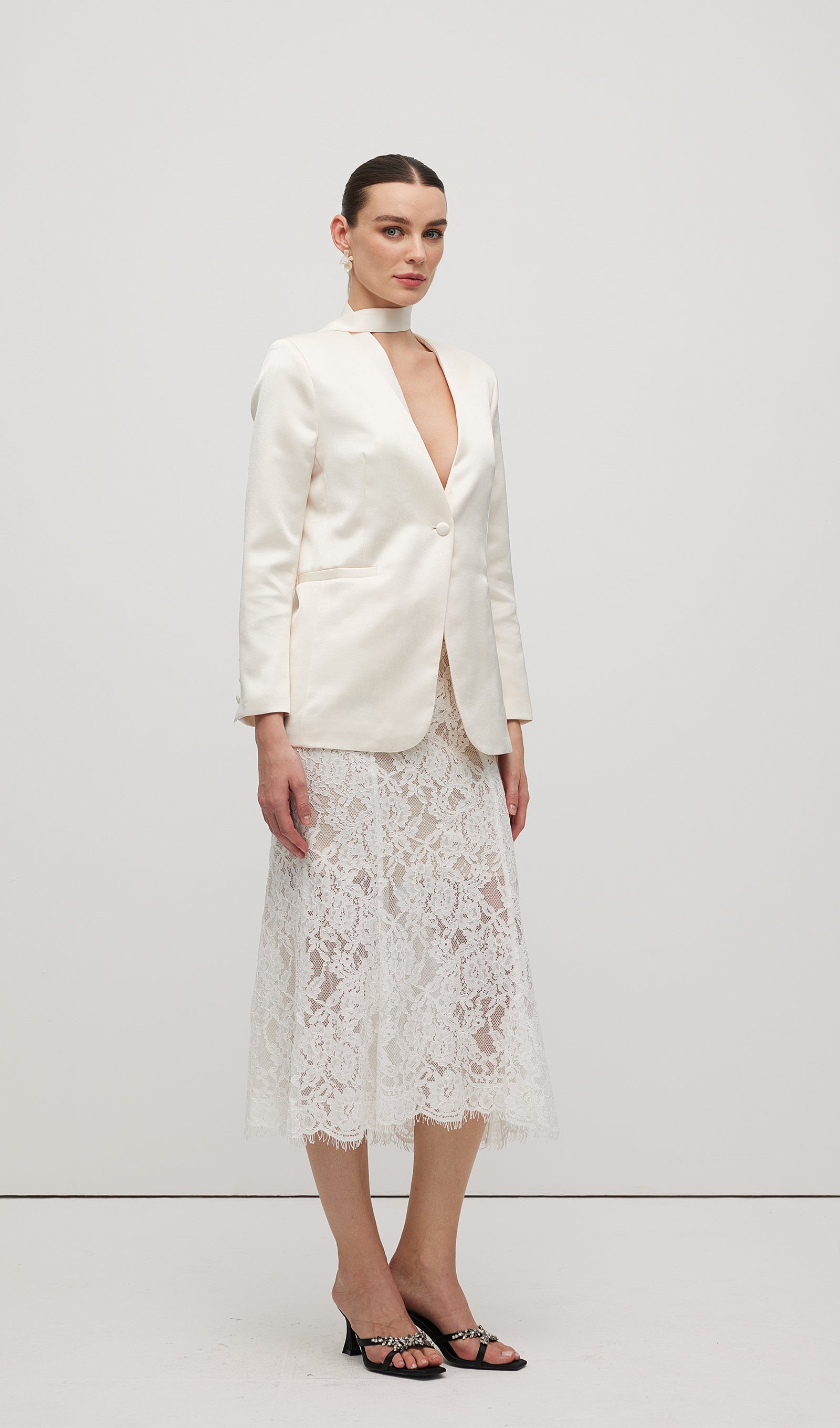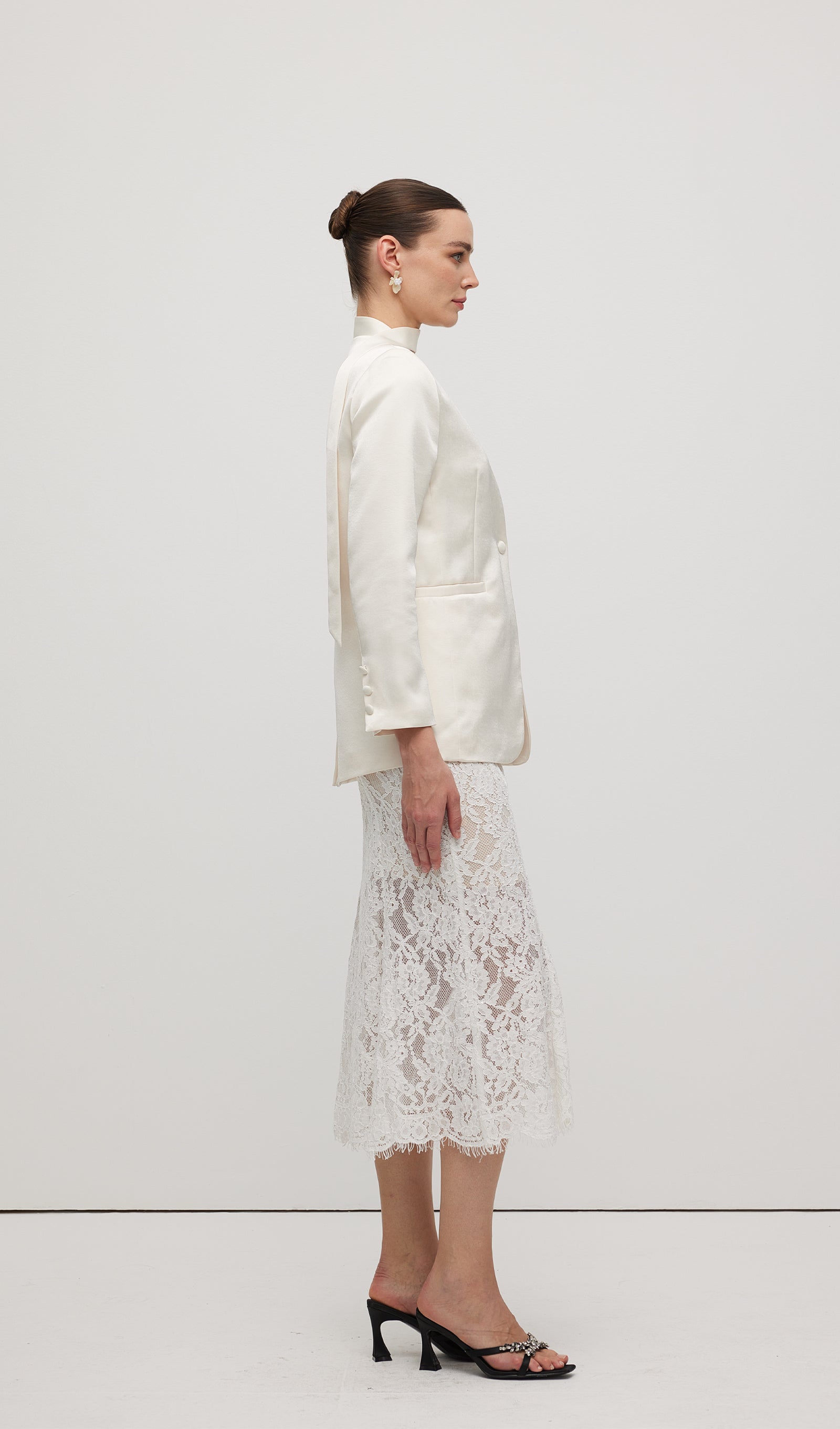 Made with intricate lace, this bodycon midi skirt is the perfect addition to any wardrobe. The form-fitting design accentuates curves while the elegant lace adds a touch of sophistication. Perfect for a night out or a formal event, this skirt is a must-have for any fashion-forward individual.