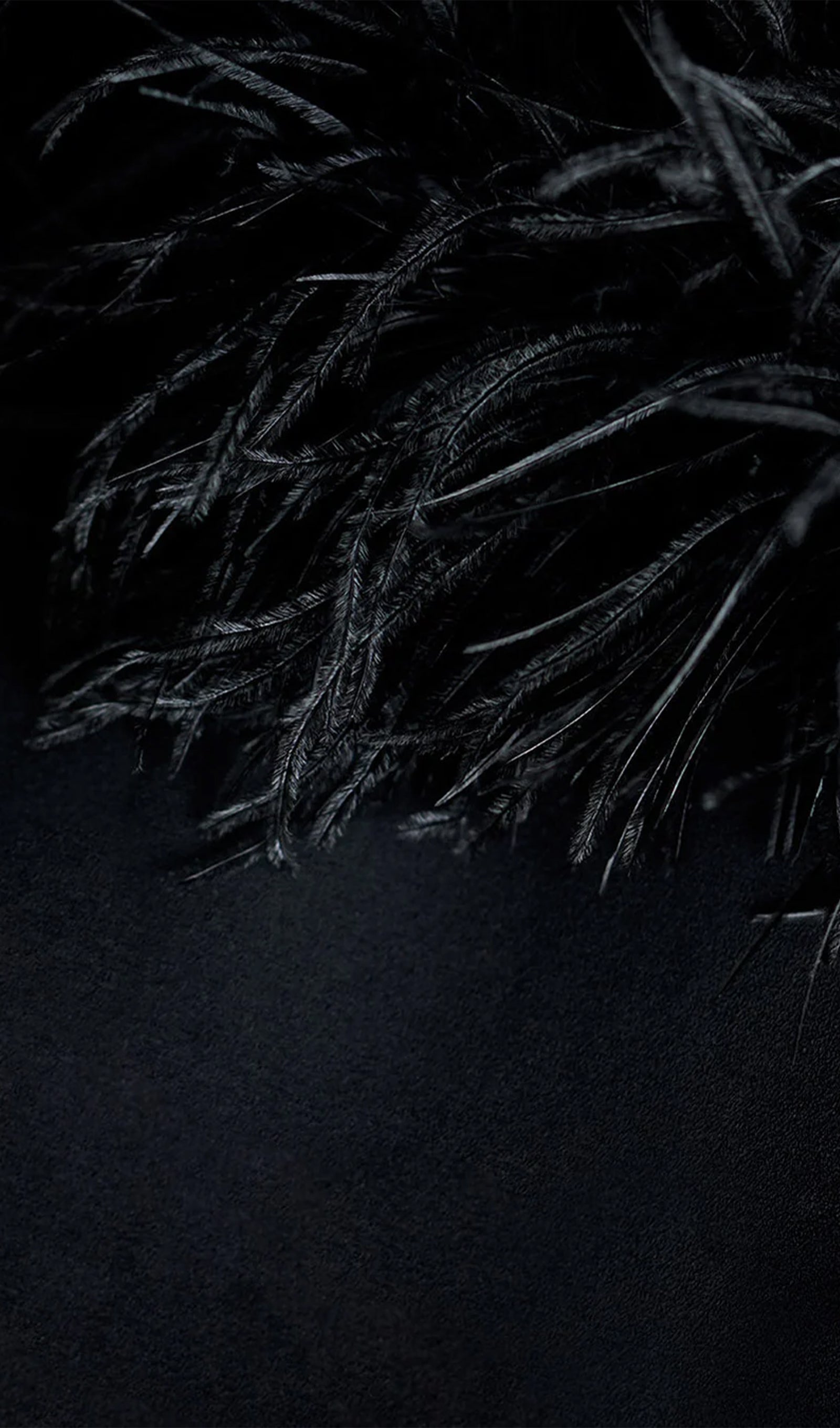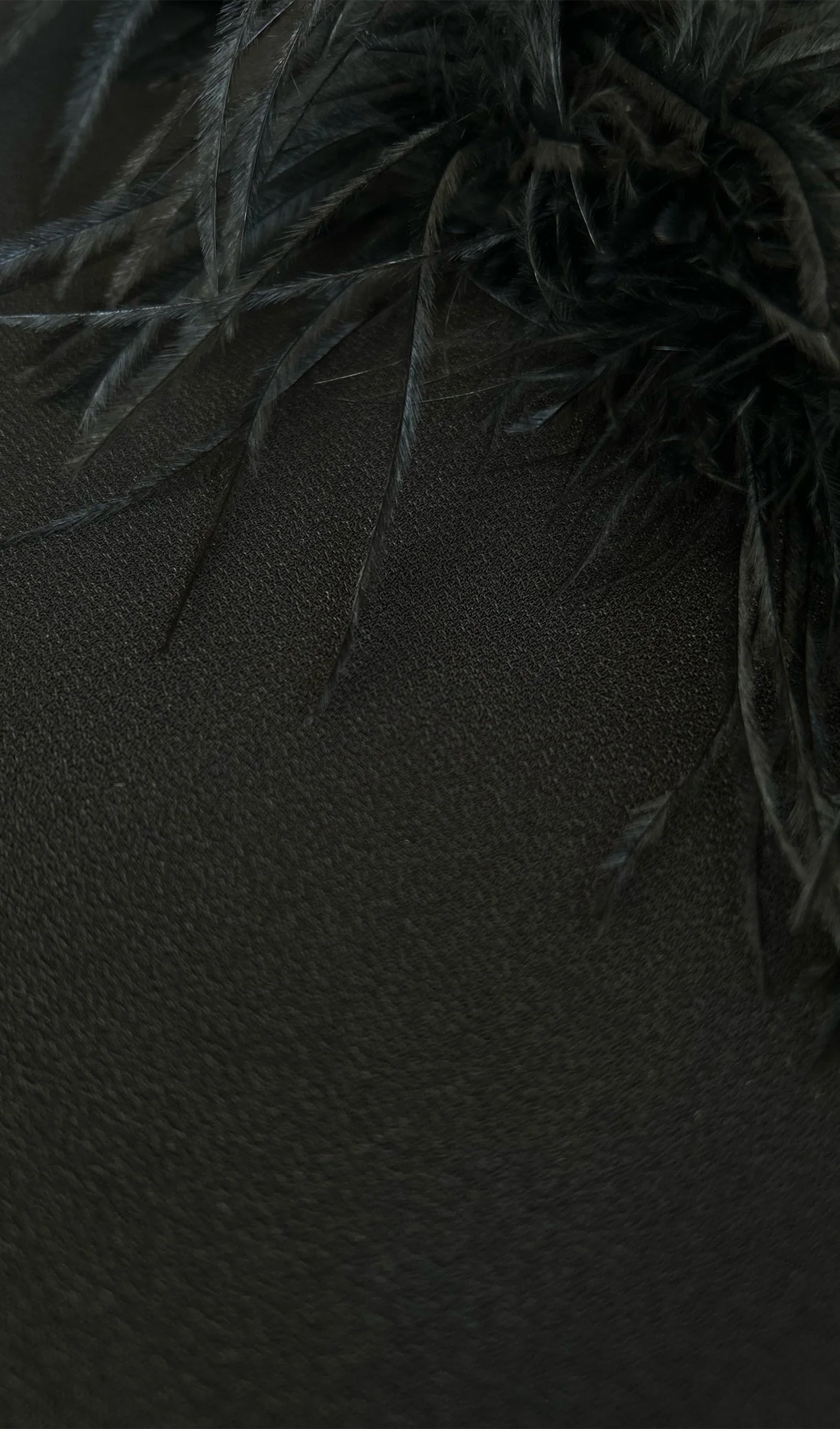 All of the feathers are 100% ostrich feathers. They are produced with full commitment to the framework of sustainable production and are supplied from certified farms. Store in a cool and dry environment. Since the feathers are not synthetic, it is expected that some amount of shedding will occur. All of the feathers are hand stitched to the dress. Before handing over the dress for dry cleaning, the feathers should be removed and sewn again after the dress has been cleaned.