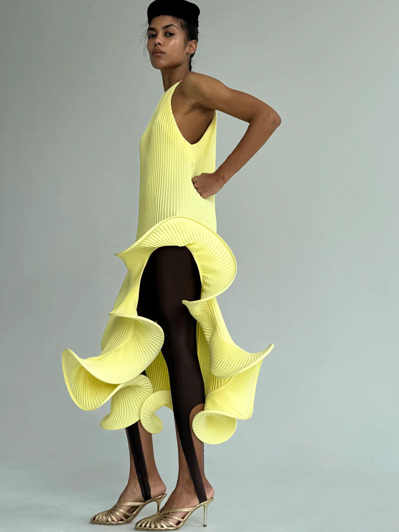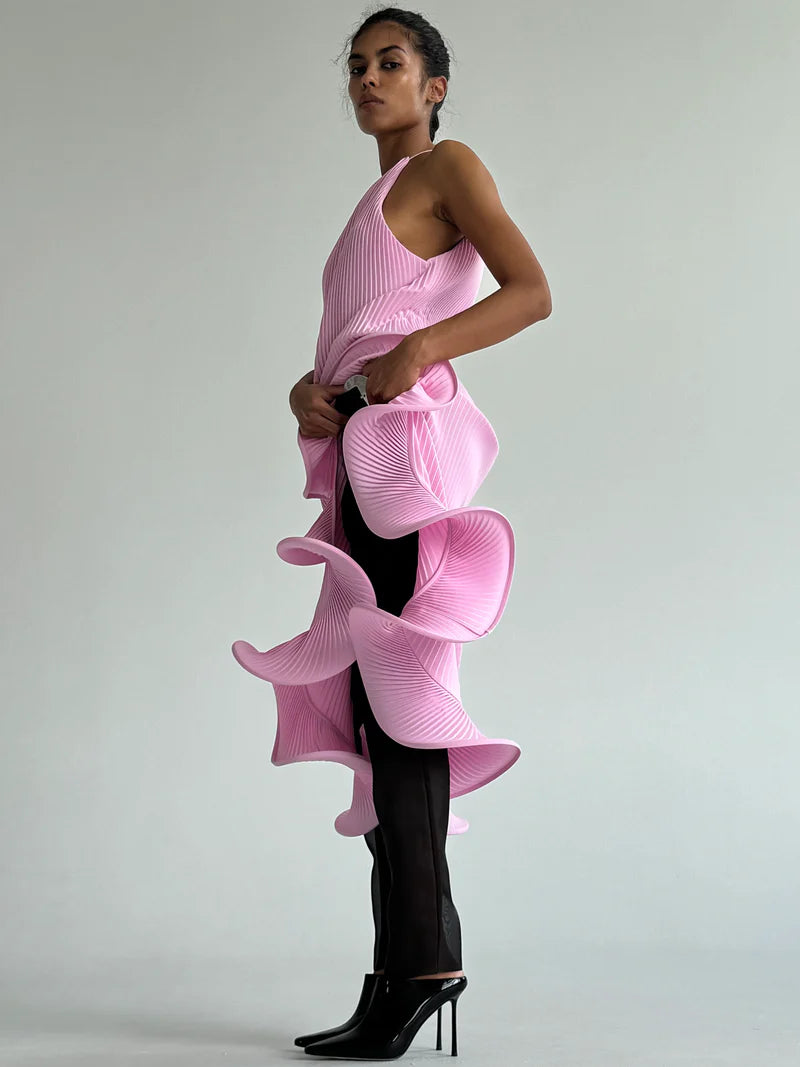 Sleeveless Smocked Floral Ruffled Wave Hem Dress