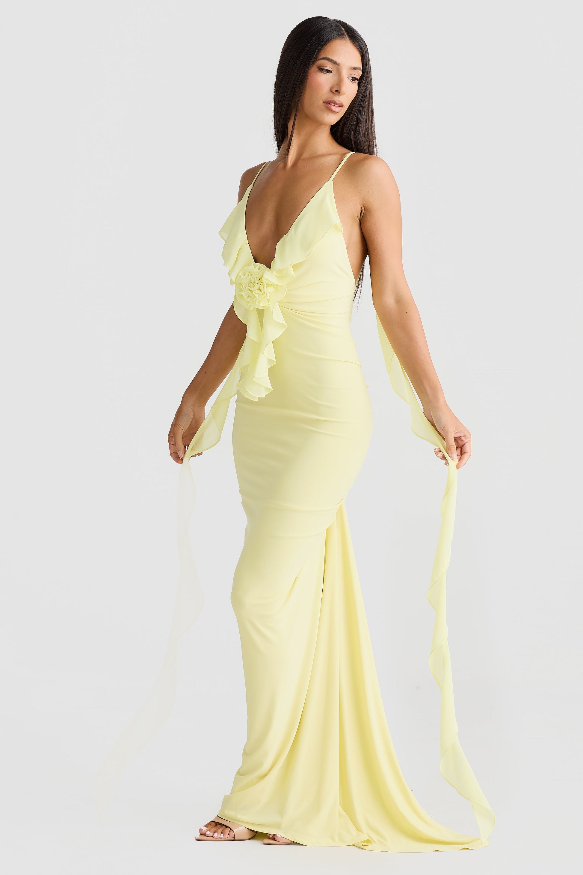 The Daniela Dress features a plunging neckline with a fixed front flower and ruffle detailing. It is fully lined and double layered with adjustable straps. Perfect for spring and summer events, it is lightweight and floor length with back ruffles.
