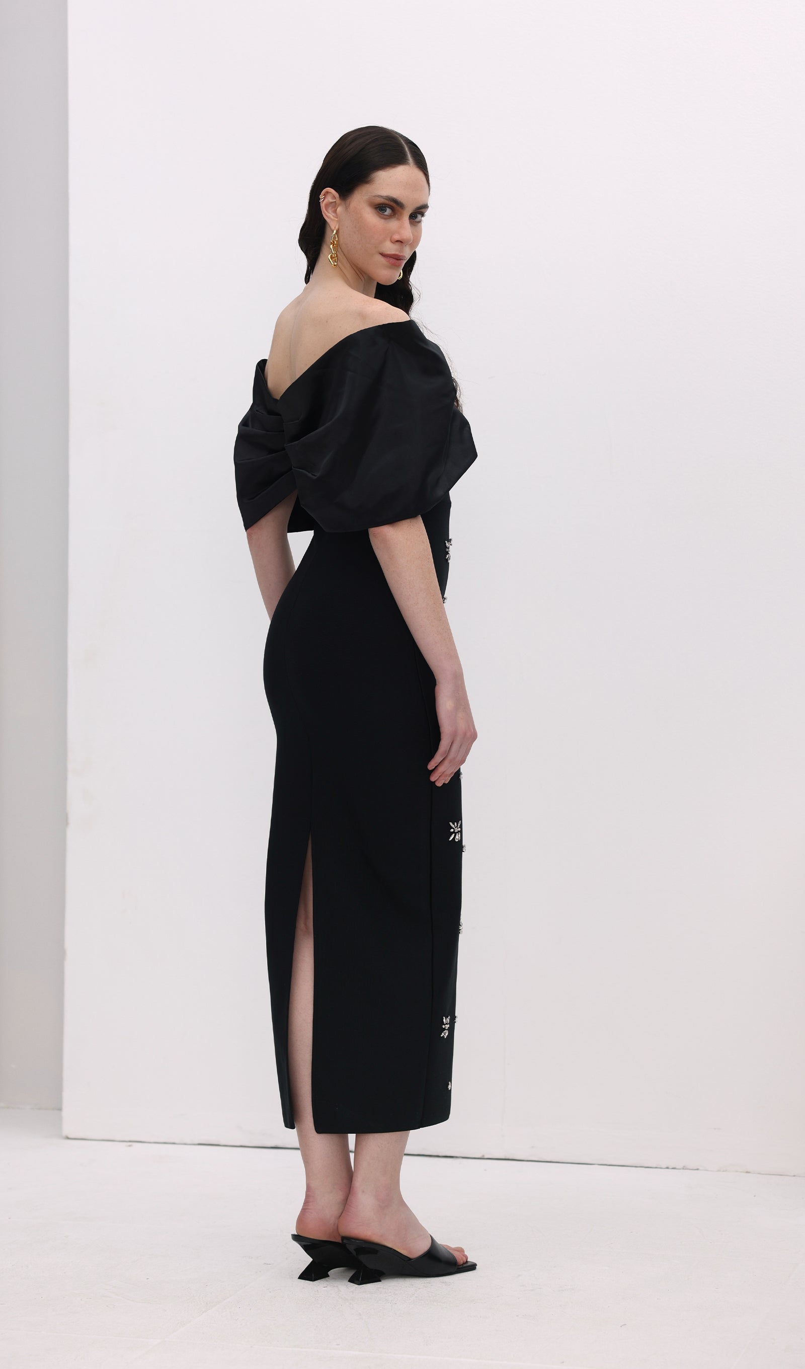 Elevate your style with our Off Shoulder Diamond Midi Dress. The stretch at the bust, waist, and hips effortlessly conforms to your body for a graceful fit. Perfect for any occasion, this dress guarantees comfort and elegance.