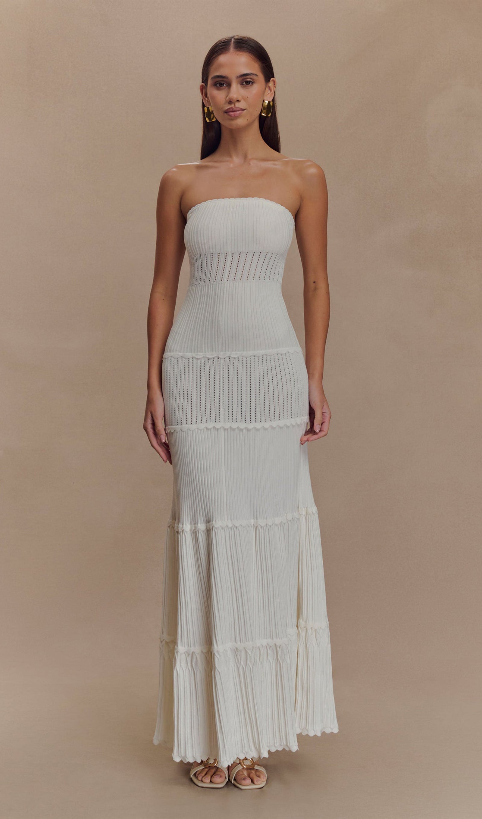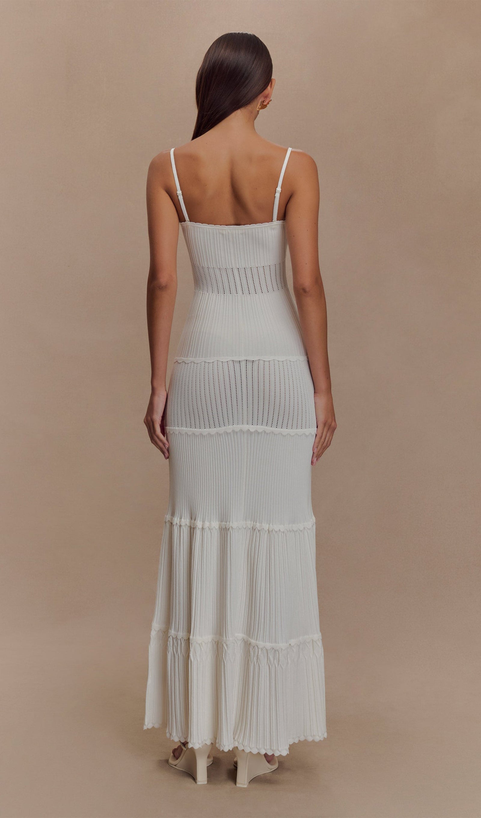 The Pointelle Knit Maxi Dress is the perfect blend of delicate texture and timeless elegance. Designed for versatility, it can be worn with or without straps, offering a customisable look to suit any occasion. The slip dress silhouette drapes effortlessly, while a small ribbed waist panel subtly defines the shape. Scallop trim details inserted into tiered seams add a touch of femininity, enhancing the dress’s soft, flowing movement. Crafted in an unlined knit for a lightweight feel, this dress is a dreamy choice for sunlit days, romantic evenings, or effortless resort styling.