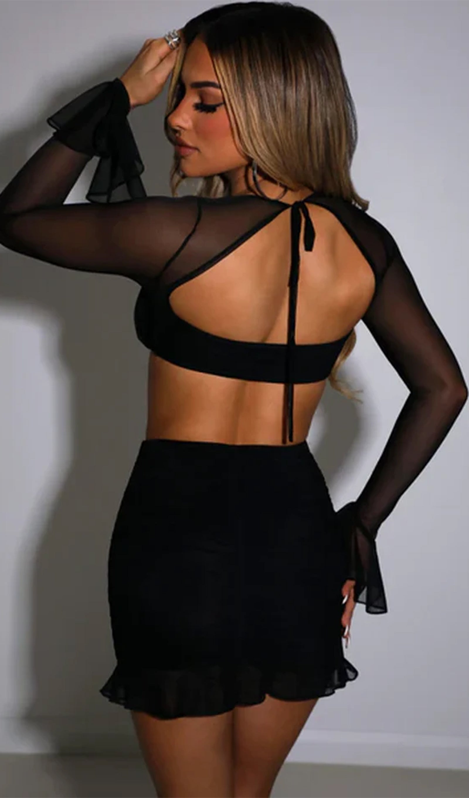 This is our go-to set this season, The sheer mesh sleeves extend and flute out for a feminine feel, plus the underwired cups enhance the bust for the most amazing cleavage. Cut from premium power mesh with lots of stretch, the design is ruched and double lined to mould around your curves. The sits high on the waist and is complete with a sheer frill to the hem.