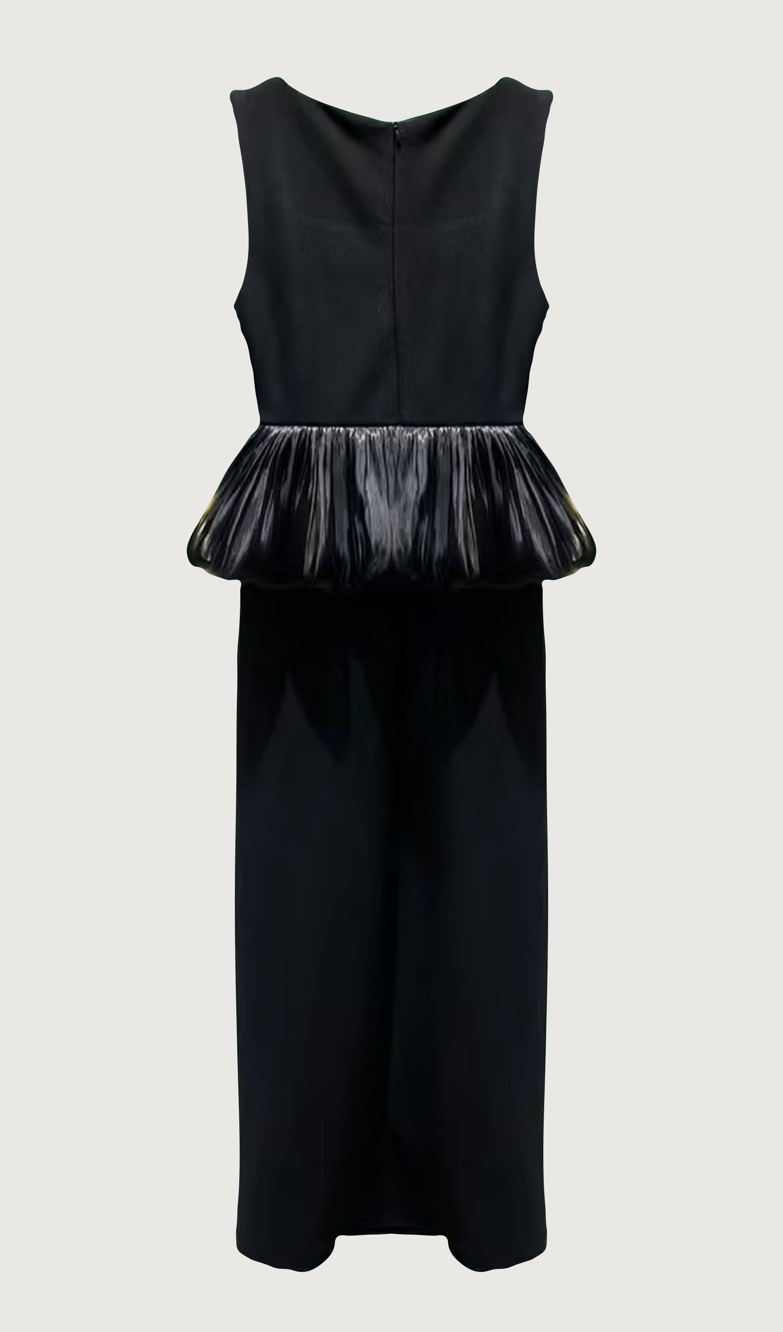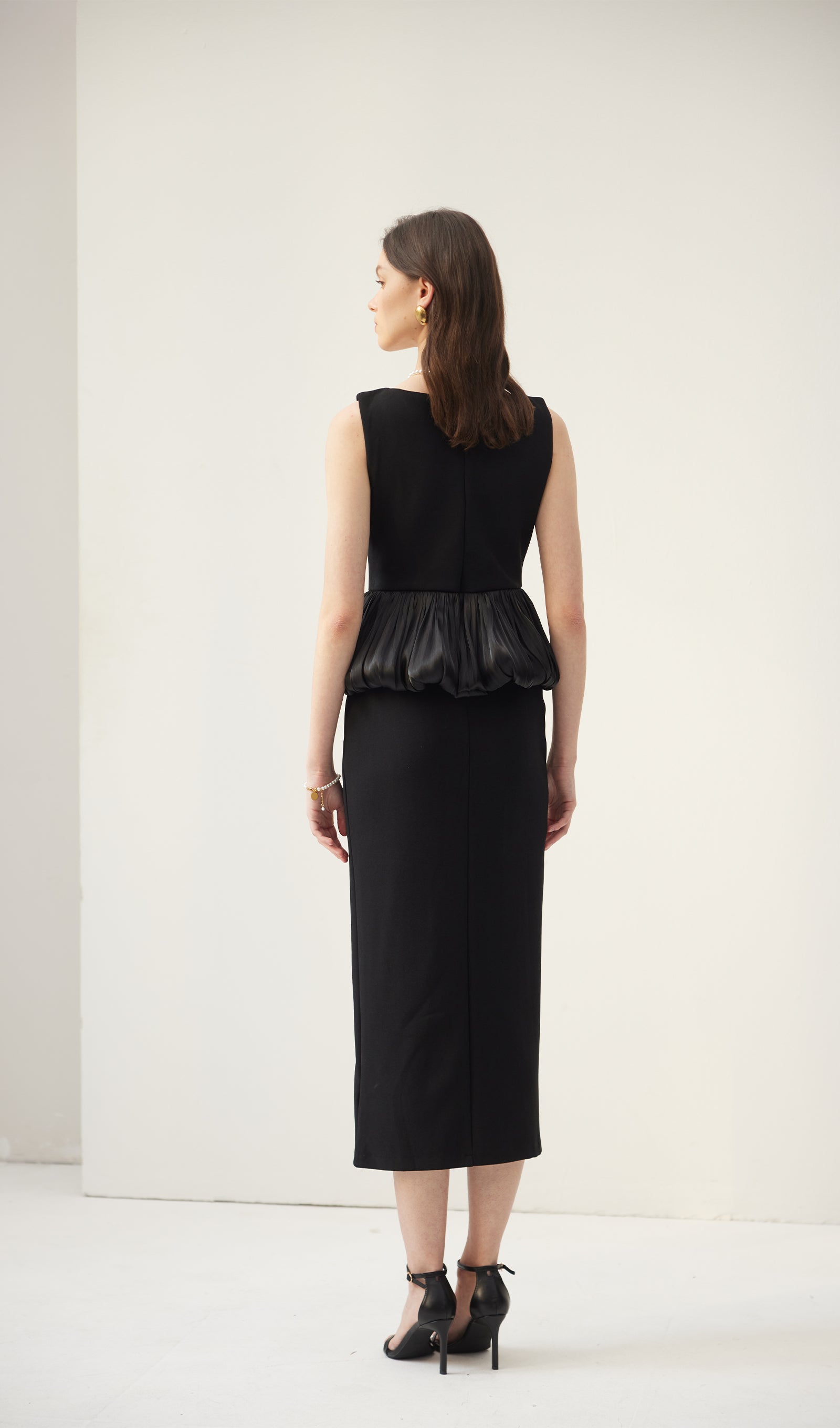 Expertly crafted, this Ruffle Hem Slit Midi Dress in Black offers an elegant and sophisticated look for any occasion. With its stylish ruffled hem and flattering midi length, this dress is sure to turn heads. The subtle side slit adds a touch of allure, making it the perfect addition to your wardrobe.