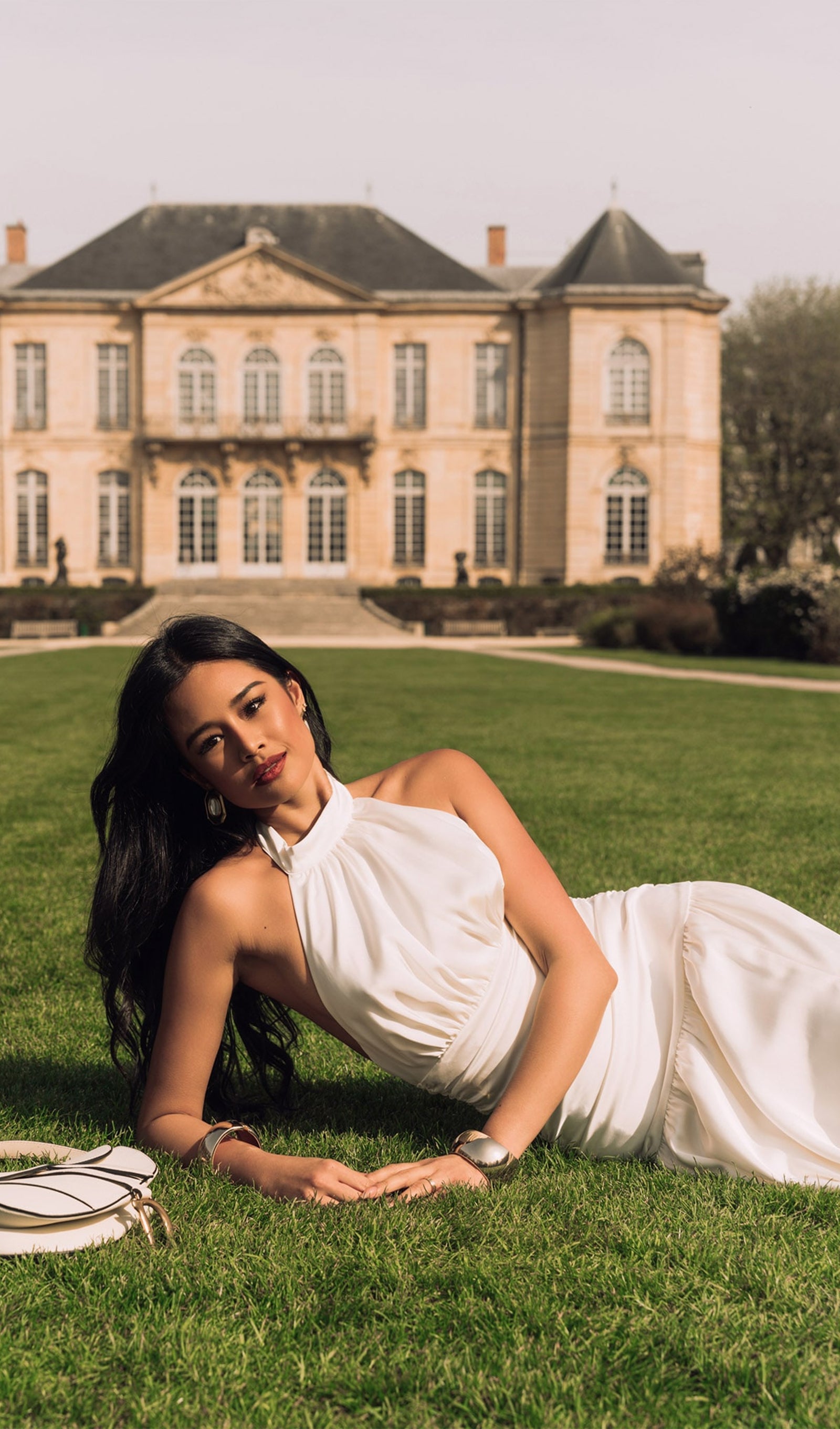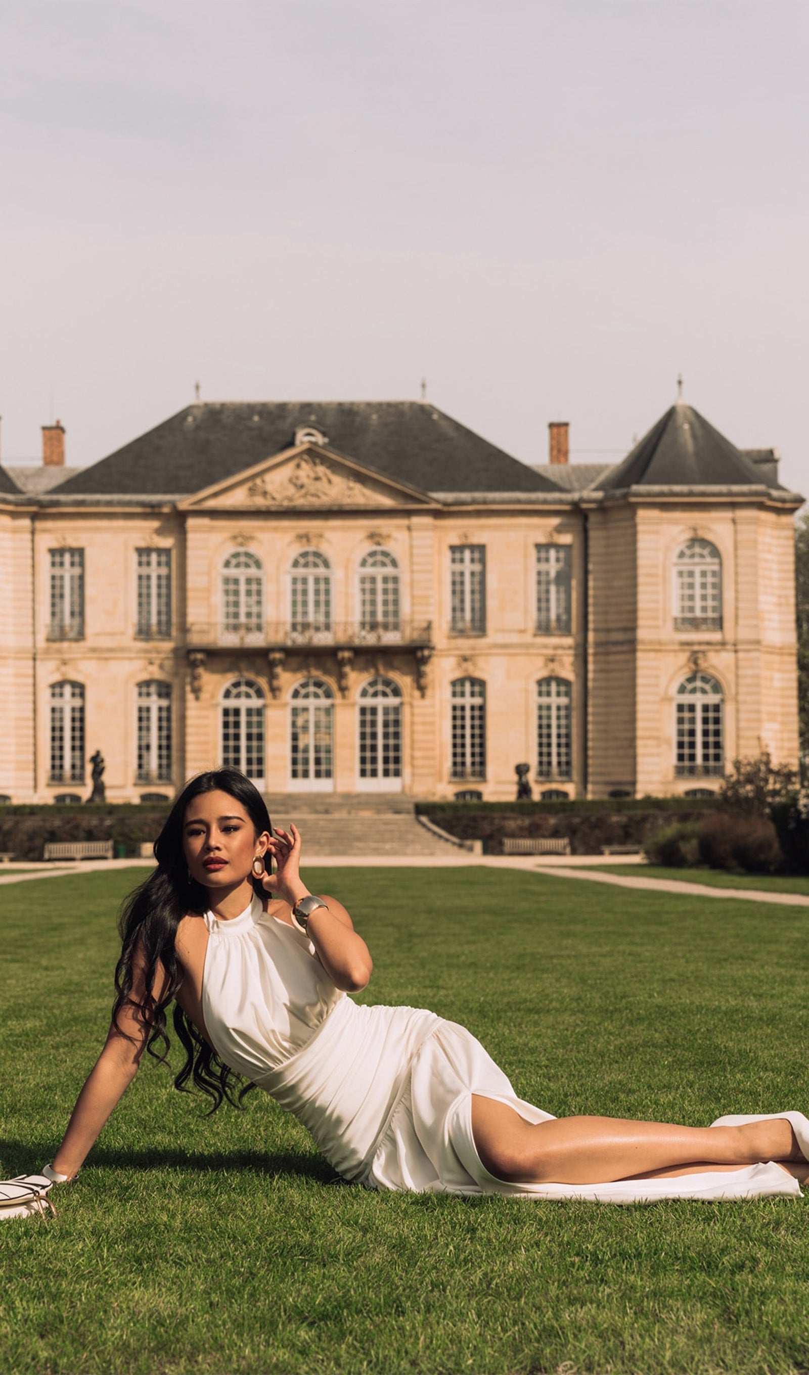 Elegant maxi dress with halter collar and fitted bodice with delicate draperies, and flowing flared skirt with a high slit at the front.