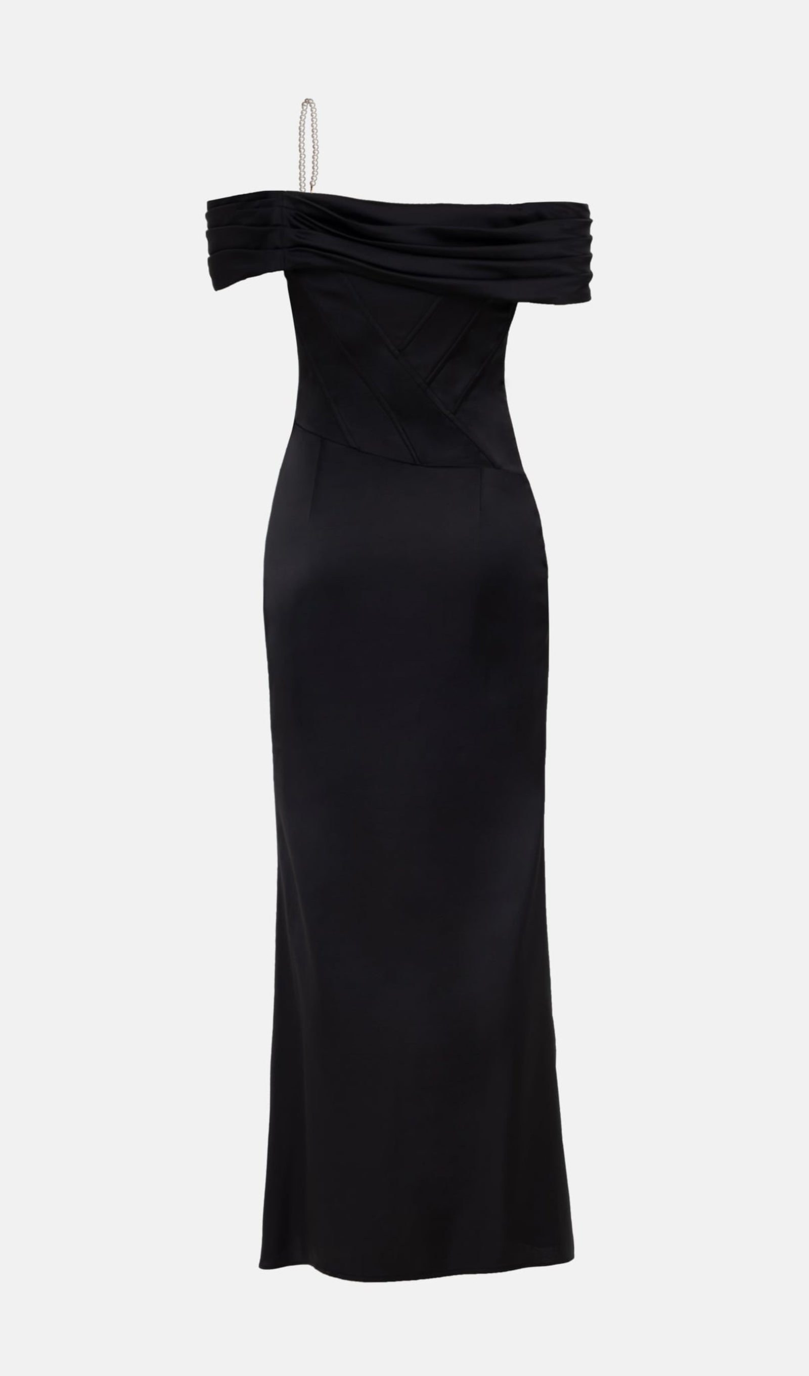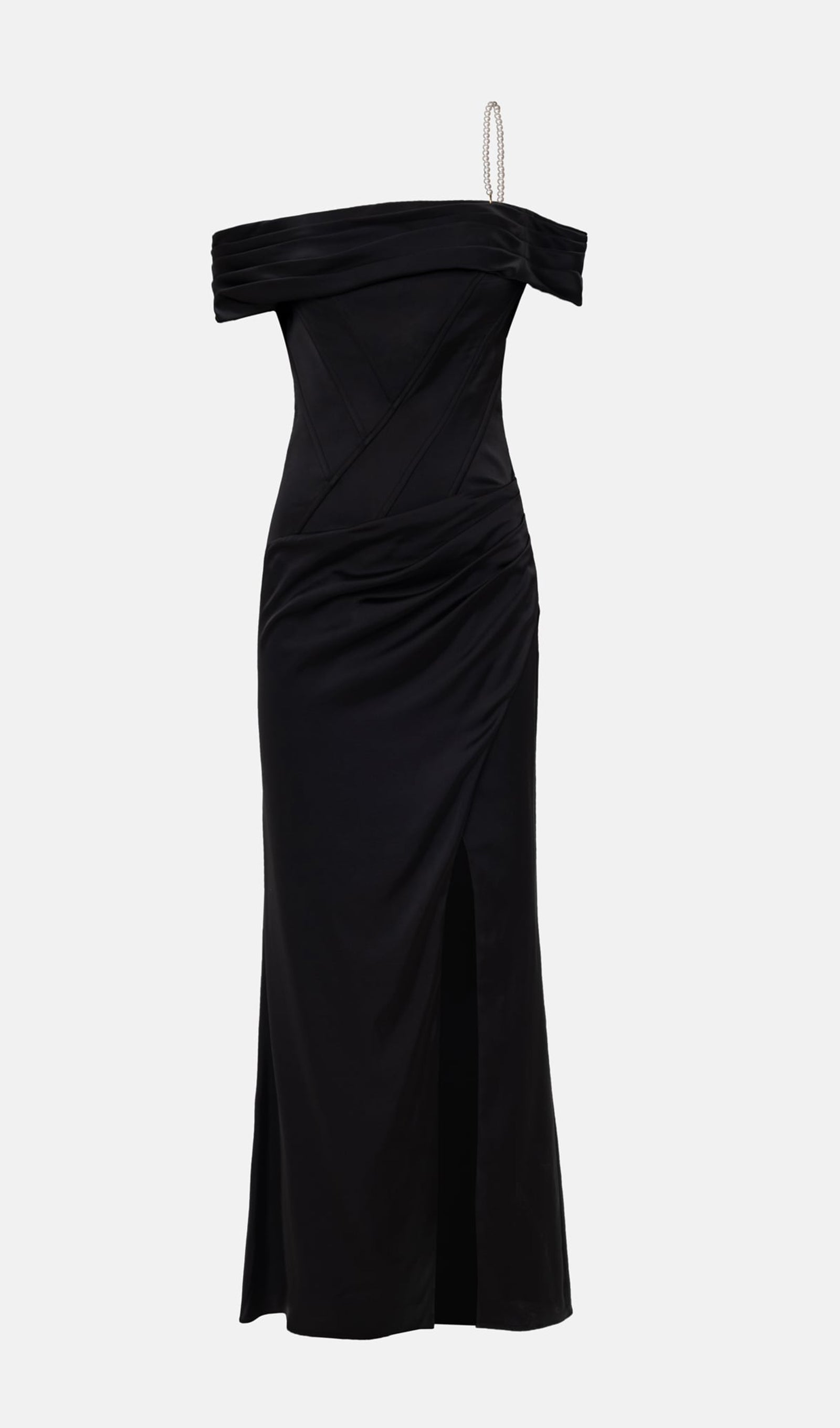 Satin Off Shoulder Diagonal Boning Maxi Dress