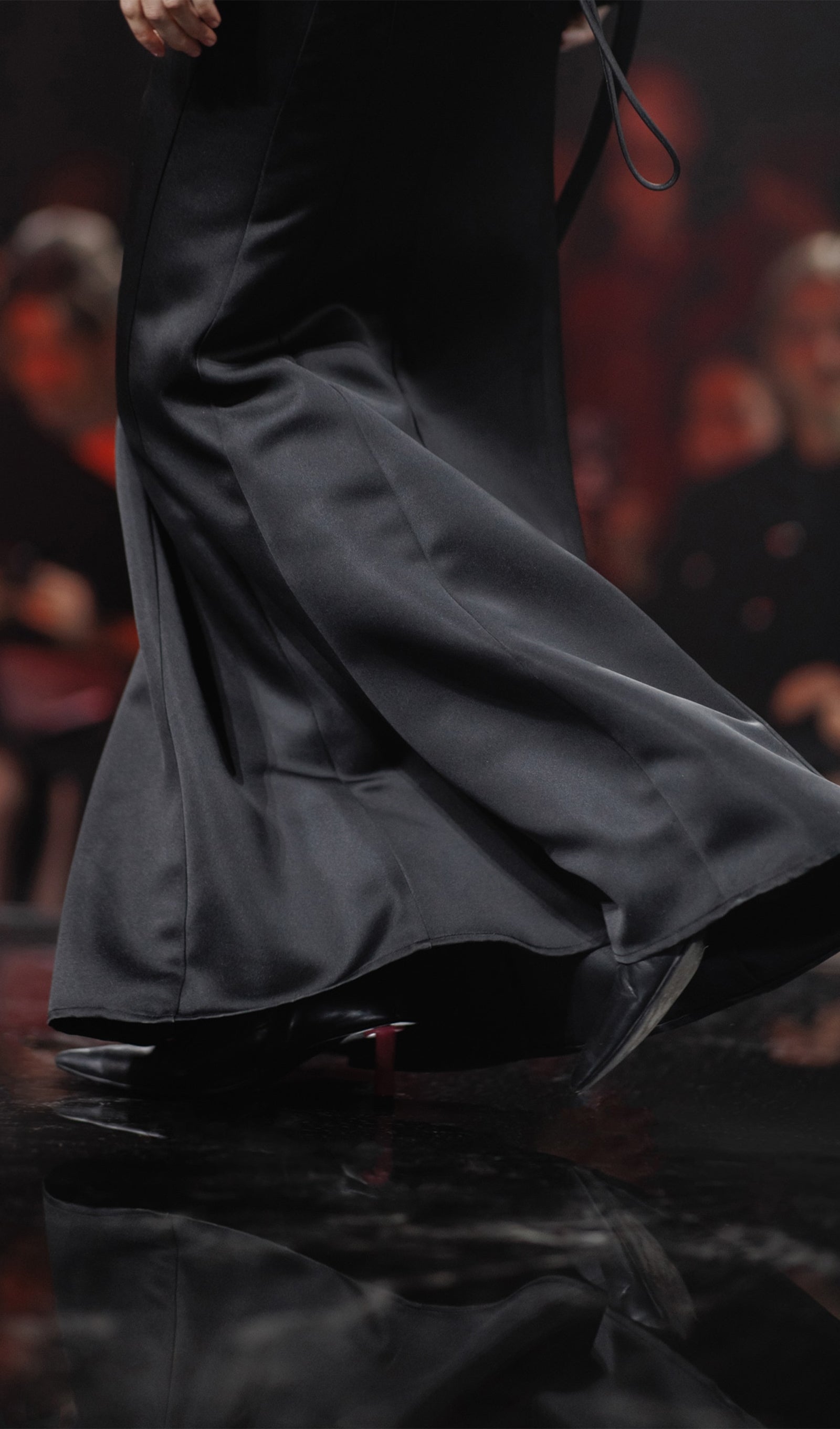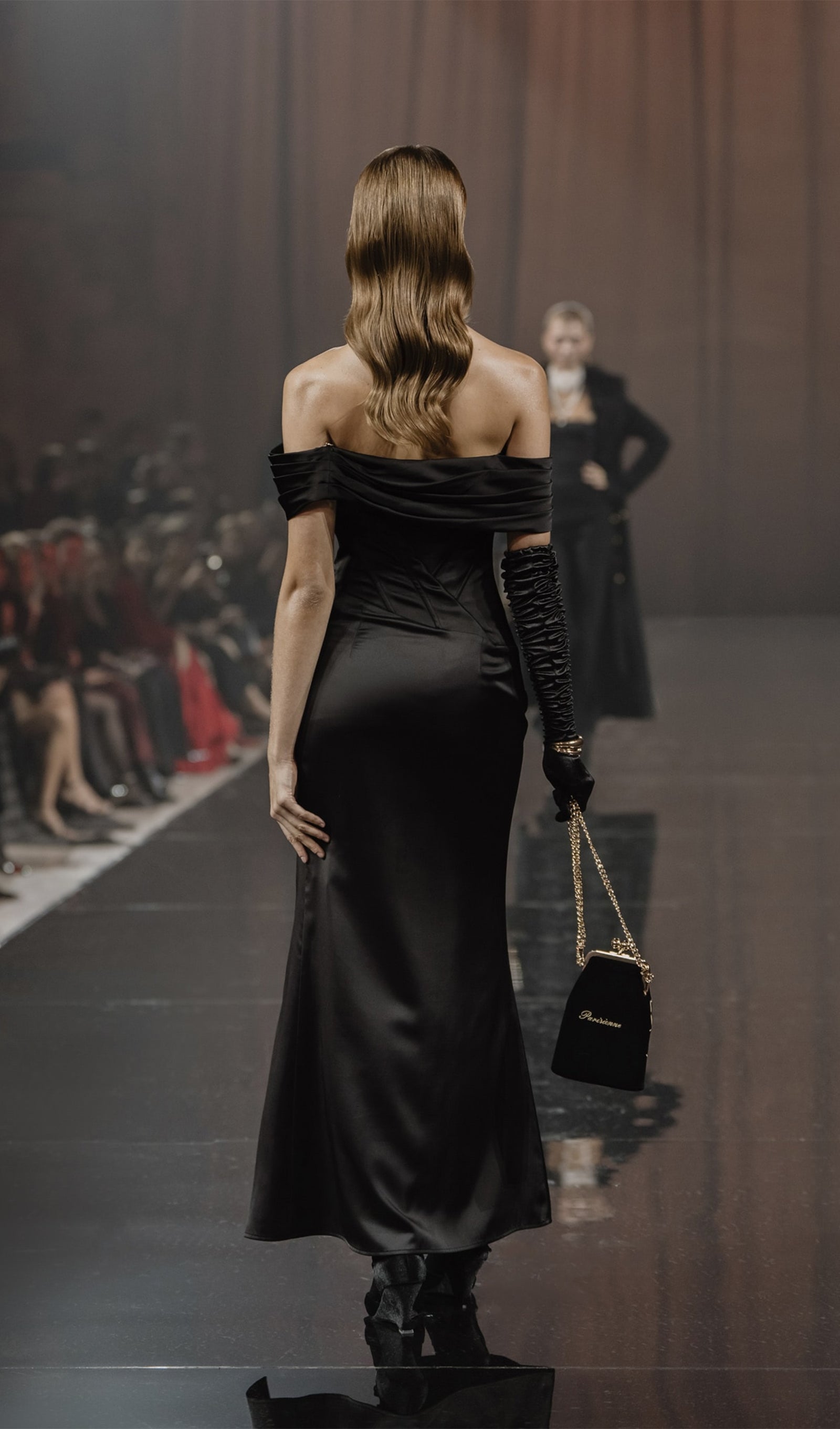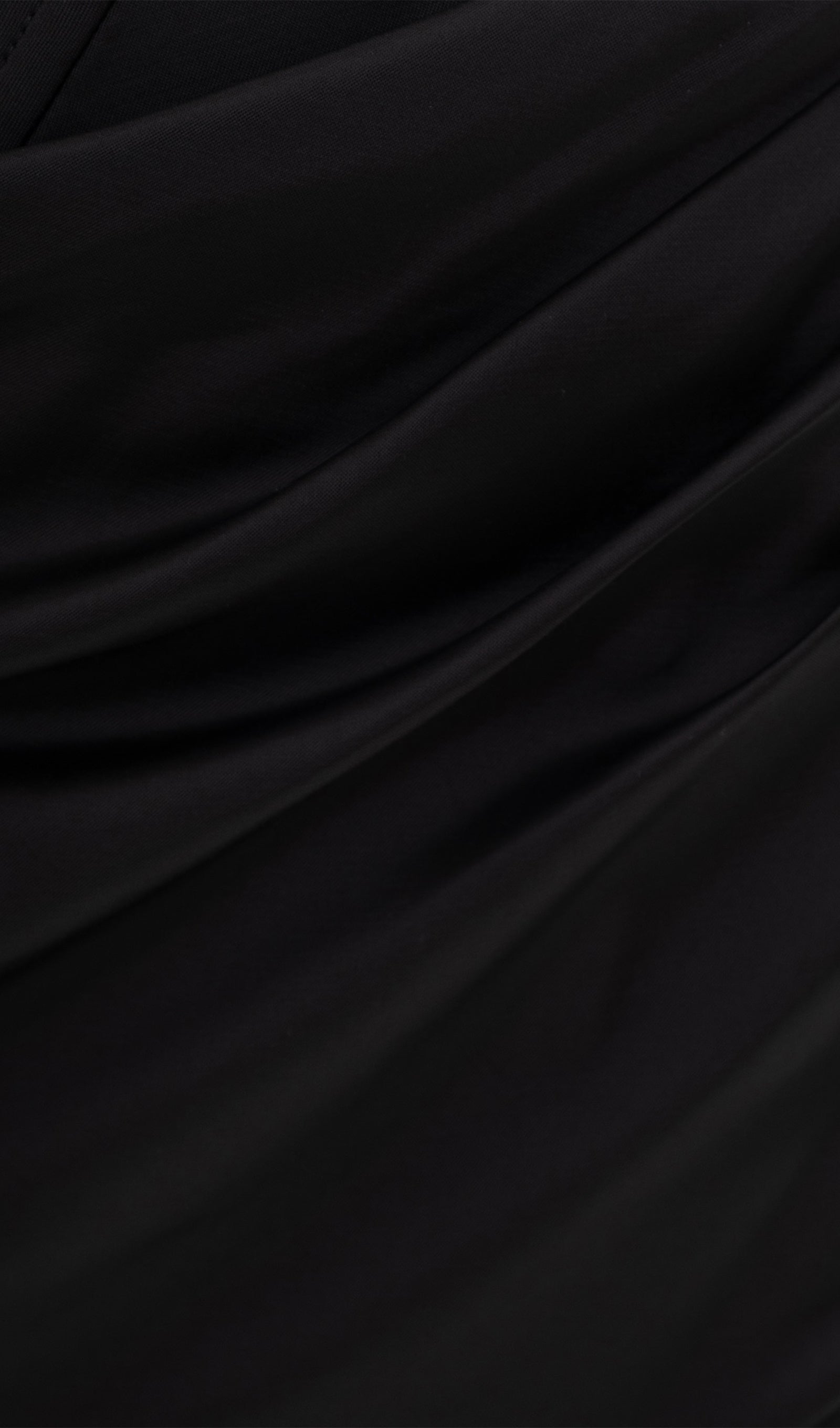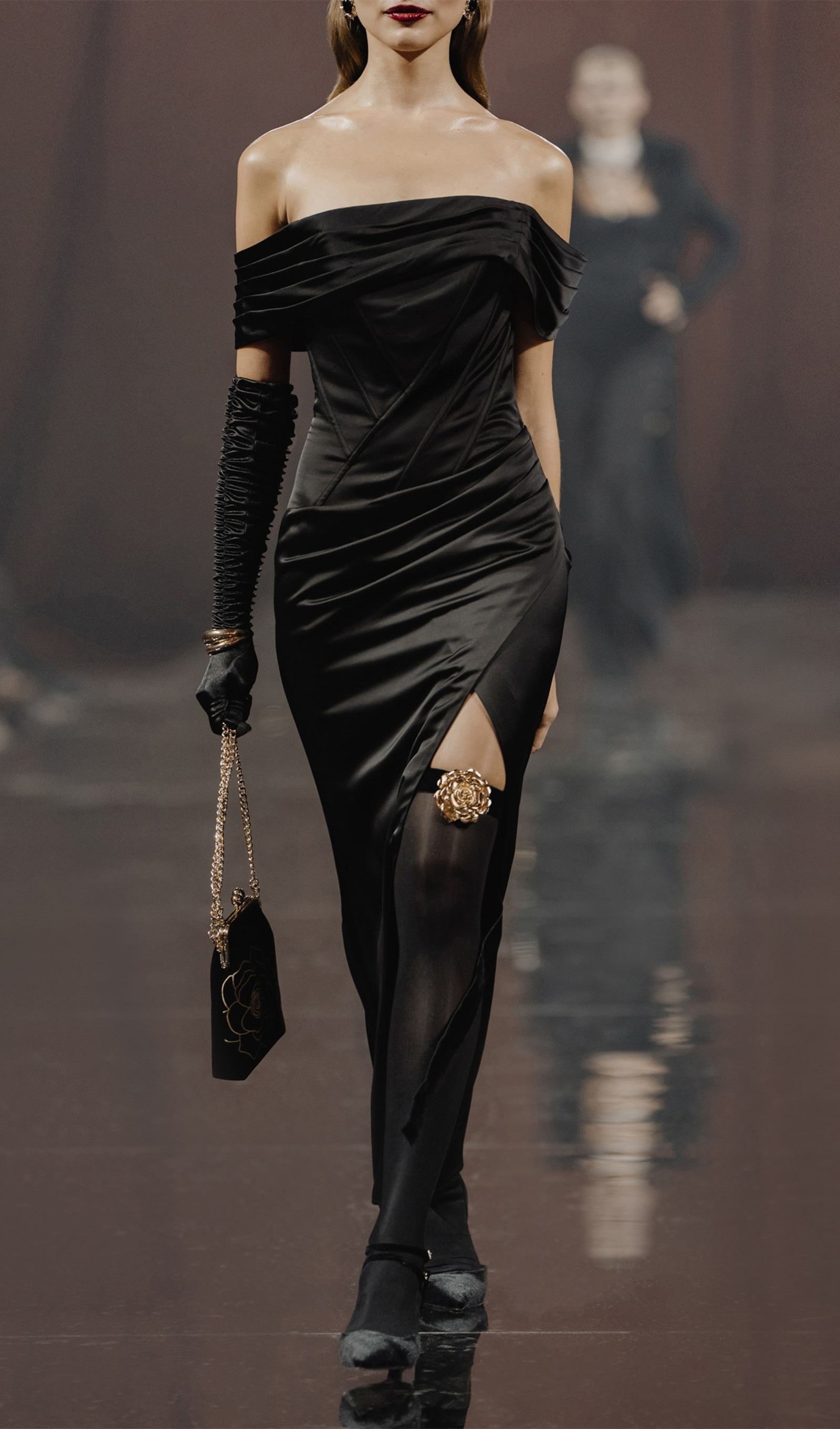 Maxi dress with a dramatic lapel that opens the shoulders and diagonal boning at the waist. It features a straight skirt with wrap imitation and a high slit at the front, and a delicate asymmetric drape at the hips.