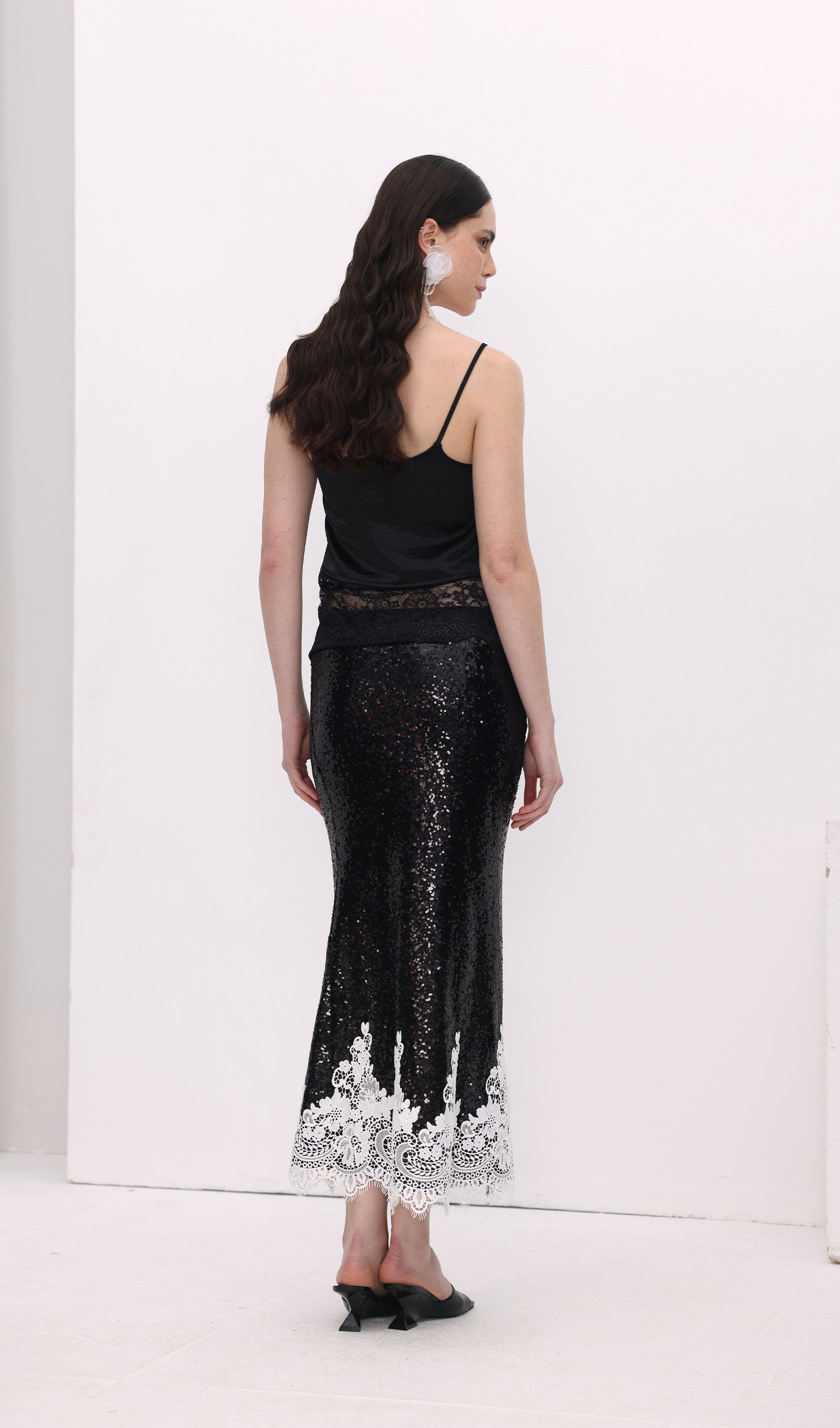 Upgrade your wardrobe with our Sequinned Lace Trim Midi Skirt. The black sequin design adds a touch of glamour to any outfit, while the wrap design and concealed side press-stud fastening provide a secure fit. With a mid-length and straight hem, this skirt is perfect for any occasion. Complete with full lining and delicate lace trim for added elegance.