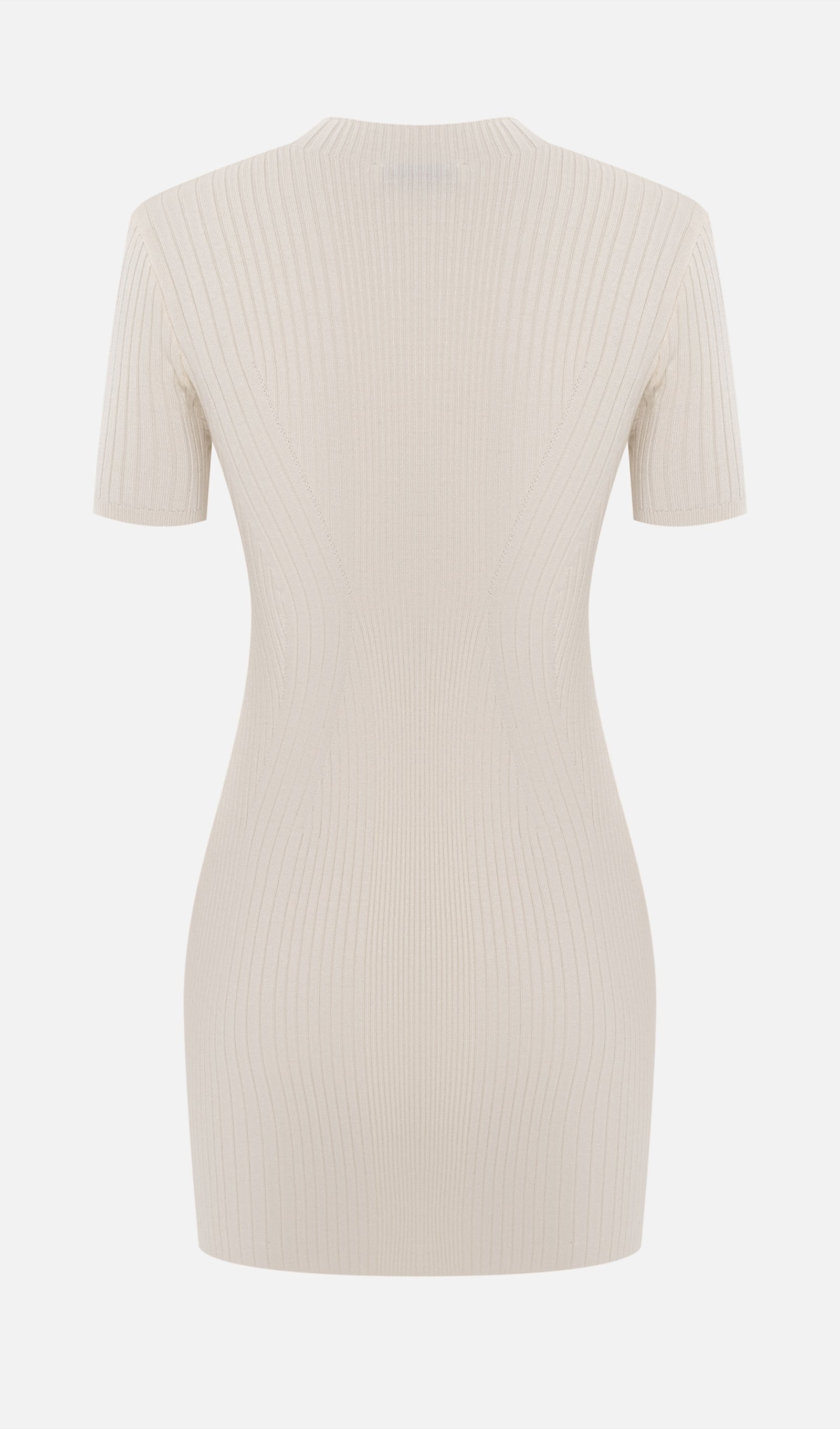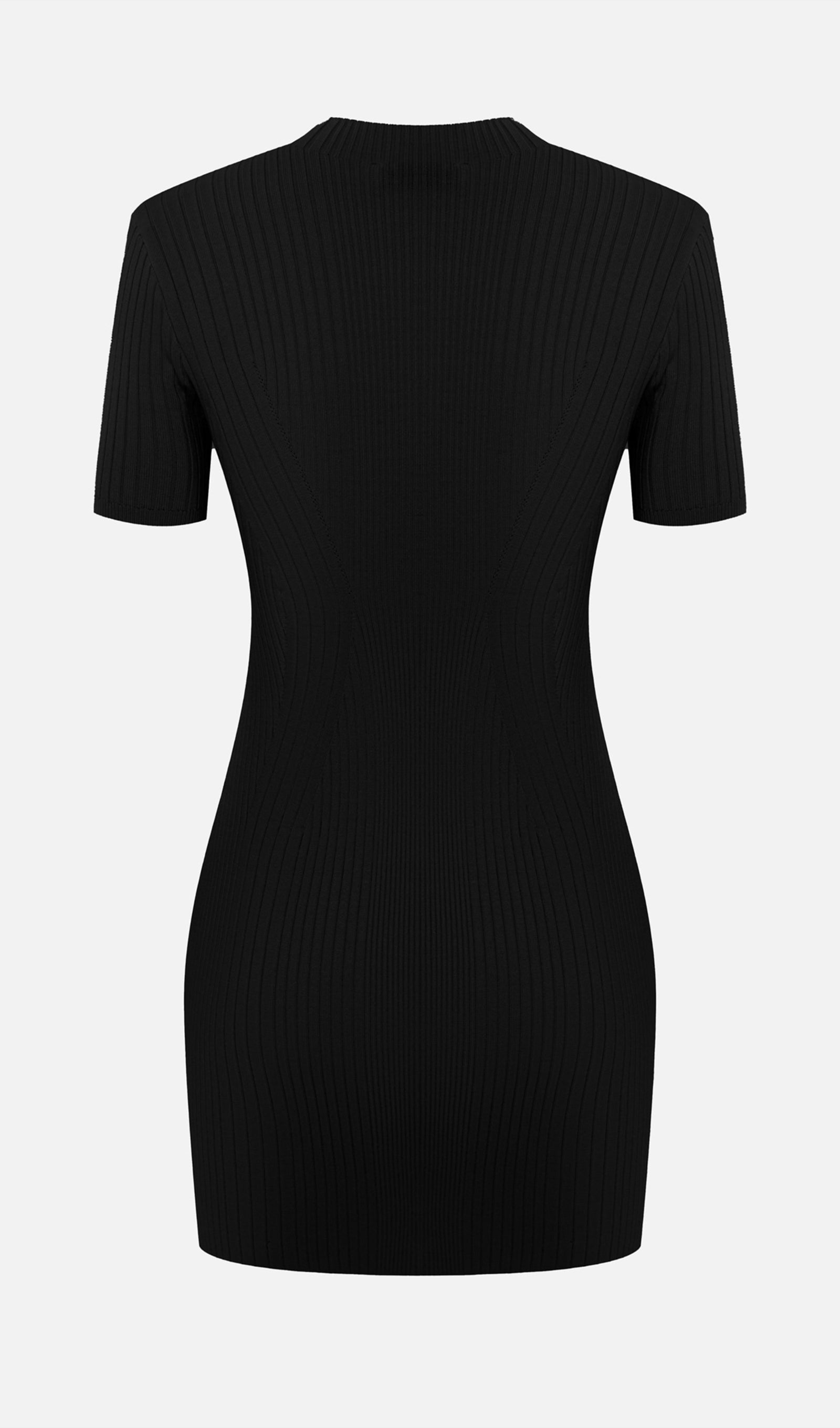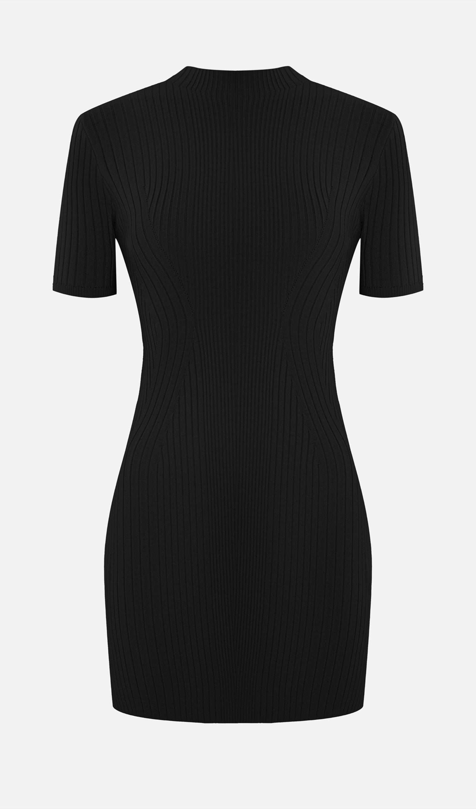 Playful fitted dress with a delicate high collar, short sleeves and a straight skirt. The model is made from stretch jersey with a ribbed texture, which additionally shapes the silhouette.