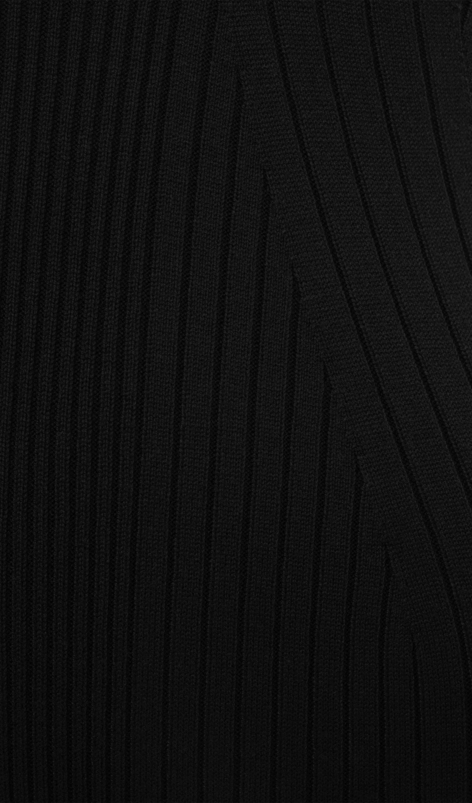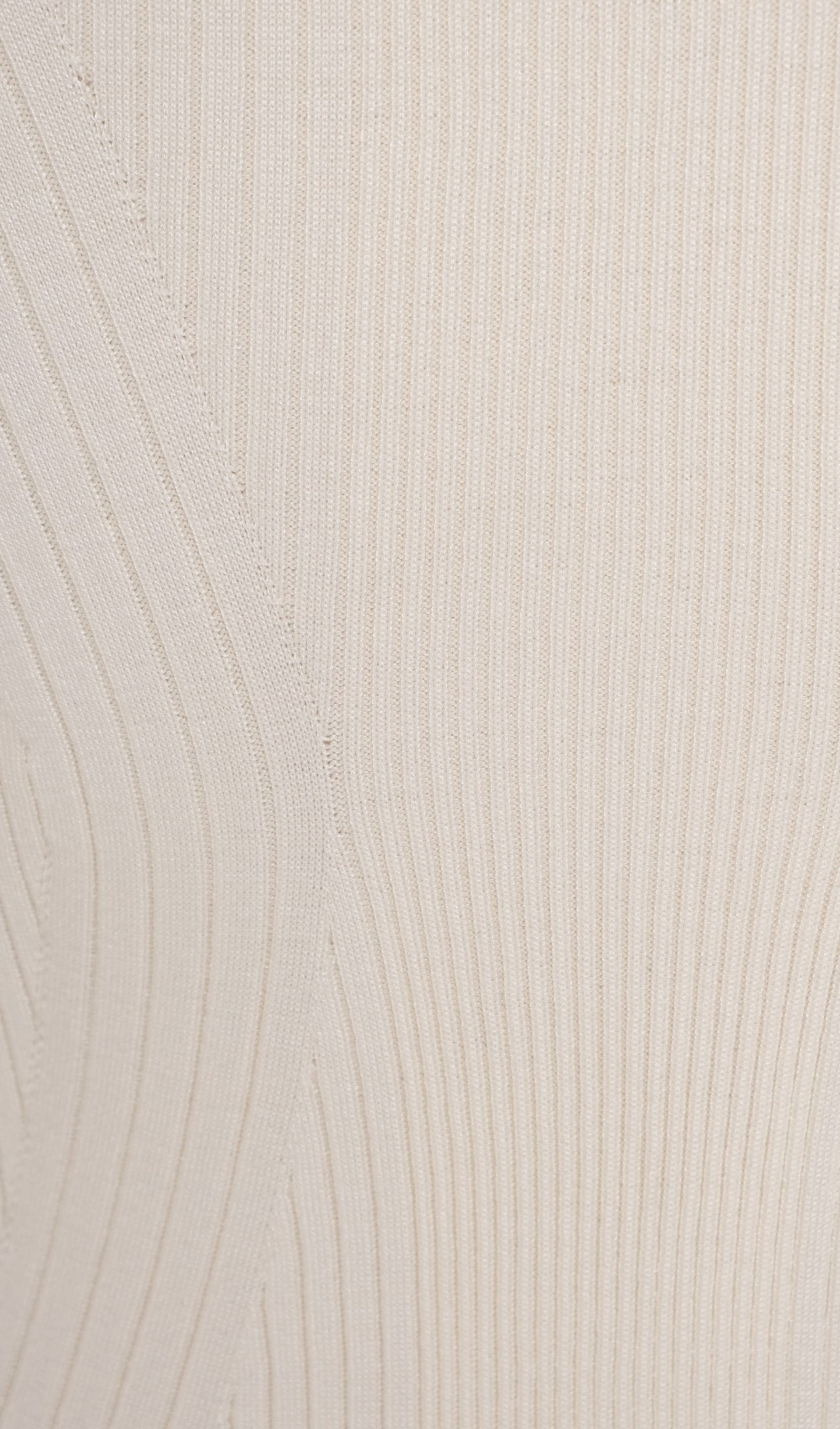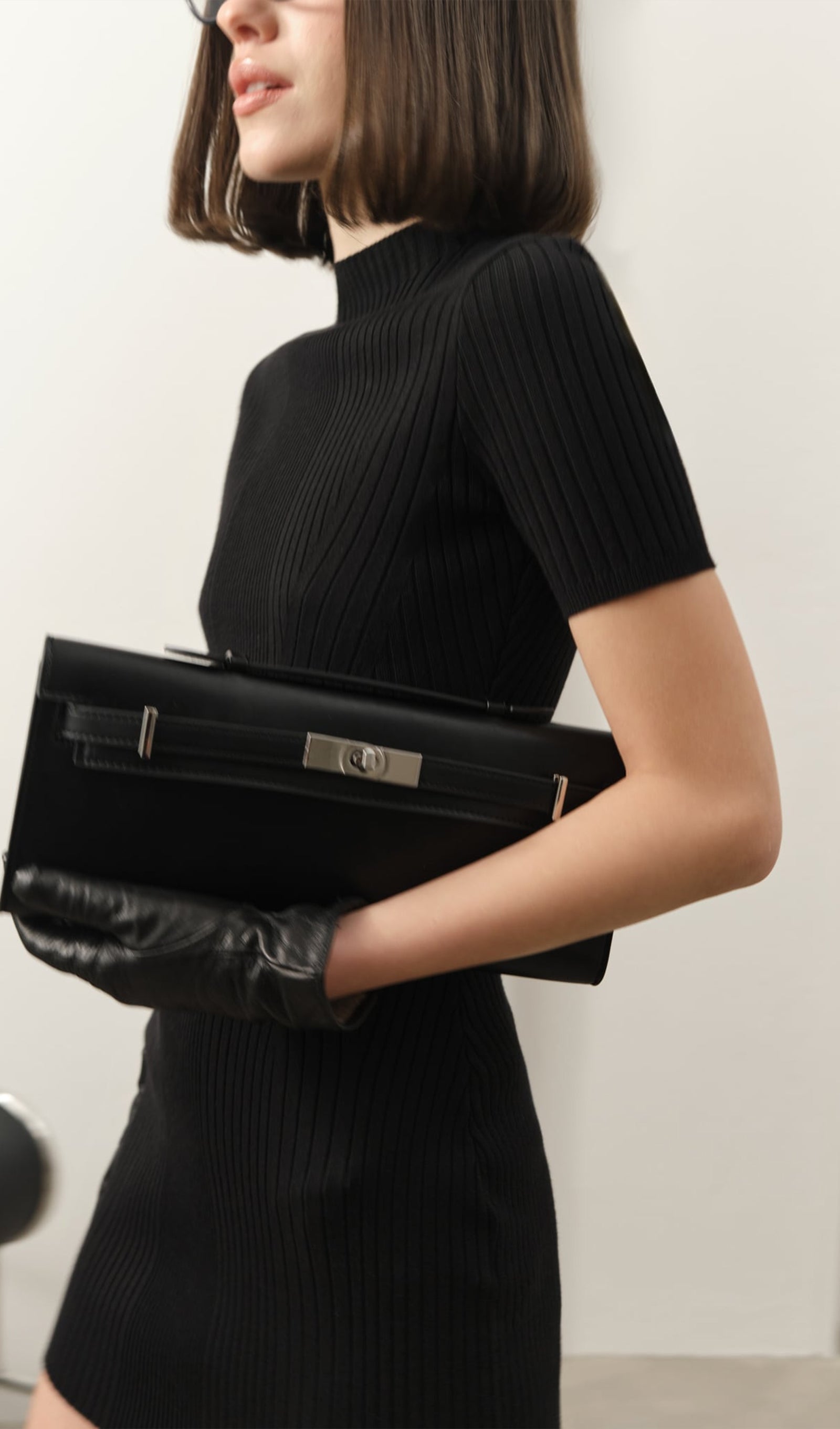 Playful fitted dress with a delicate high collar, short sleeves and a straight skirt. The model is made from stretch jersey with a ribbed texture, which additionally shapes the silhouette.