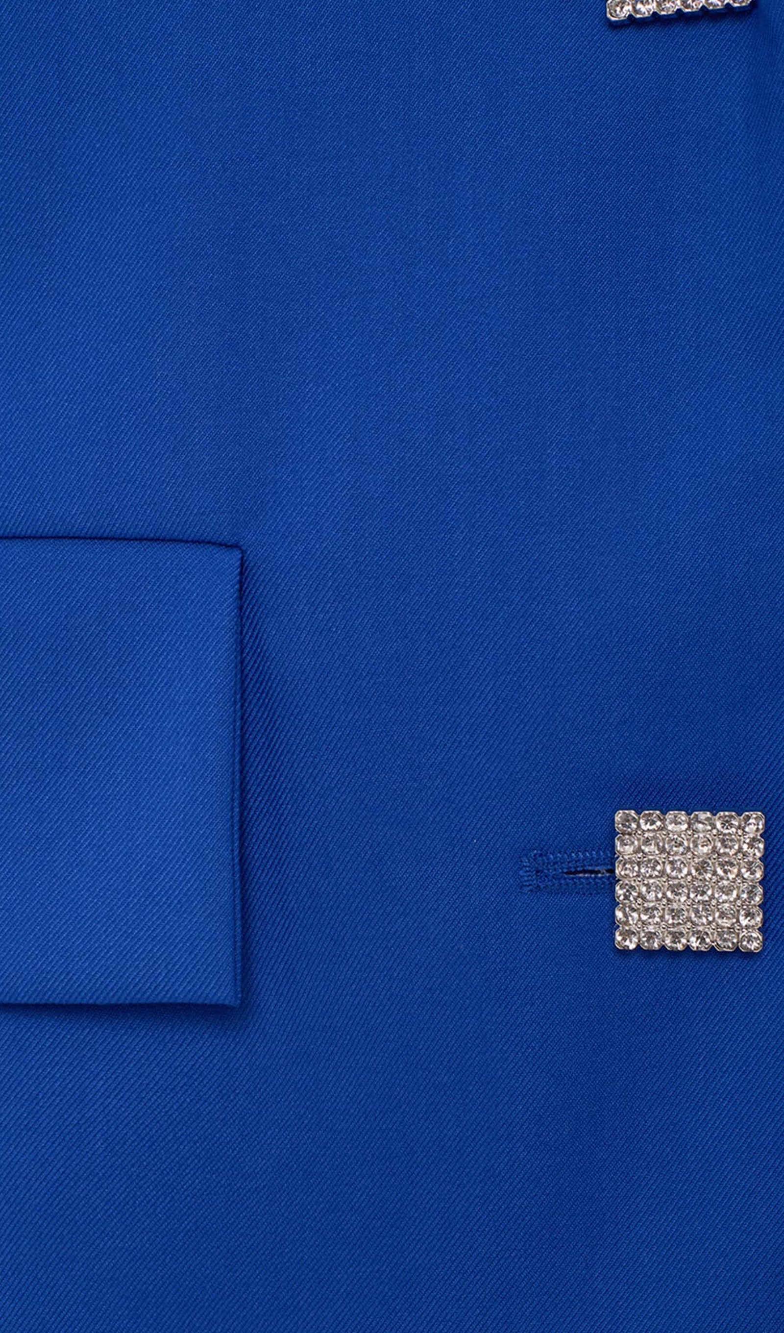 Loose-fitting single-breasted blazer with emphasized shoulder line, side pockets with wide flaps and comfortable sleeves with lush feathers on the cuffs. The blazer is made from monochrome fabric and is complemented with large square buttons encrusted with rhinestones. To create a three-piece suit, combine it with the matching mini skirt and top.