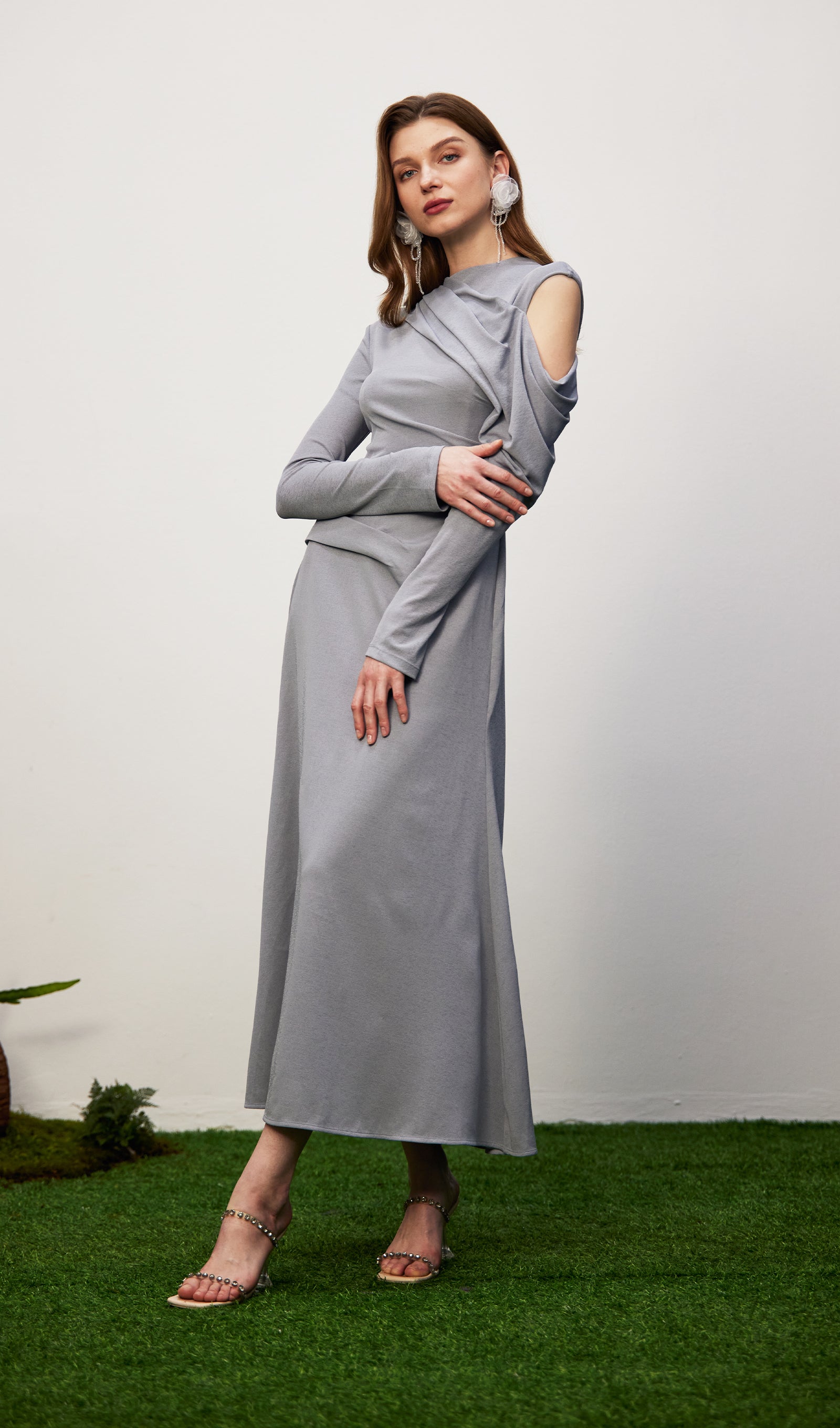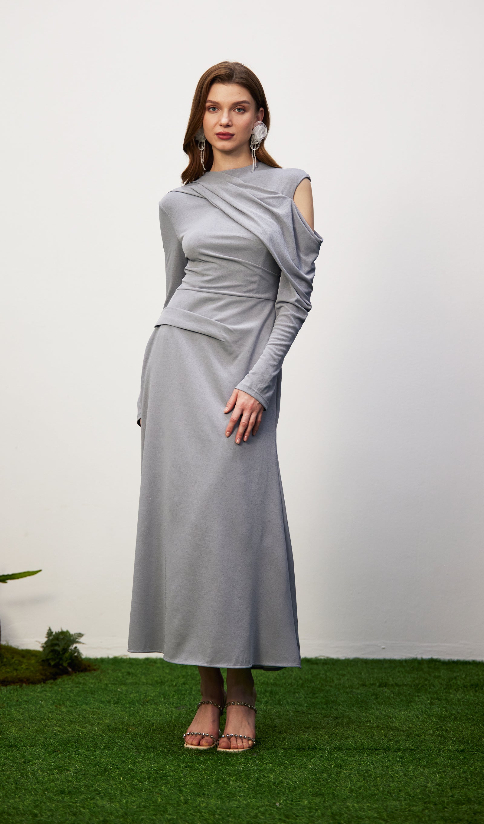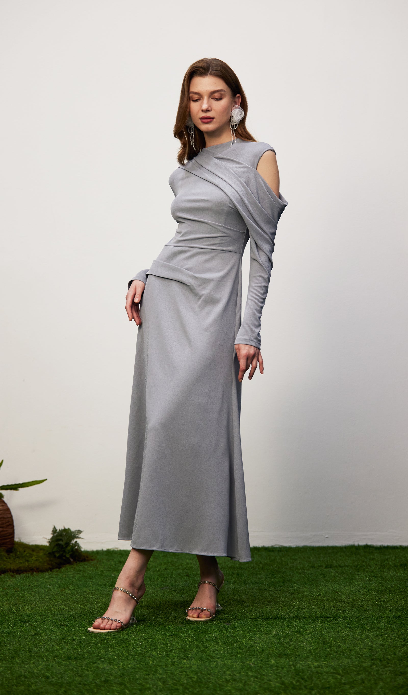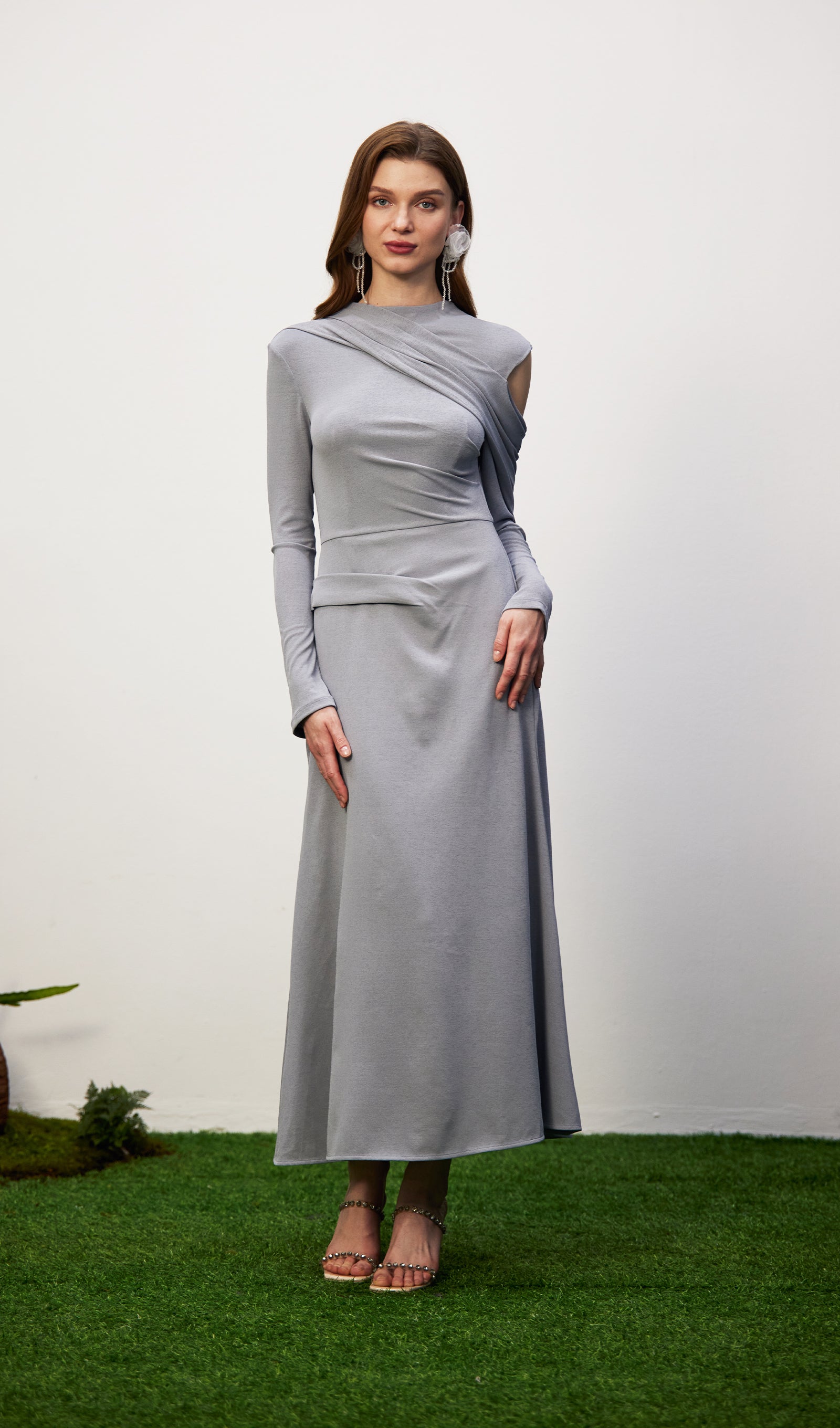 This fitted midi dress features a subtle high neckline and asymmetrical draped sleeves, combined with 3D draping at the waist to create a fluid, graceful look. The asymmetrical cut highlights the shoulders, while the mermaid silhouette flatters the body, making it ideal for formal occasions.