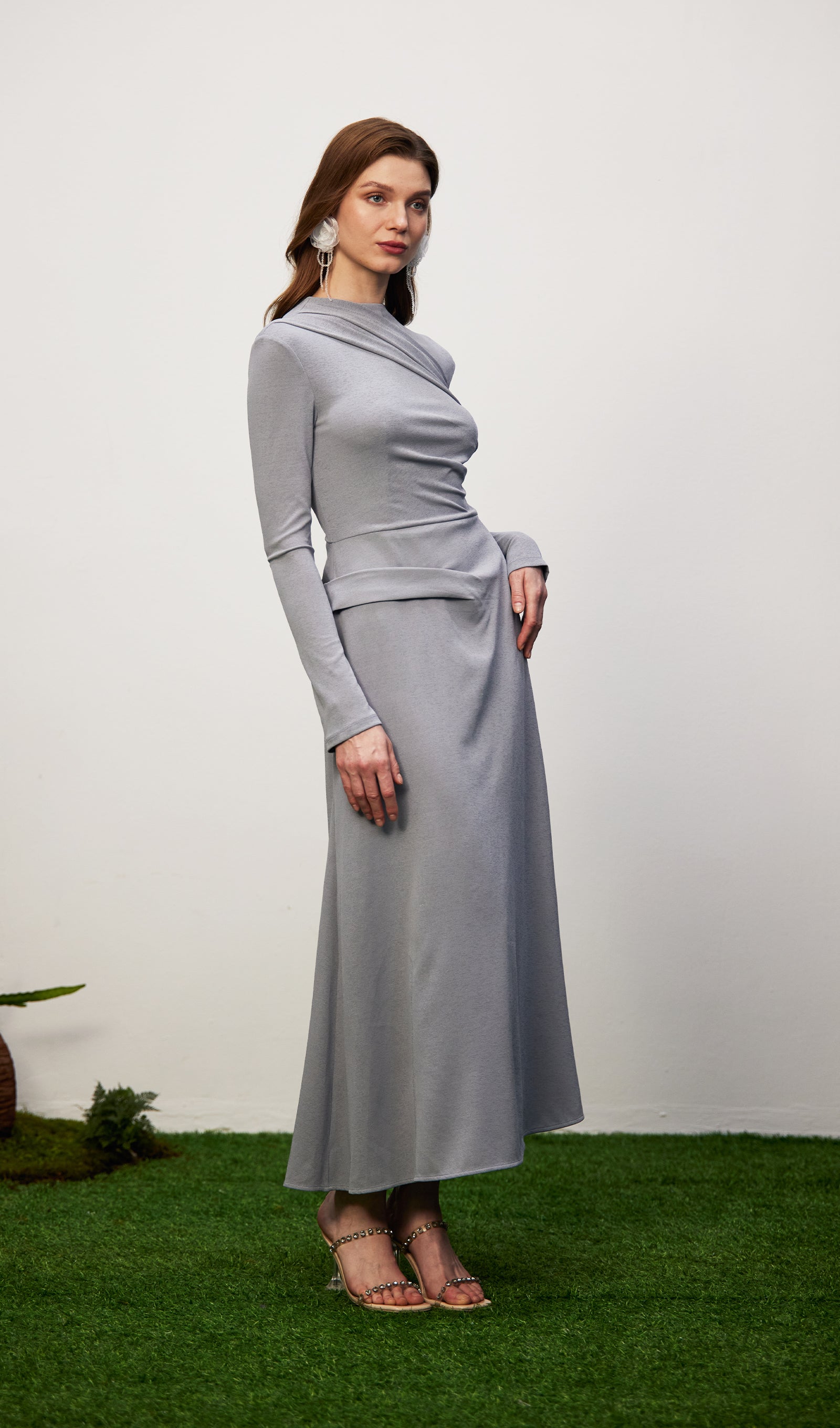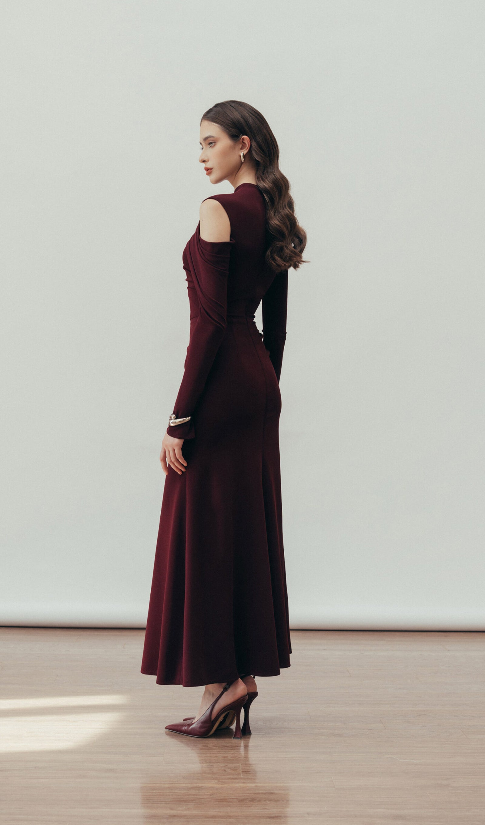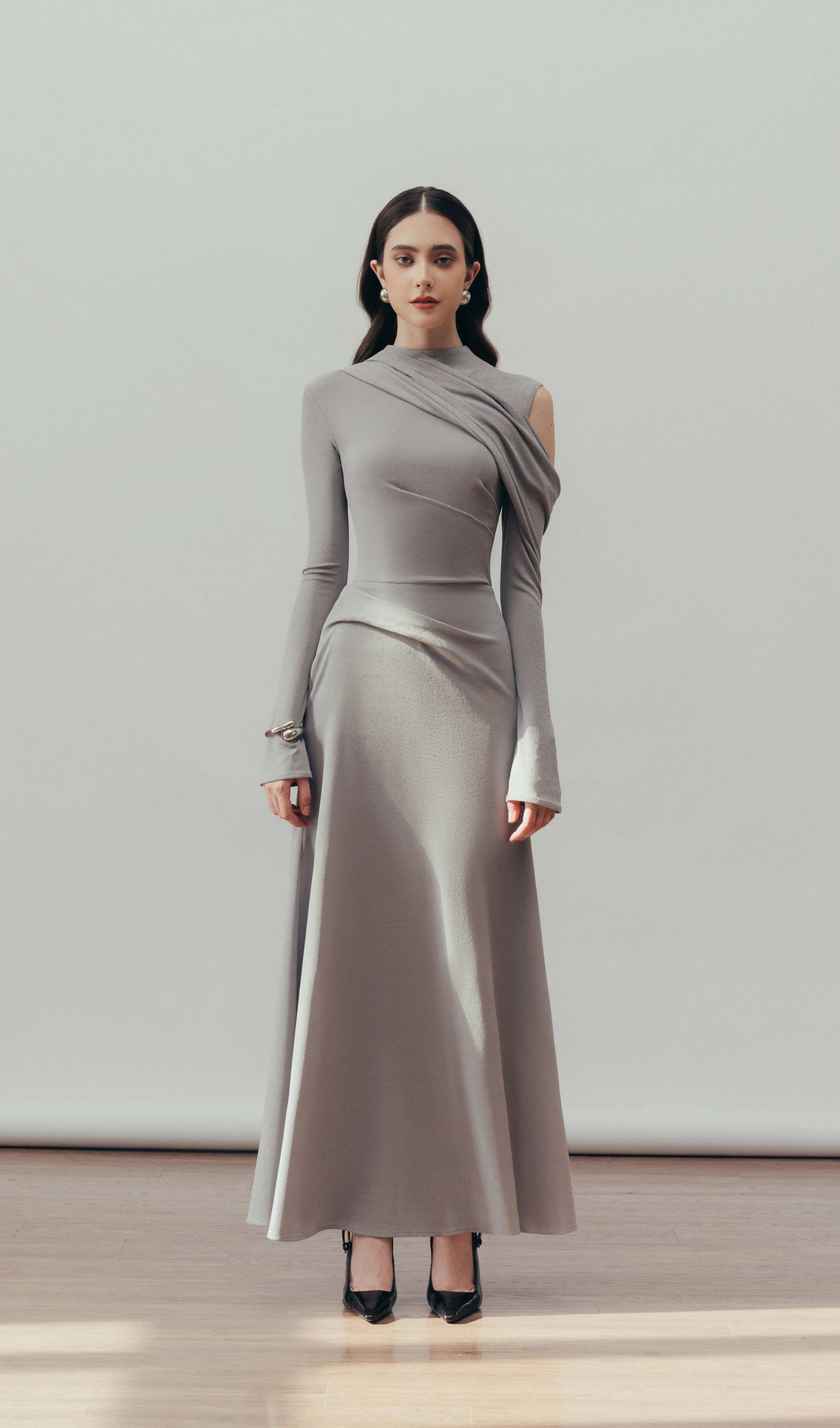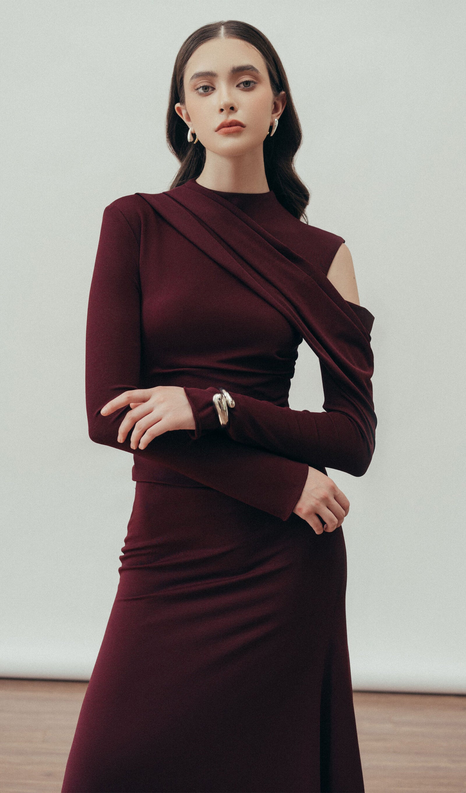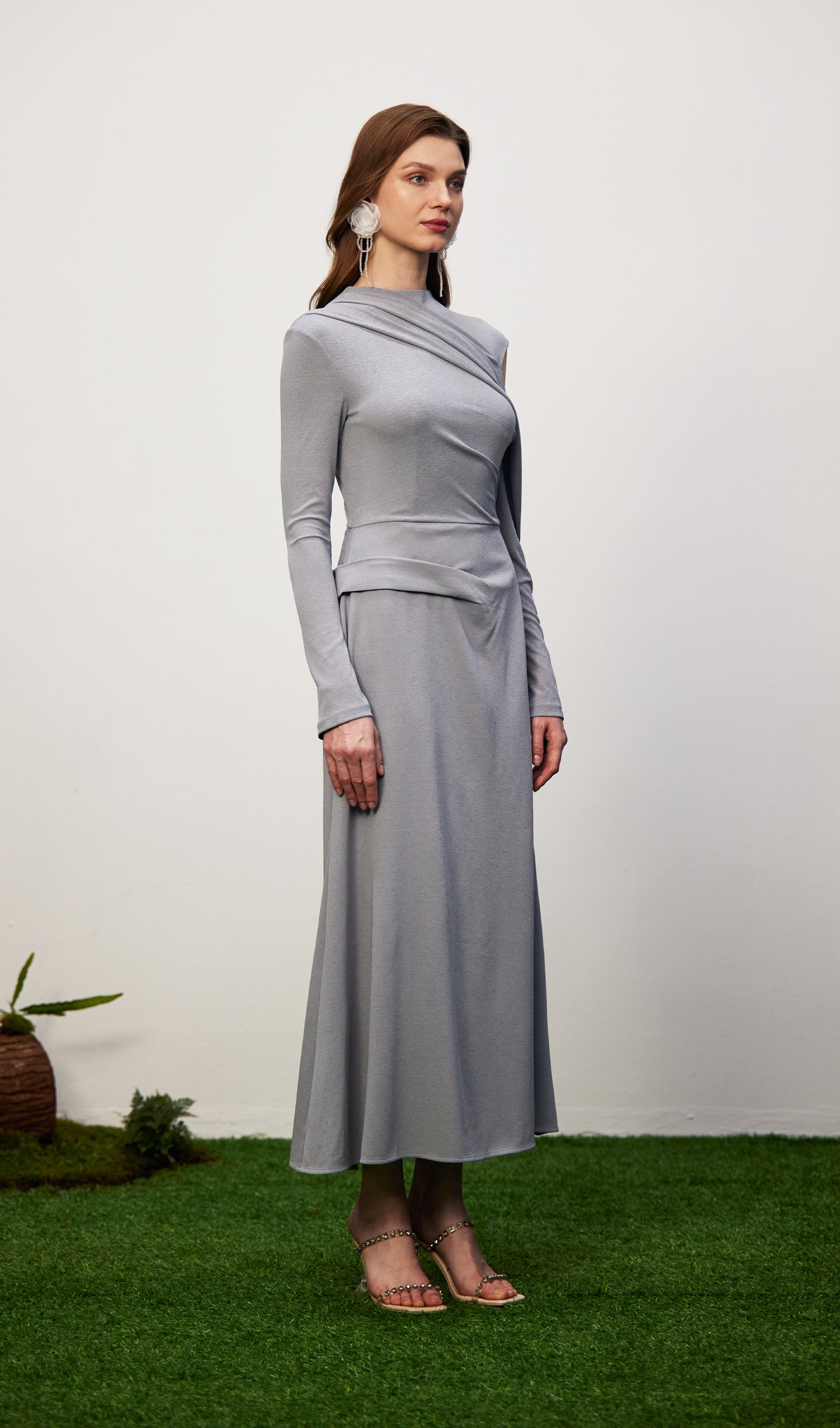 This fitted midi dress features a subtle high neckline and asymmetrical draped sleeves, combined with 3D draping at the waist to create a fluid, graceful look. The asymmetrical cut highlights the shoulders, while the mermaid silhouette flatters the body, making it ideal for formal occasions.