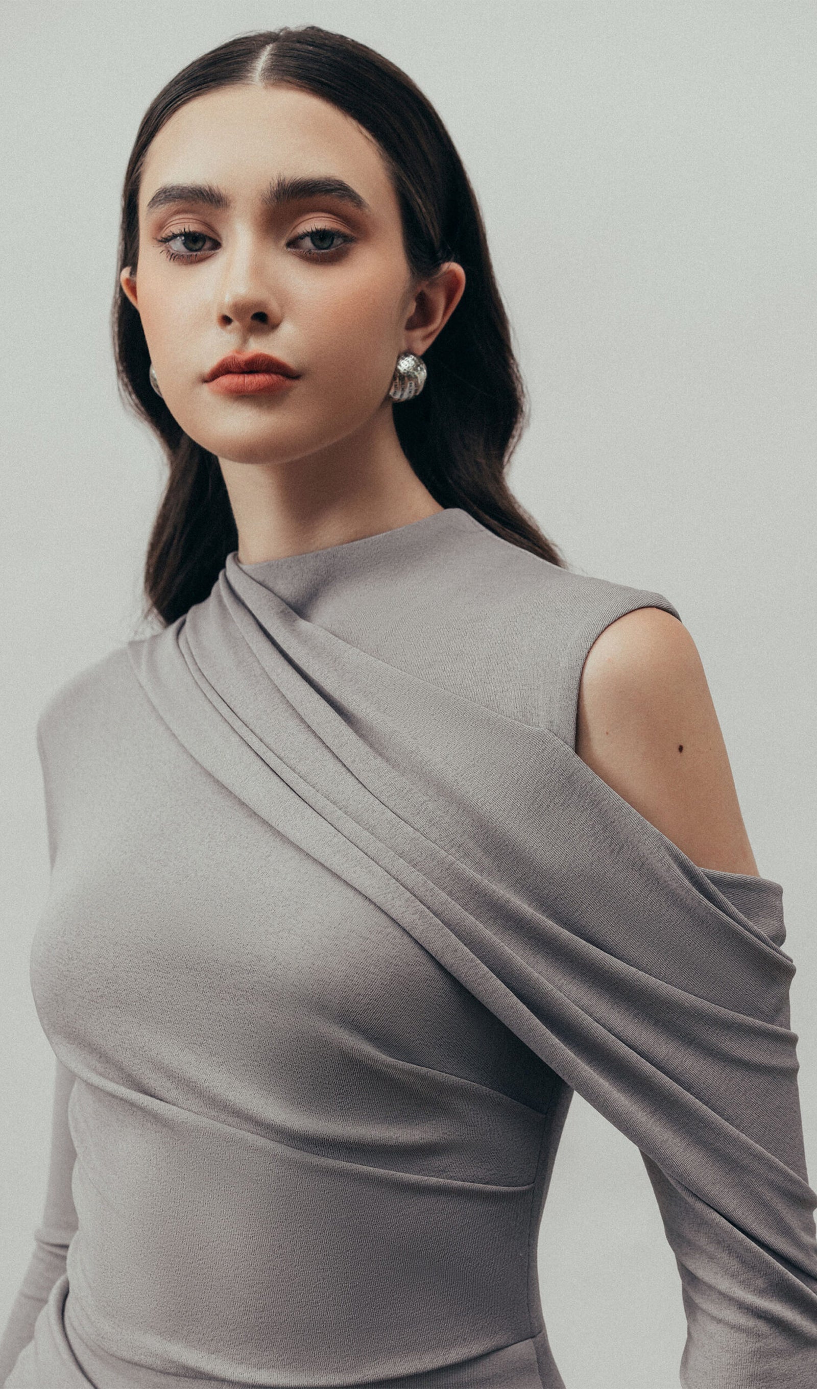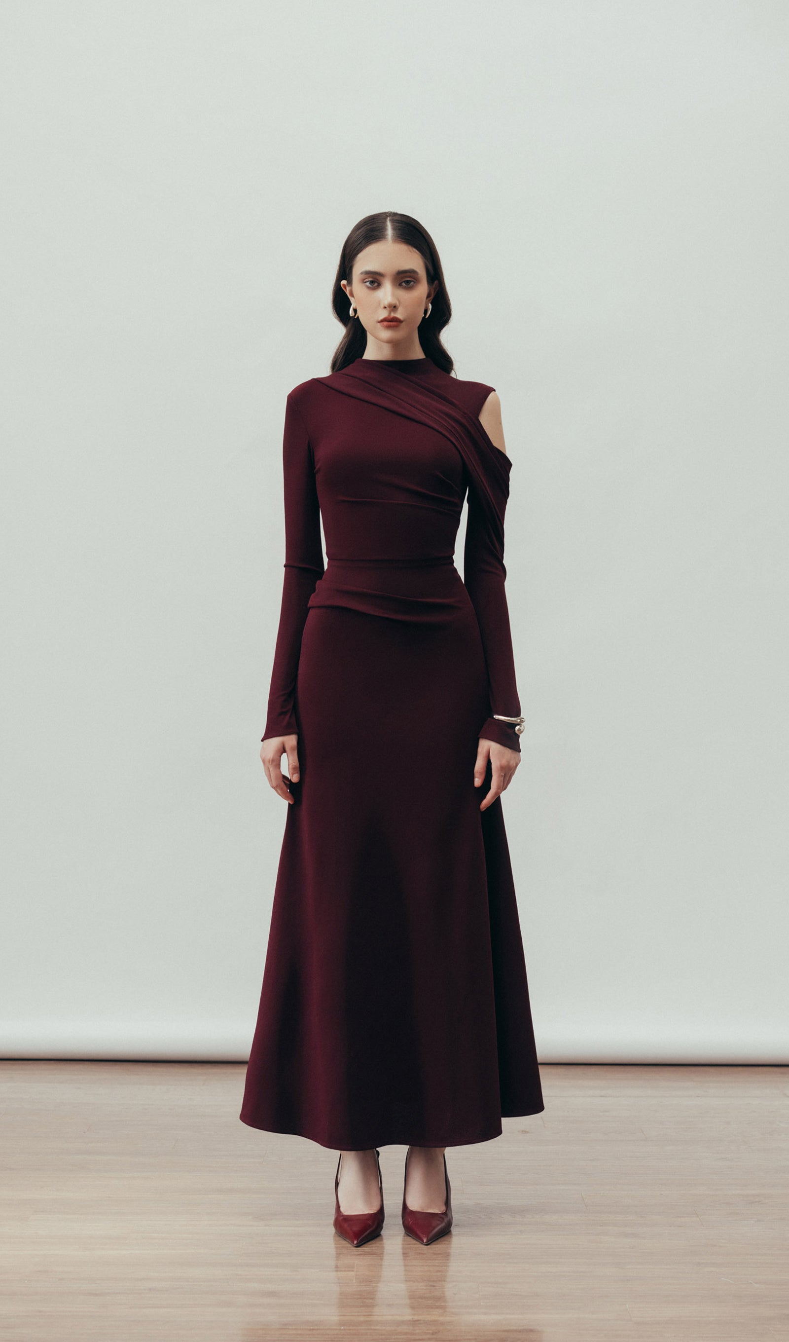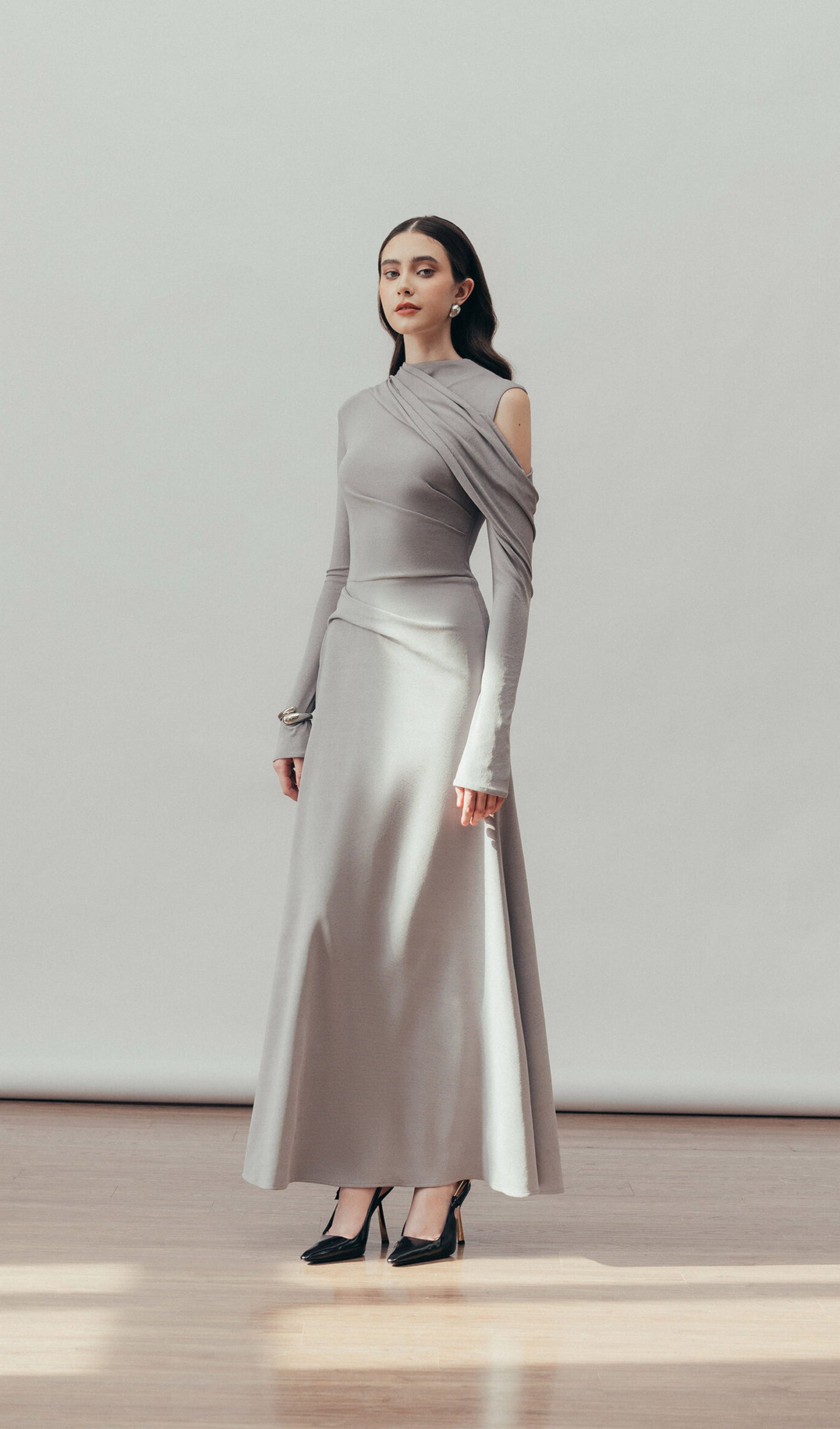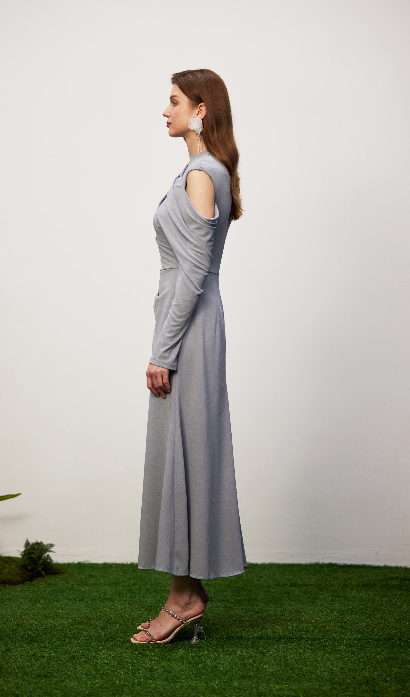 This fitted midi dress features a subtle high neckline and asymmetrical draped sleeves, combined with 3D draping at the waist to create a fluid, graceful look. The asymmetrical cut highlights the shoulders, while the mermaid silhouette flatters the body, making it ideal for formal occasions.