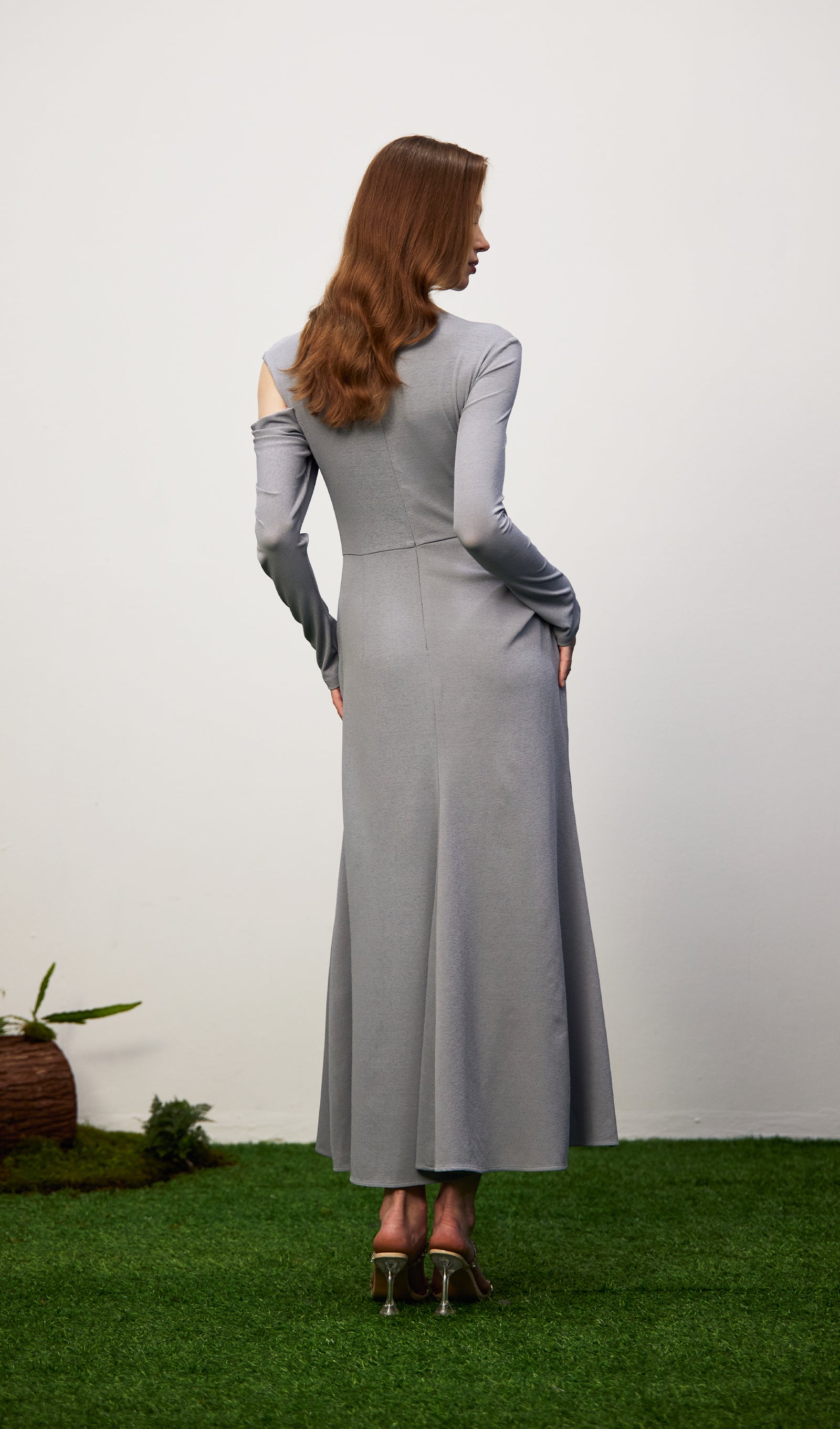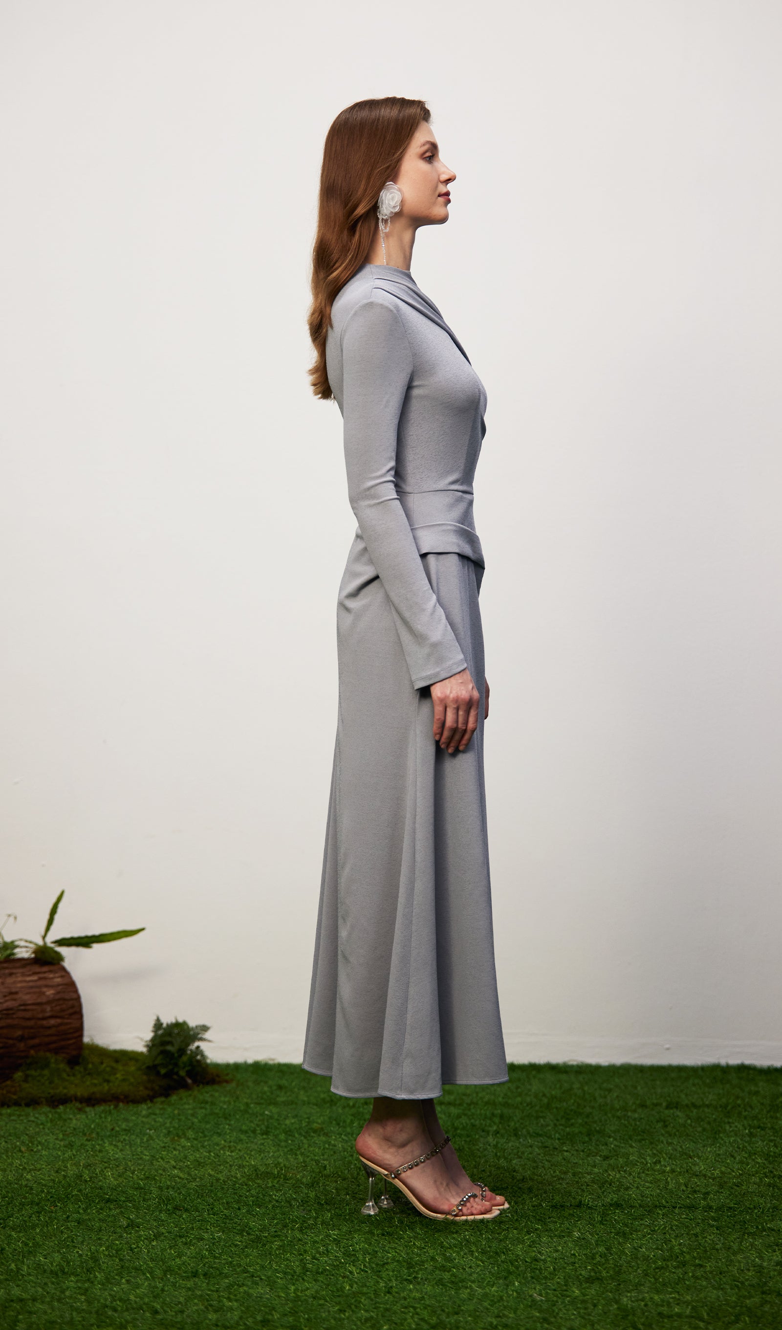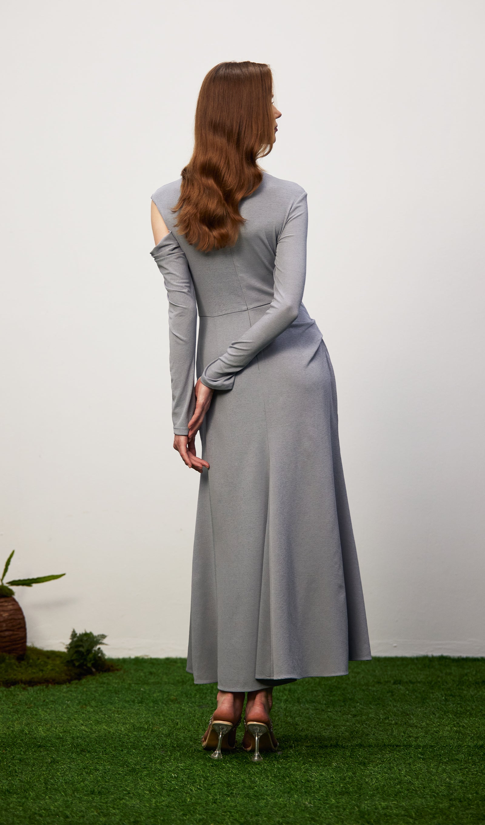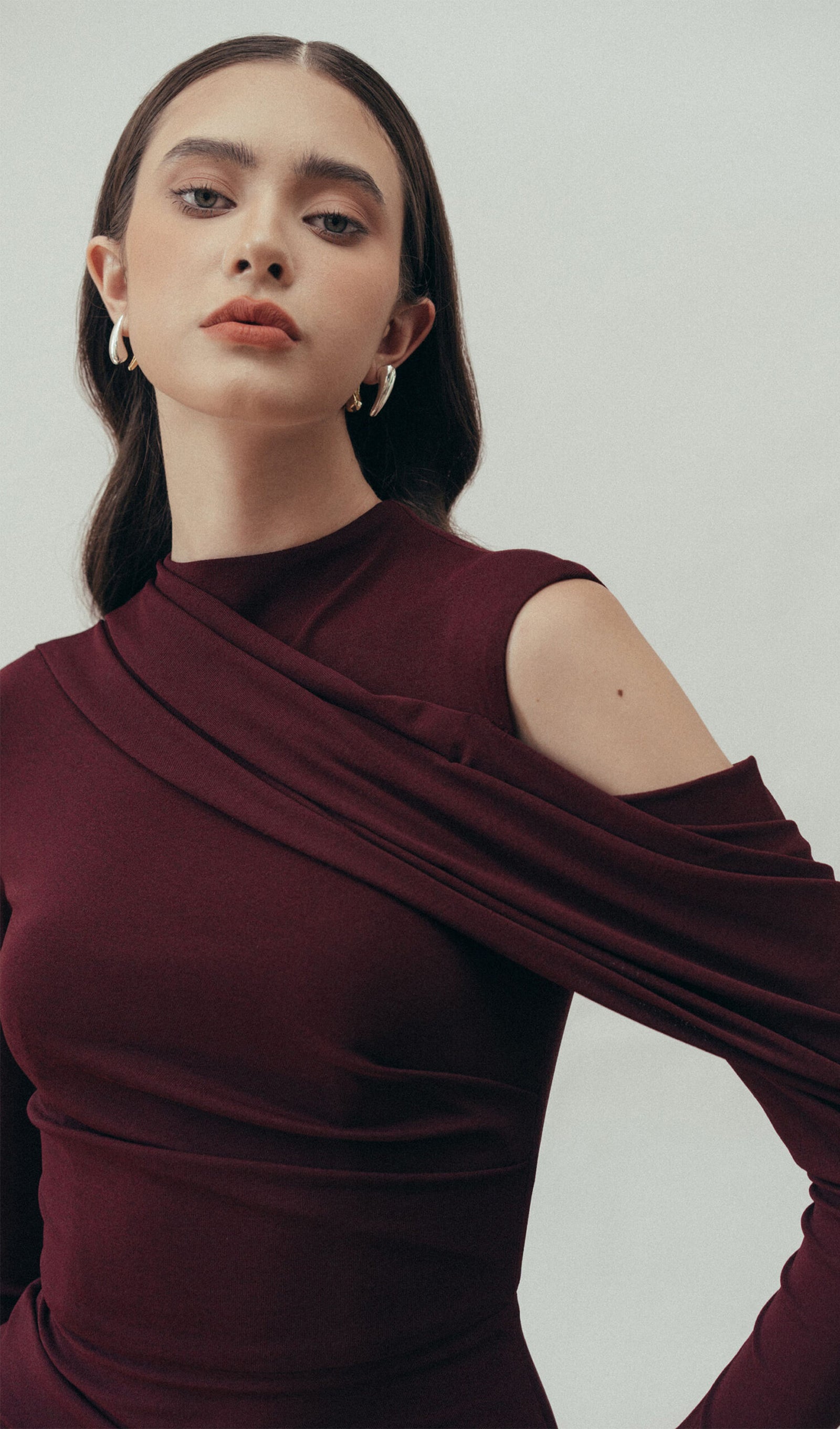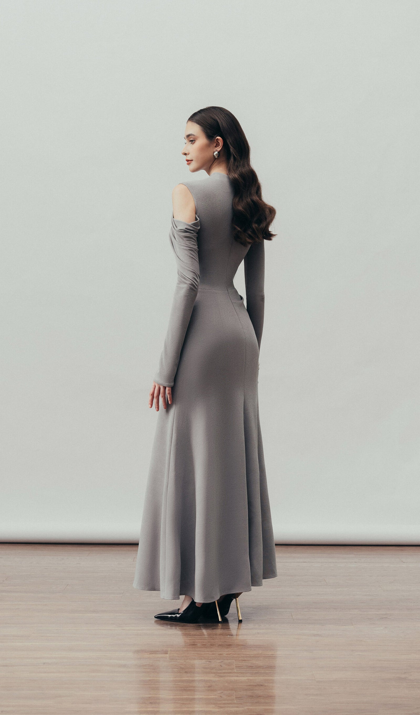 This fitted midi dress features a subtle high neckline and asymmetrical draped sleeves, combined with 3D draping at the waist to create a fluid, graceful look. The asymmetrical cut highlights the shoulders, while the mermaid silhouette flatters the body, making it ideal for formal occasions.