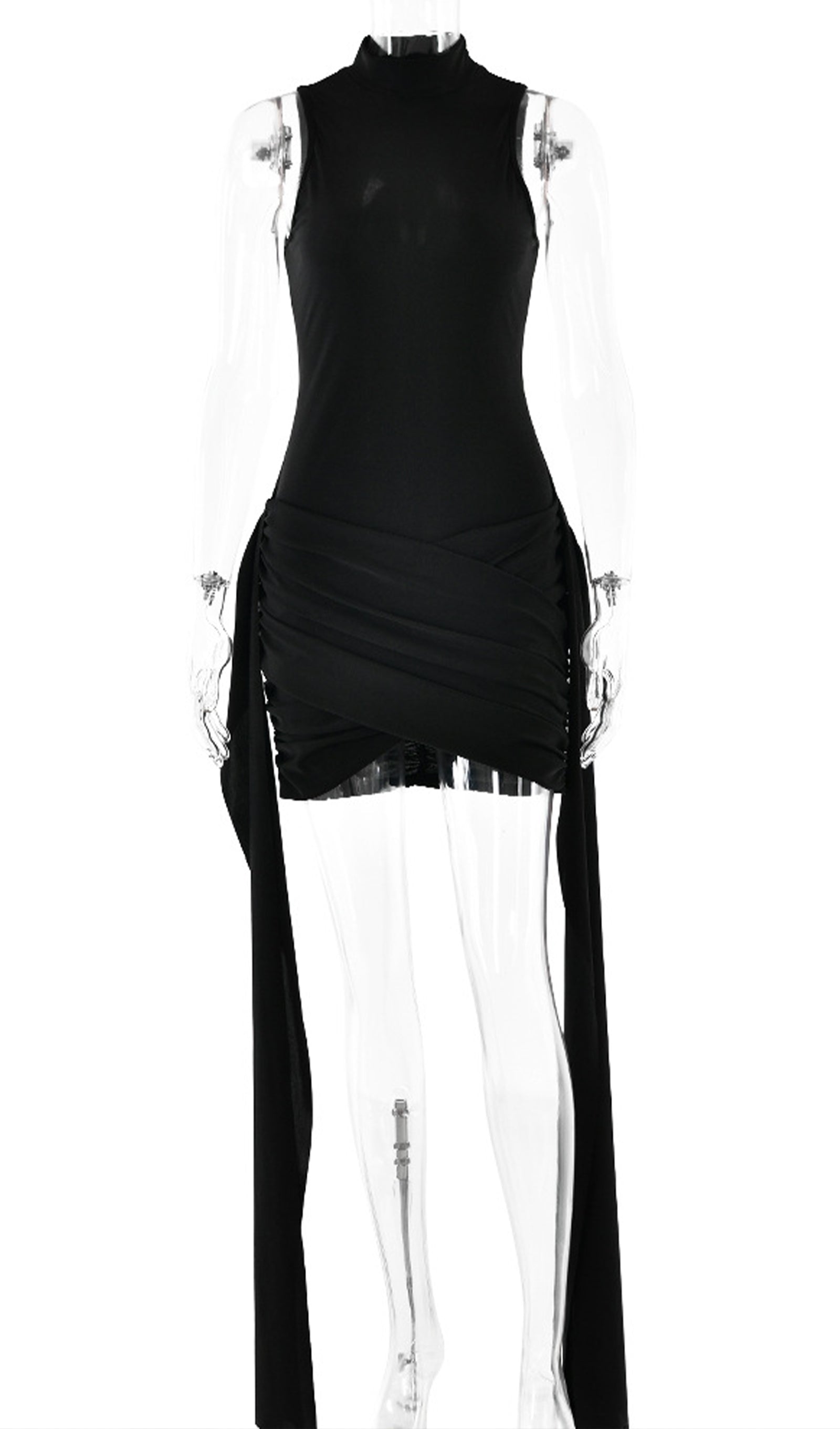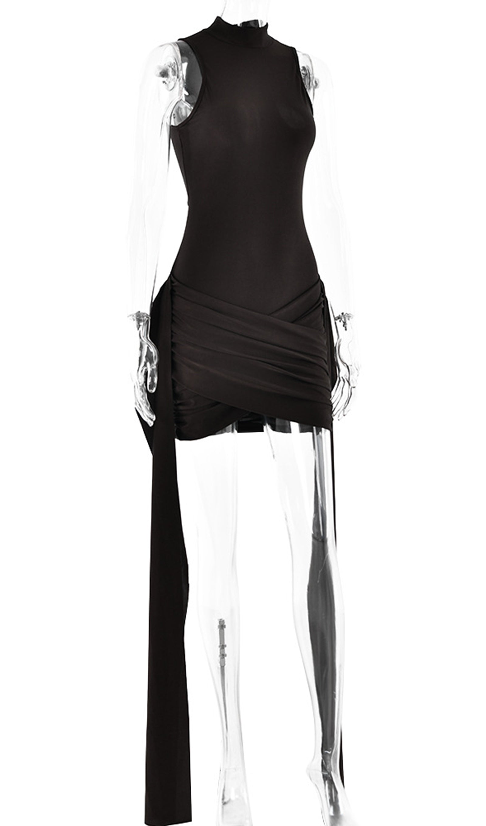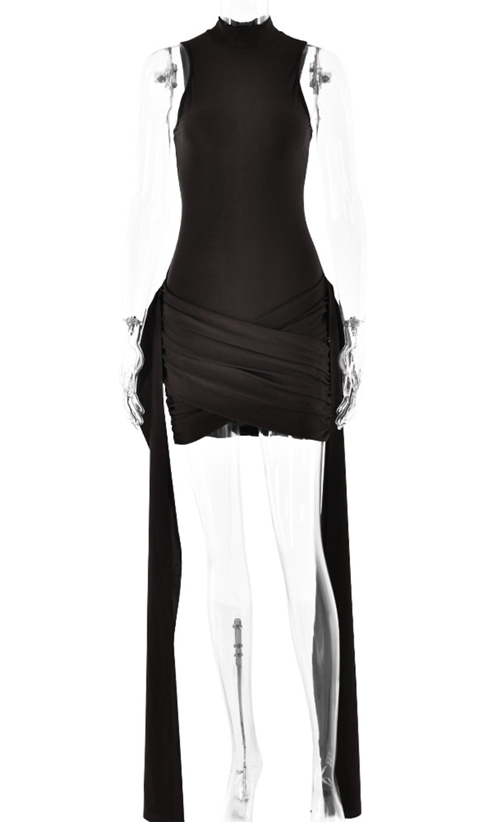 Crafted from a rich, comfortable fabric, it features a high neckline that adds a touch of sophistication. The body-hugging silhouette flatters the figure, while a unique asymmetrical design at the skirt adds visual interest. The dress is accented with long, draped sashes on both sides, creating a sense of movement and drama.