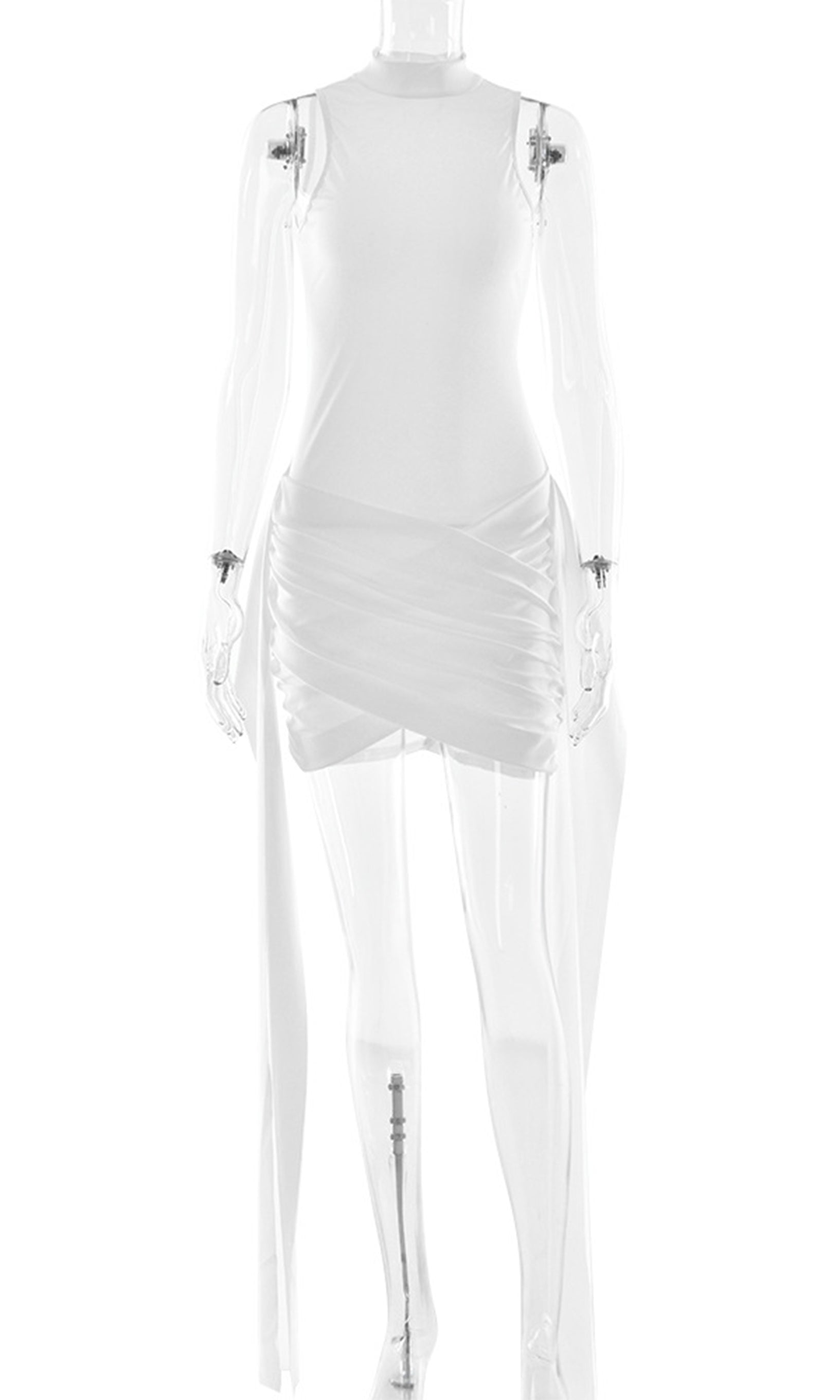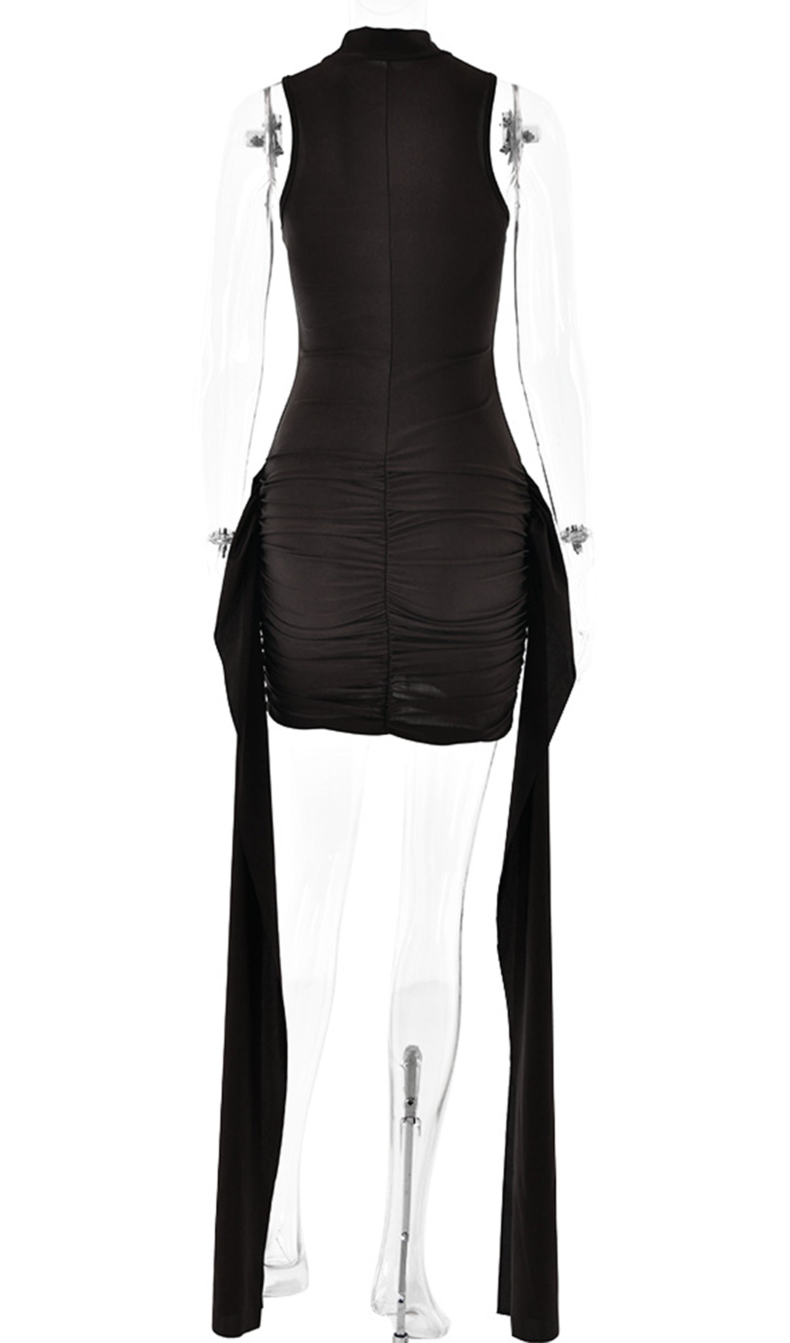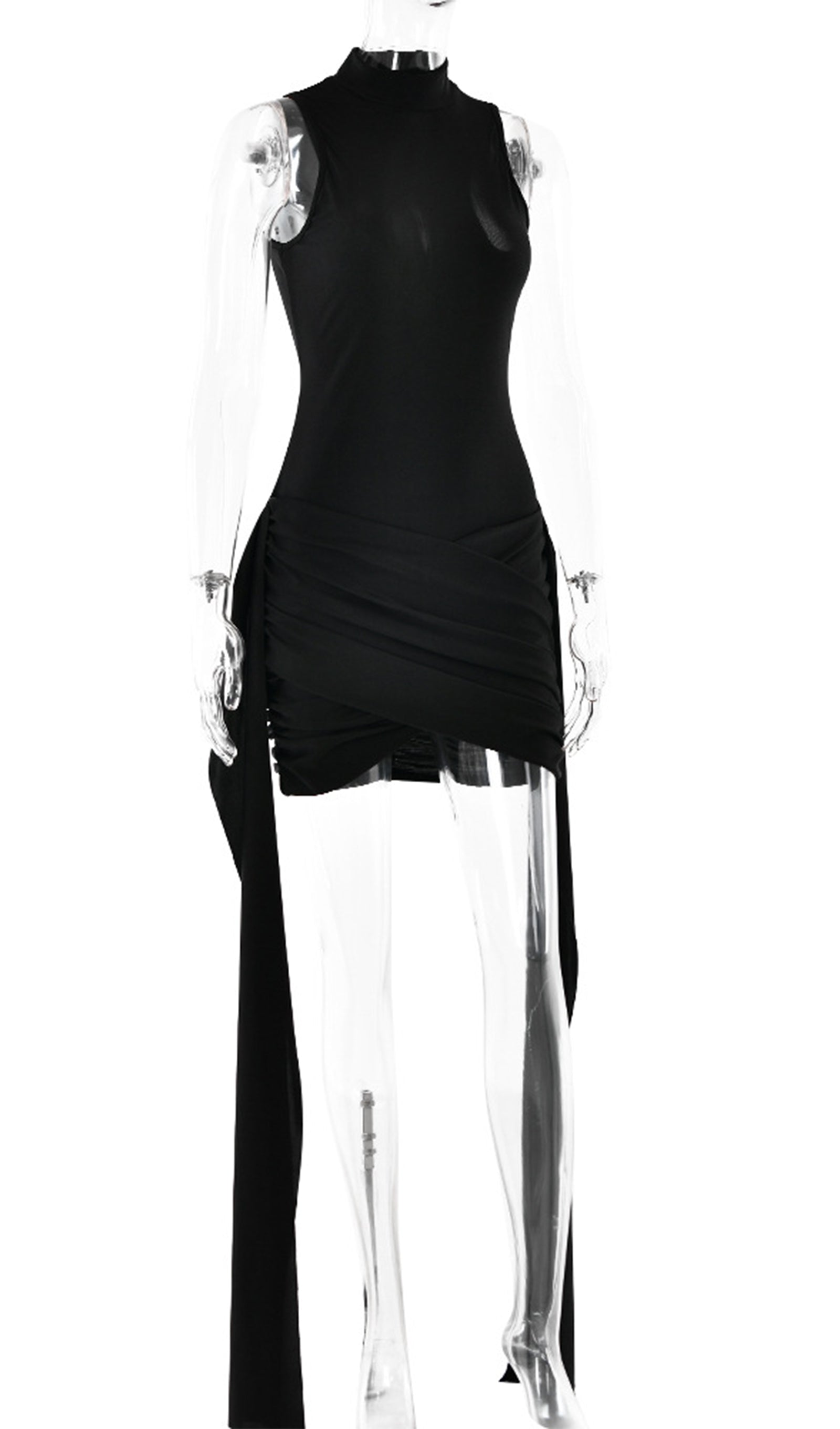 Crafted from a rich, comfortable fabric, it features a high neckline that adds a touch of sophistication. The body-hugging silhouette flatters the figure, while a unique asymmetrical design at the skirt adds visual interest. The dress is accented with long, draped sashes on both sides, creating a sense of movement and drama.